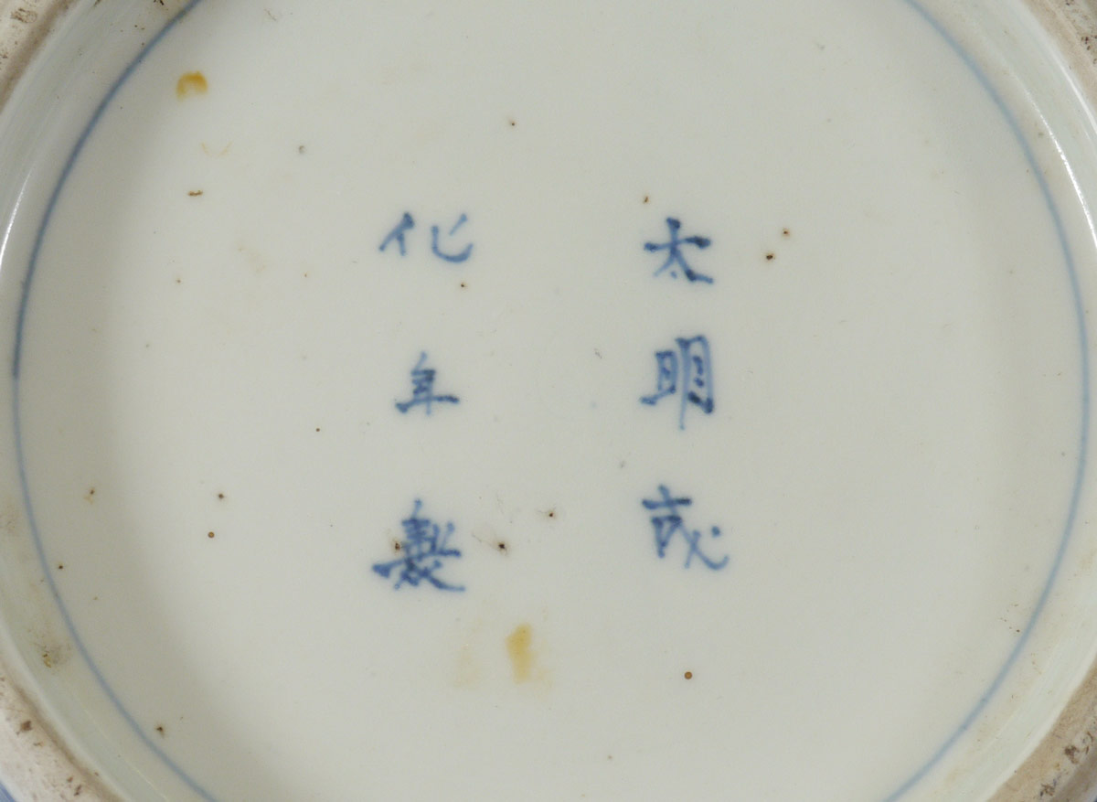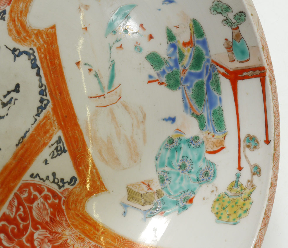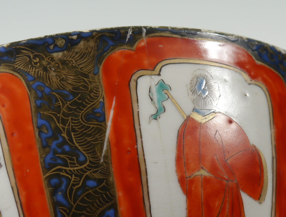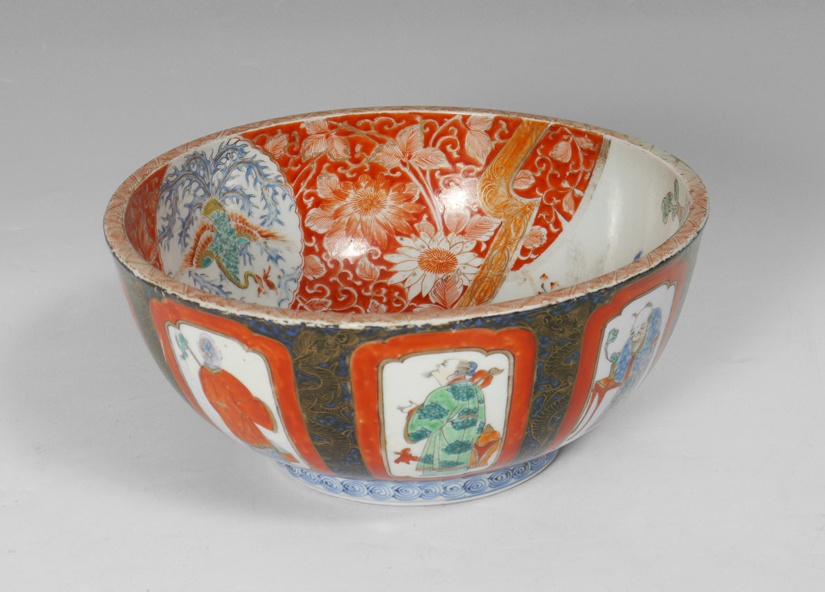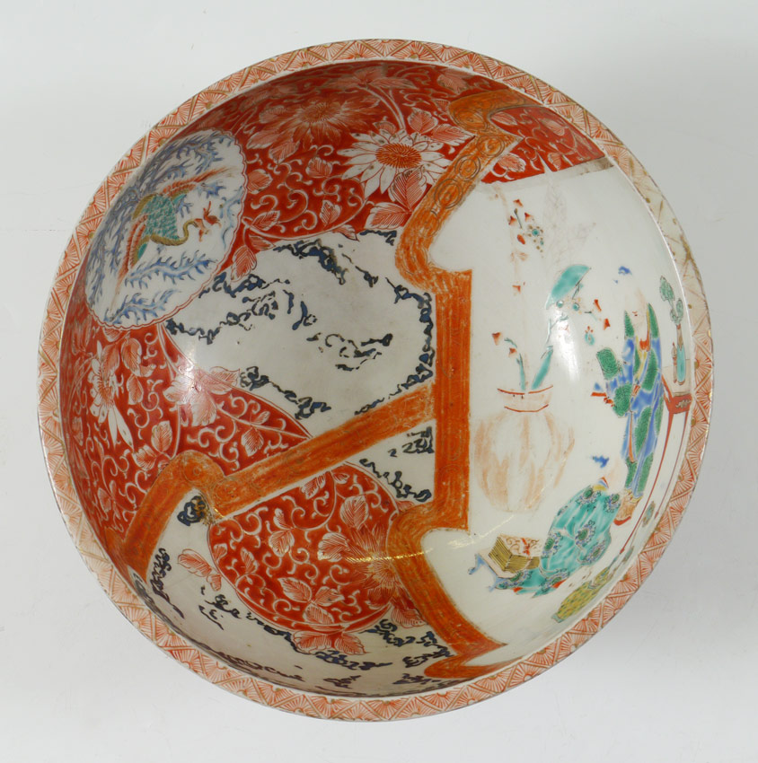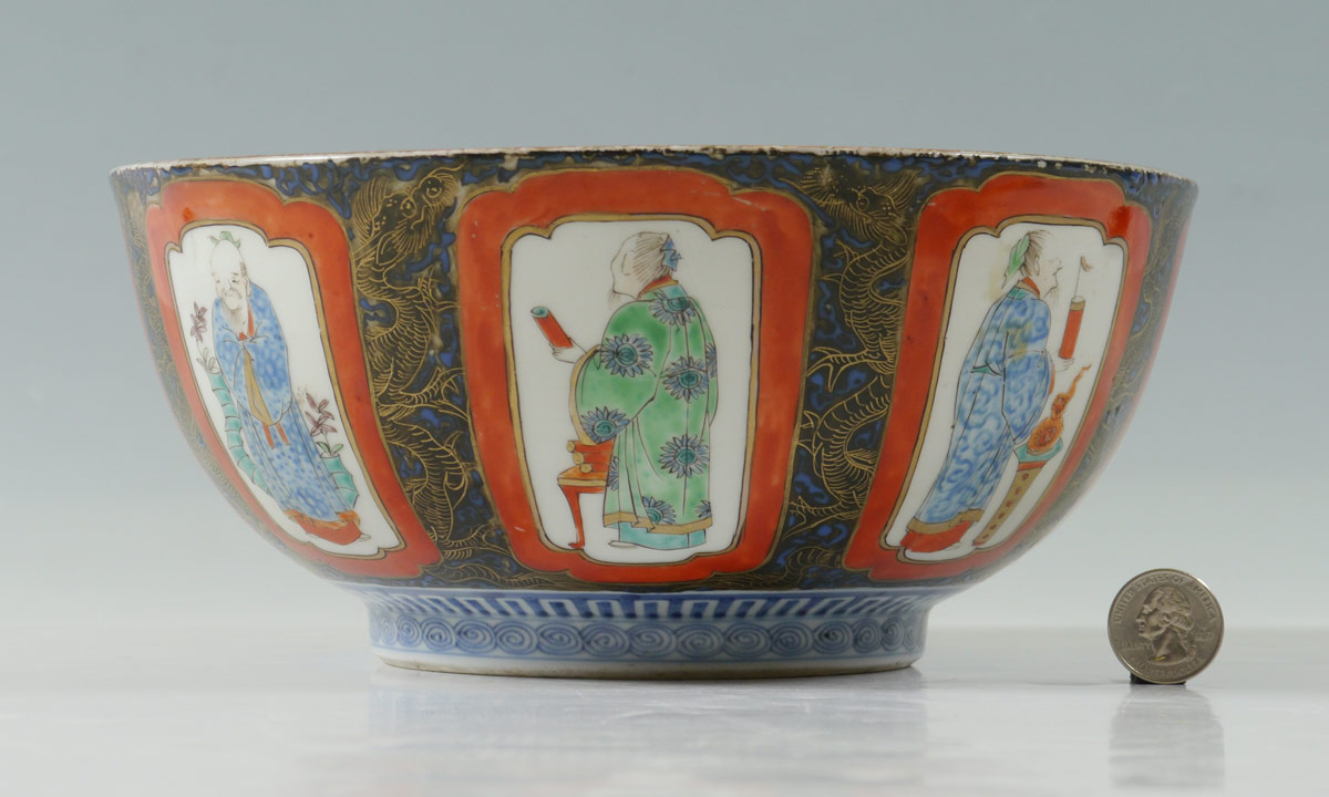 19TH CENTURY SIGNED ARITA IMARI BOWL: Early 19th century with faux Ming Dynasty, Chenghua period Chinese marks, typical of early 19th century Arita pottery, on base. Figures of elders and dragons outside bowl, bird, floral and interior genre scene interior. 4 1/4'' h. x 10''.