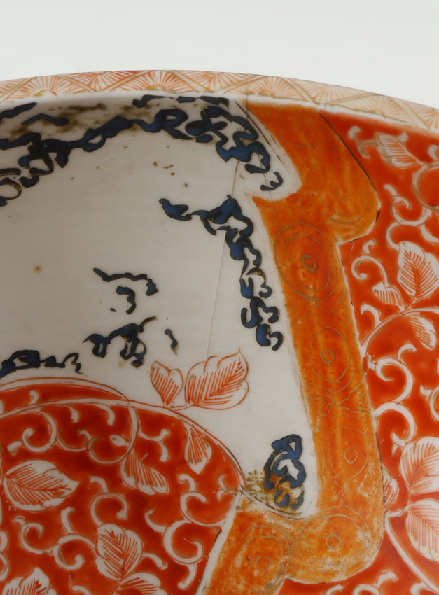 CONDITION: Note loss of decoration interior, 2 cracks on side of bowl from rim.
