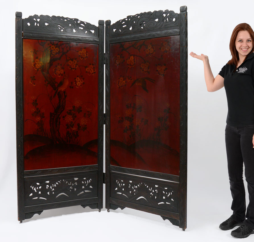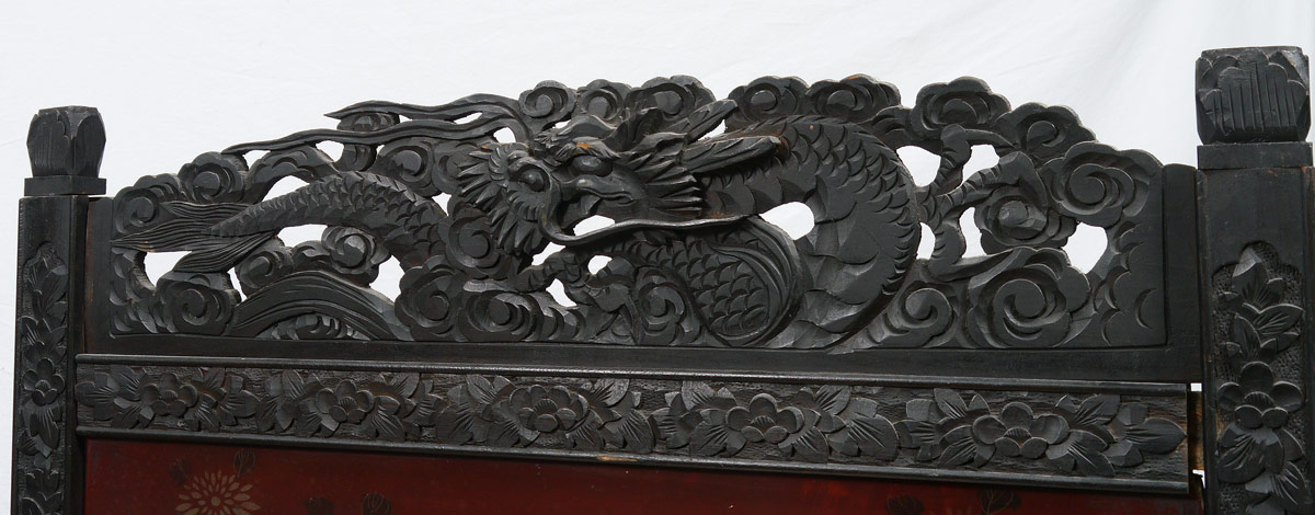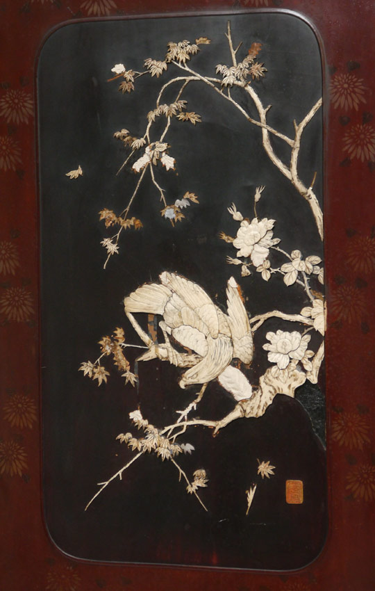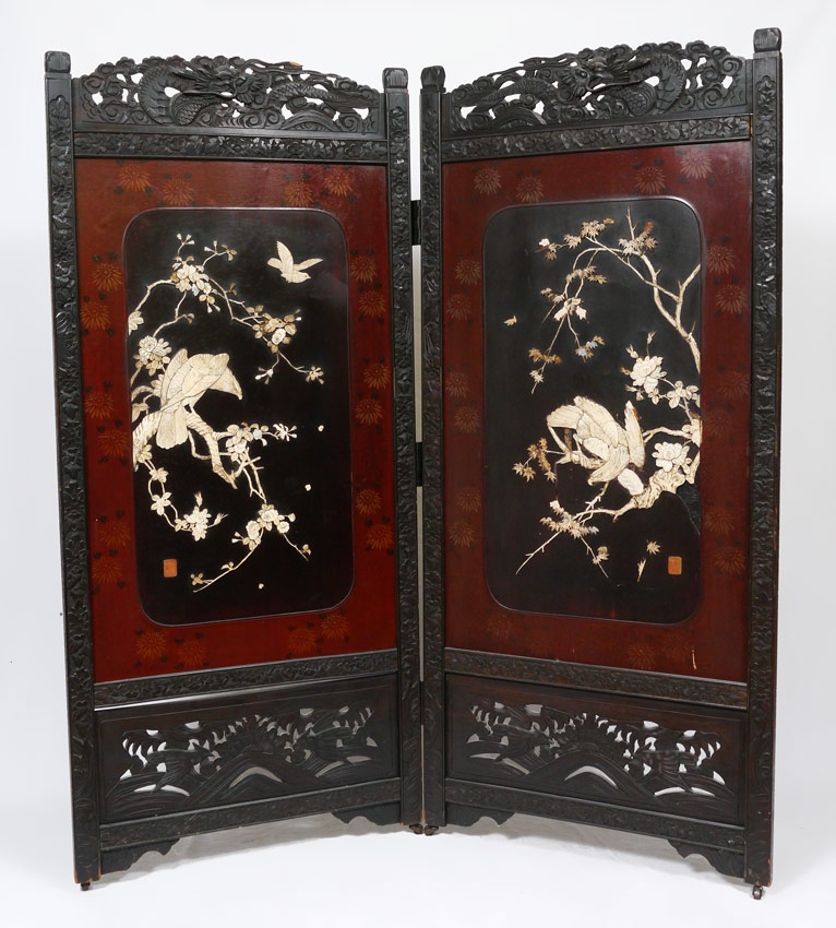 SIGNED INLAID ORIENTAL 2 PANEL SCREEN: Carved dragon motif top panels, one side with composite inlay decoration of birds on branches. Other side red lacquer, also with birds on branches motif. Carved frames and lower panels, all on castors. Each panel 72 1/4'' h. x 33'' x 1 1/4''.