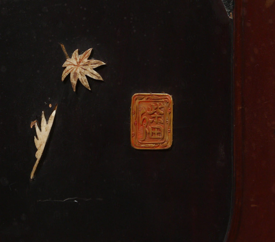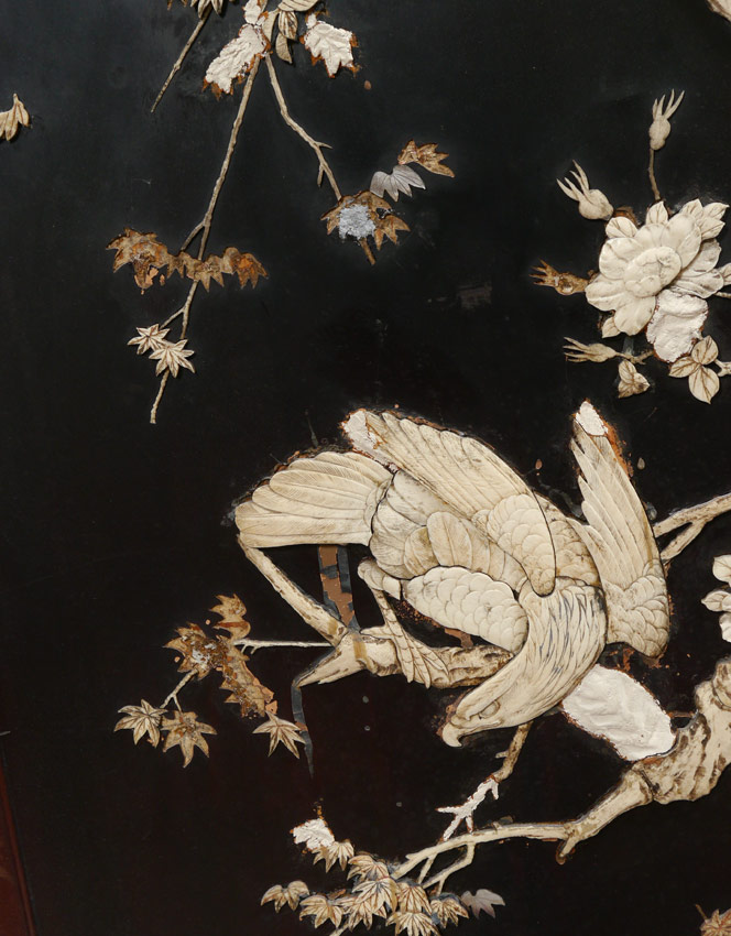 CONDITION: Repairs to and missing inlay, chips to frame and top, craquelure to lacquer.