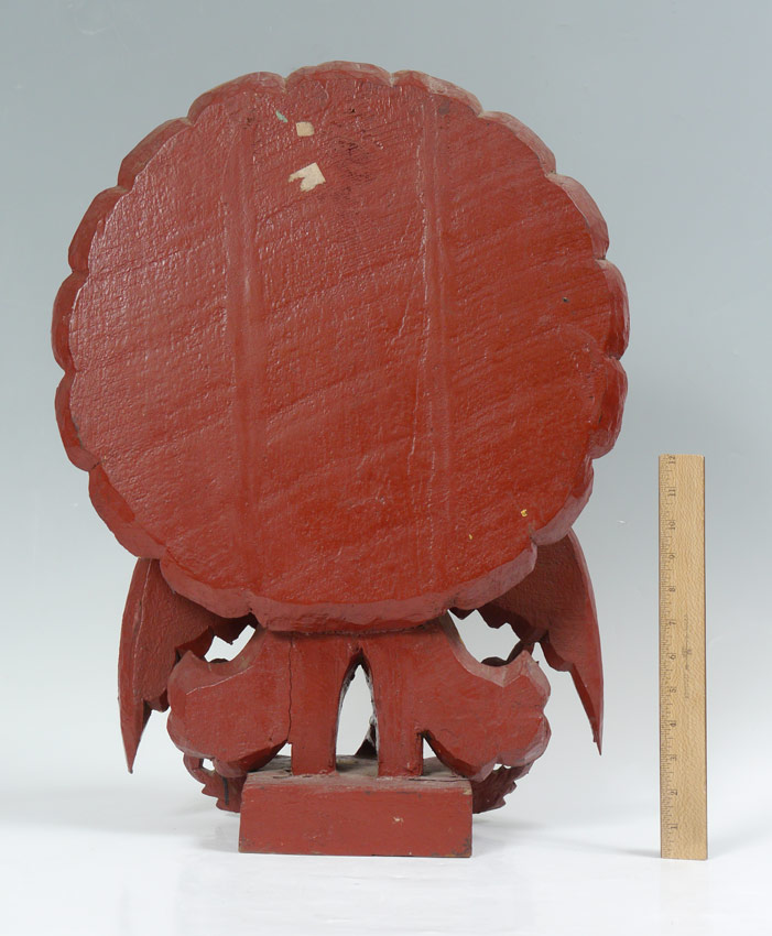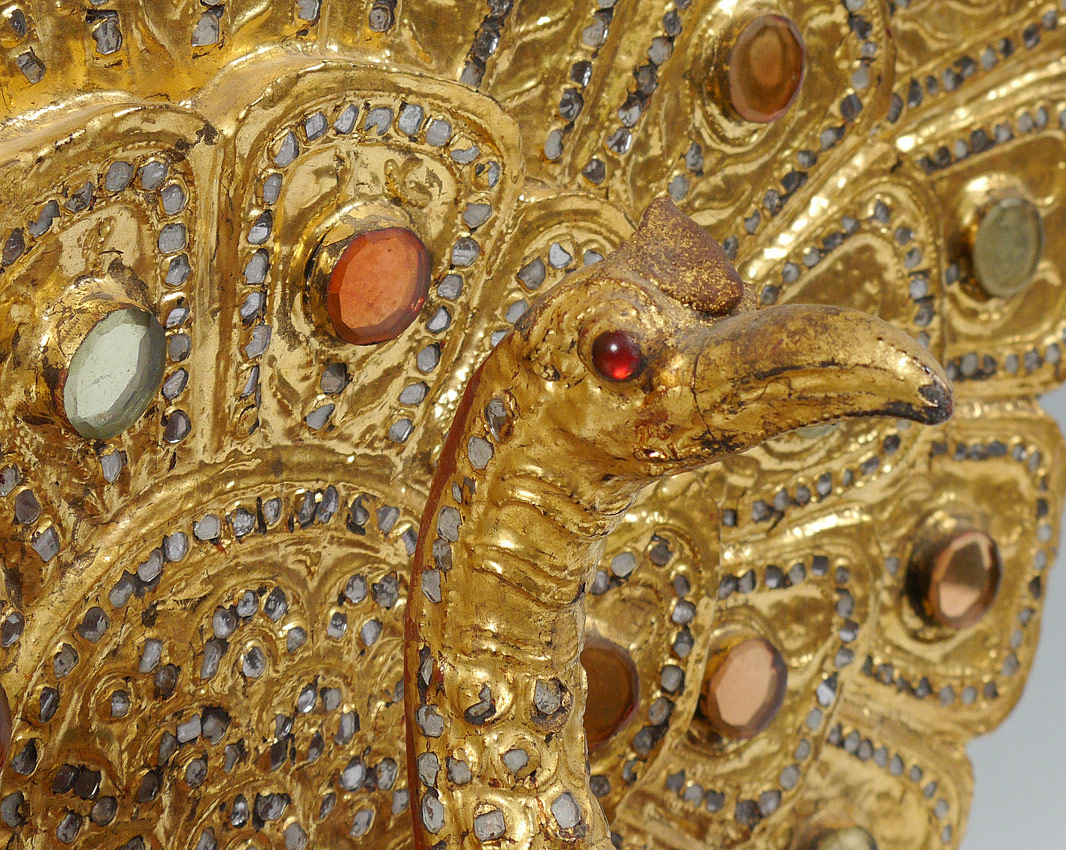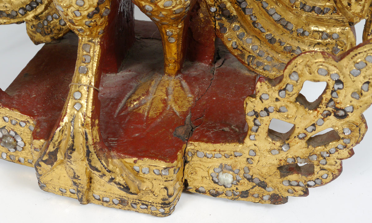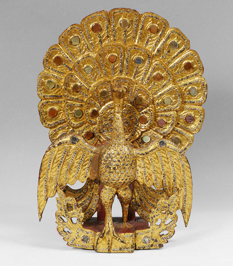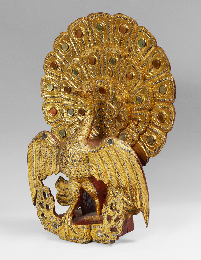 THAI CARVED GILT WOOD PEACOCK: Carved figural peacock with inset and applied pieces of glass and mirror. Actual age unknown. Measures 24 3/4'' h. x 17'' x 7''.