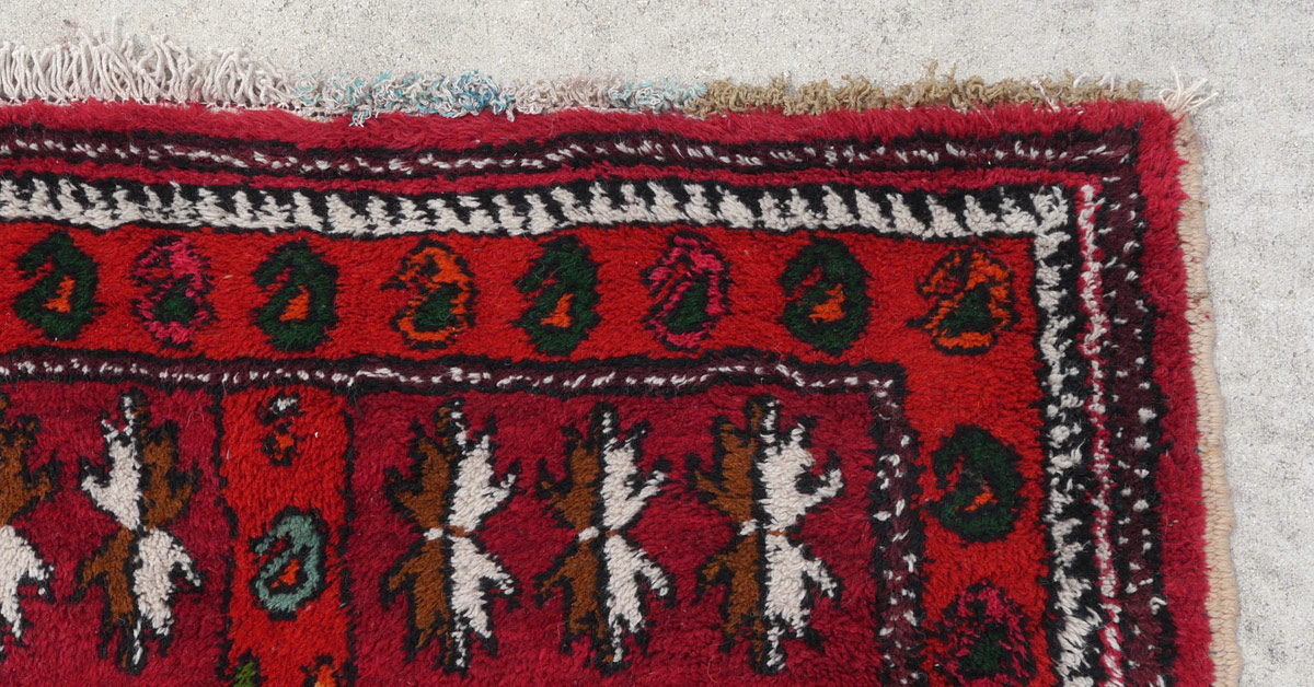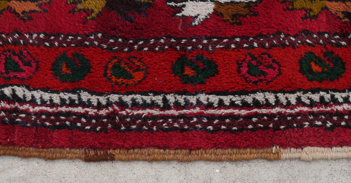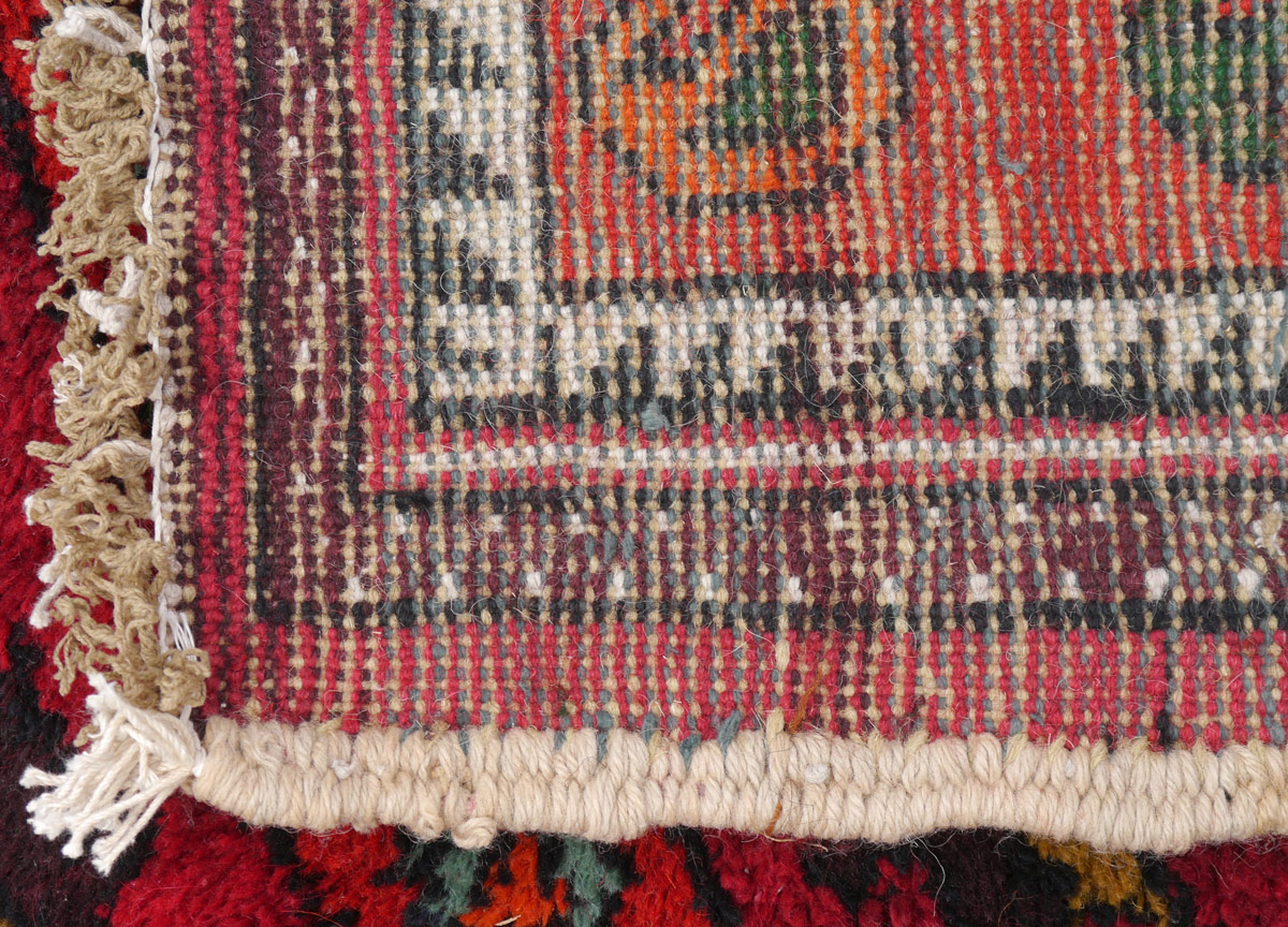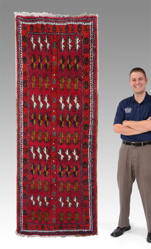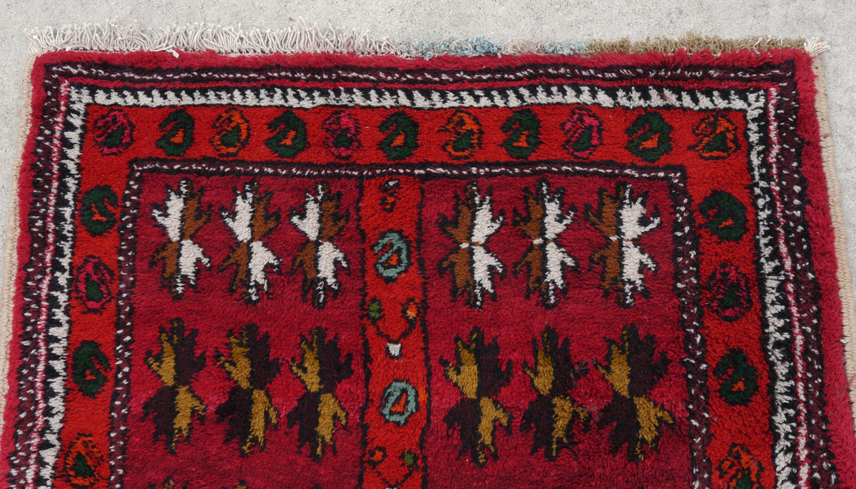 APPROX. 25 TO 40 YR. OLD MOROCCAN HAND KNOTTED WOOL RUG, 3' 5'' X 9' 6'': This brightly colored rug has a red field that is divided down the center by a red band that is like the outer borders of the rug. The two sides are covered with rows of small geometric flower forms with different color combinations in each row. The central band and the borders have small botehs or paisleys. This is another rug type that decorators like to use with more modern styles. Condition is good.