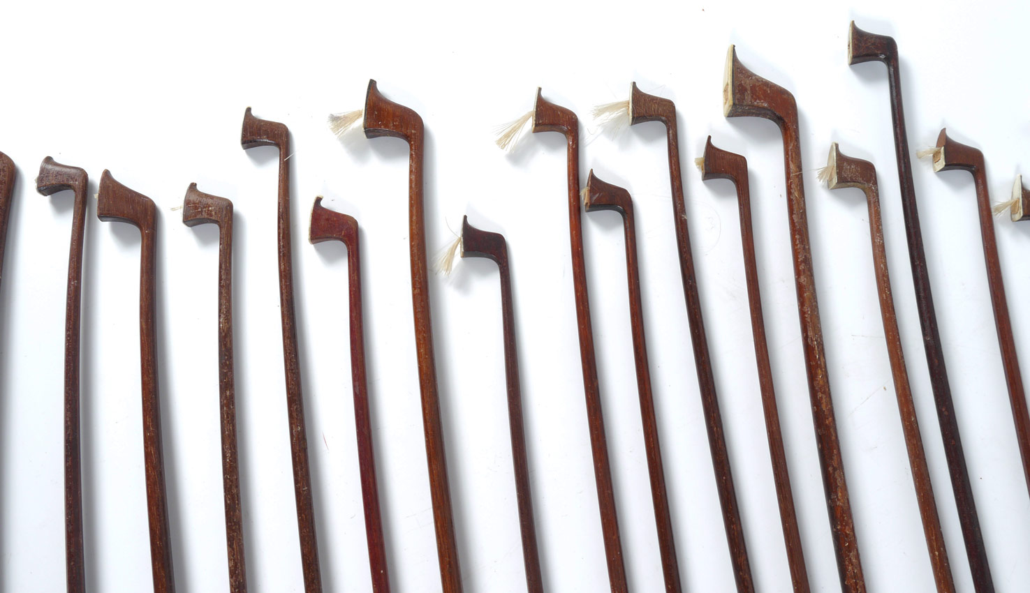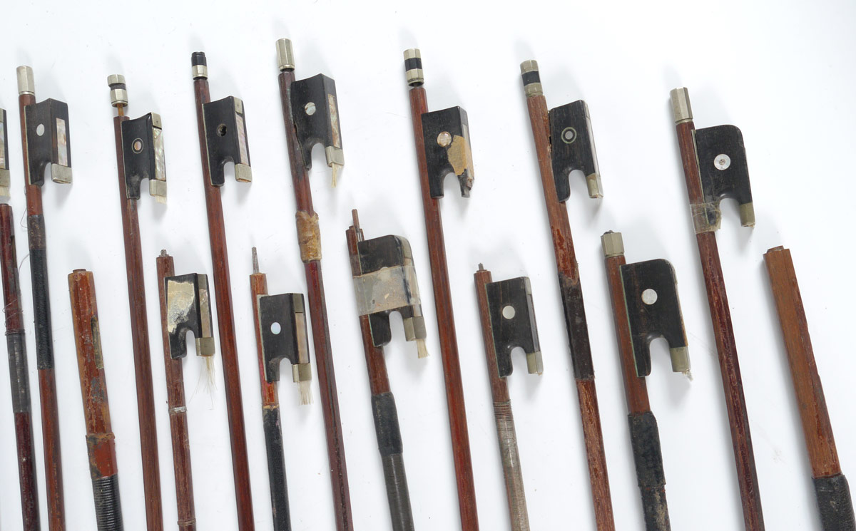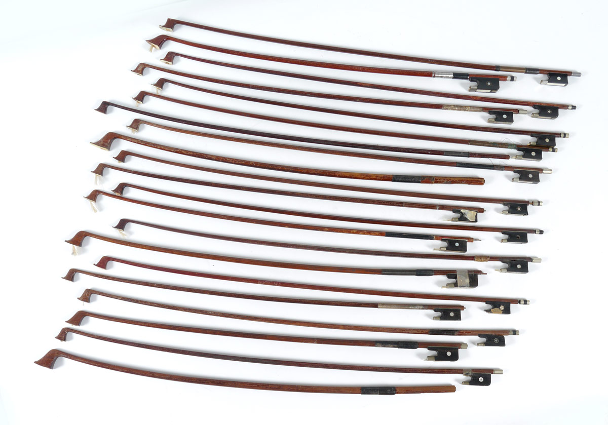 COLLECTION OF 21 VIOLIN BOWS: All in need of hair, many in need of repair. Makers to include Glasser, Imitation de Tourte, Sivori, and 18 others.