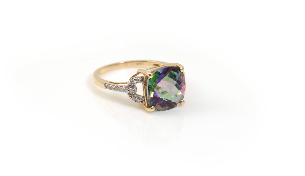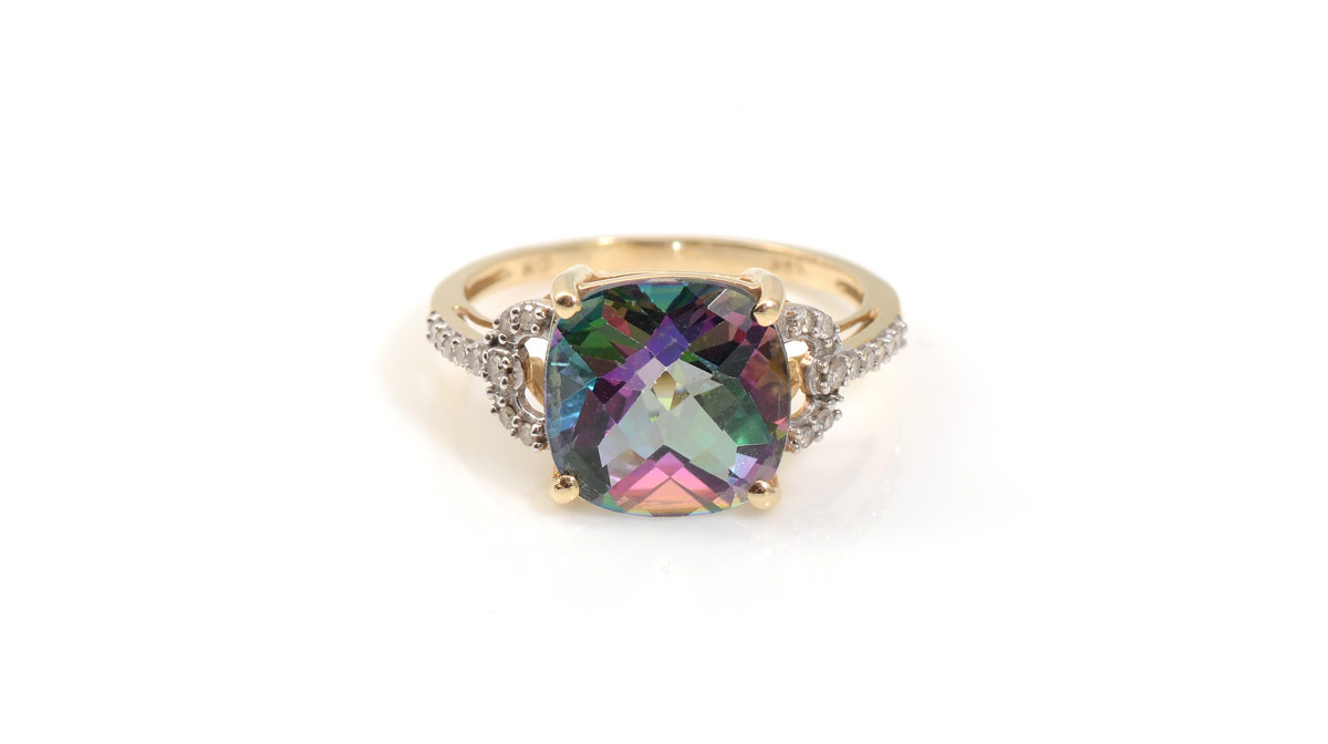 MYSTIC TOPAZ AND DIAMOND RING: 14K yellow gold ring contains one checkerboard cut ''mystic'' topaz. WEIGHT: 3.00 Ct. Approx. 20 round single cut diamonds. WEIGHT: .10 Ct. Approx. Rated SI in clarity and H-I in color. The topaz and diamonds are prong set. Weight: 2.8 grams. Size: 6