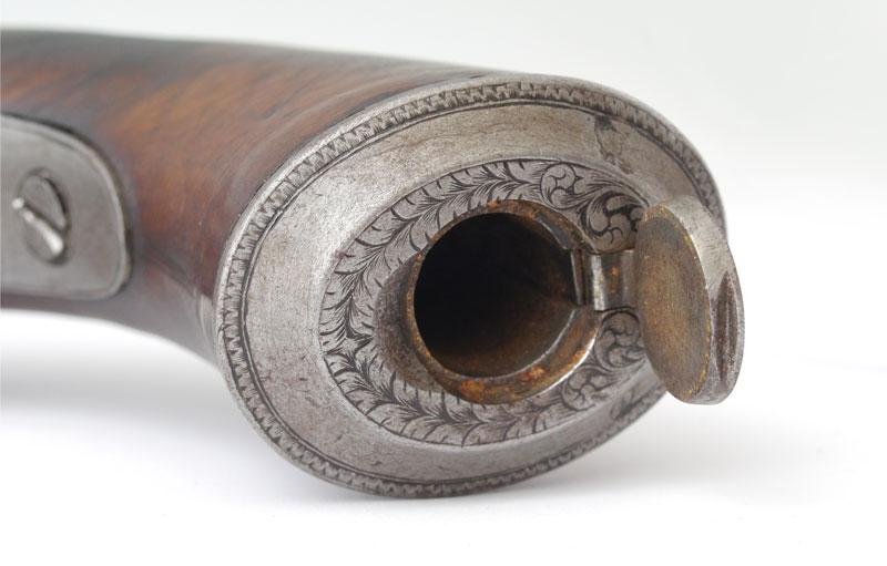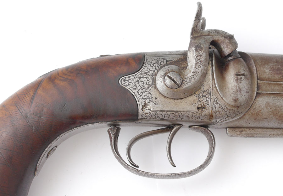 19TH CENTURY OVER UNDER PERCUSSION PISTOL GROUPING: 3 pieces total to include 1) Engraved mid century over under double barrel percussion pistol, no visible proof marks, marked on top of barrel John H B(R)obin. Engraved frame, butt plate, trigger guard. 6'' barrels marked on top , 12 1/4'' l. overall Burl walnut single piece grip with hinged cap holder in butt plate. Missing ram rod. Tight action. 2) Leather holster and belt. Gun fits in holster like a glove. 3) Hard leather powder flask with stopper, 5 5/8'' long.