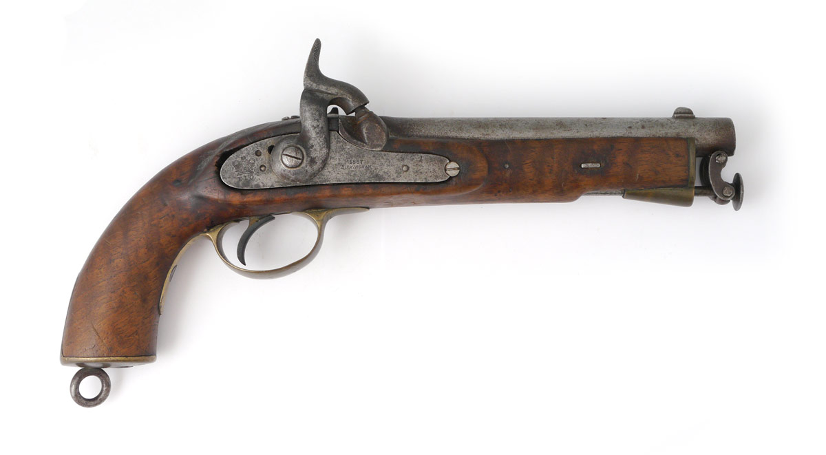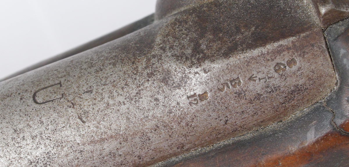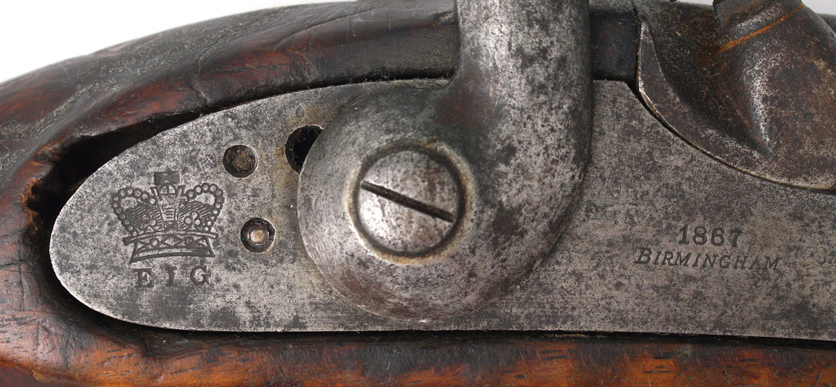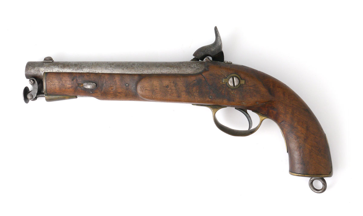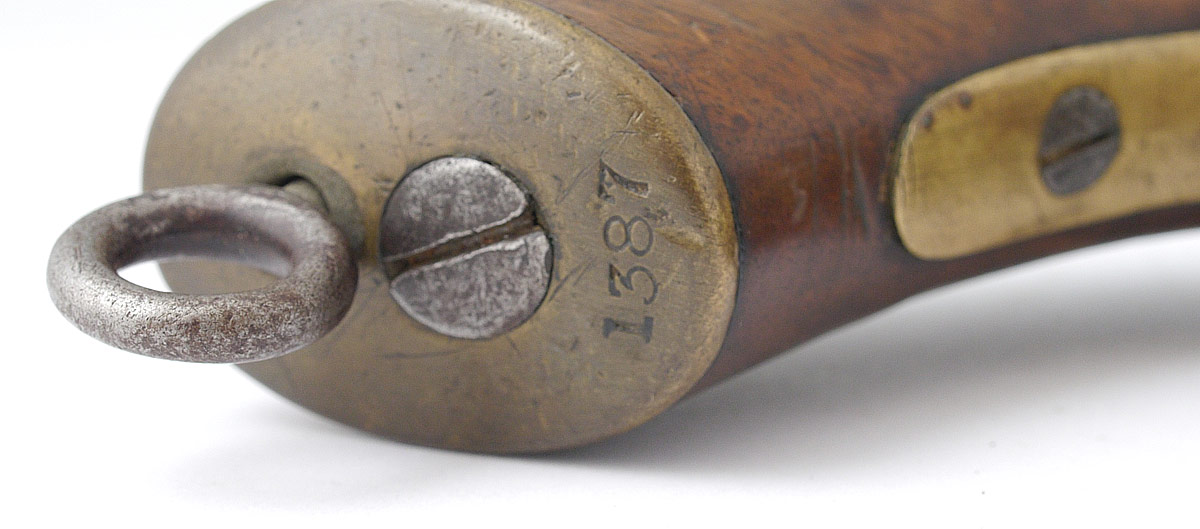 1867 EAST INDIA COMPANY TRADE PERCUSSION PISTOL: .65 caliber smooth bore percussion pistol. Lockplate marked with crown over EIG, 1867, Birmingham. Wood stock with capture rod, traces of cartouche on left side of stock. Brass butt plate with lanyard ring, serial number 1387. 8'' barrel, 13 3/4'' overall.