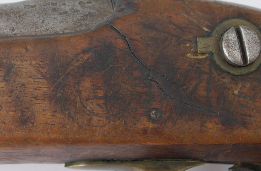 CONDITION: Split left side of stock, pitting and age stain appropriate for age. Burchard Galleries does not endorse the firing of ANY antique firearm.