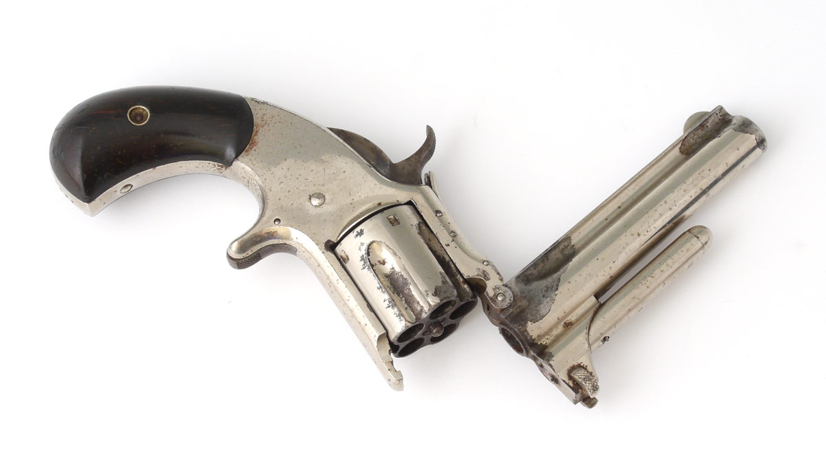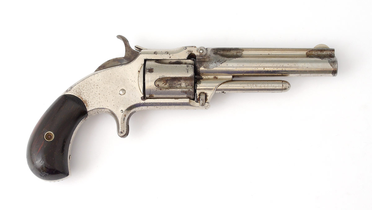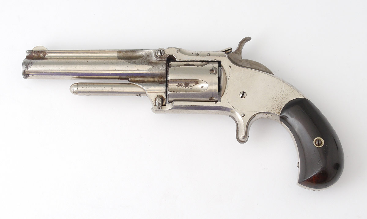 SMITH & WESSON MODEL 1 1/2 2ND ISSUE REVOLVER: .32 caliber, nickel finish pistol, 3 1/2'' barrel marked Smith & Wesson, Springfield, Mass., and 3 patent dates. Serial number 88377, bird head butt with rosewood grips. Tight action. Overall 7 5/8''.
