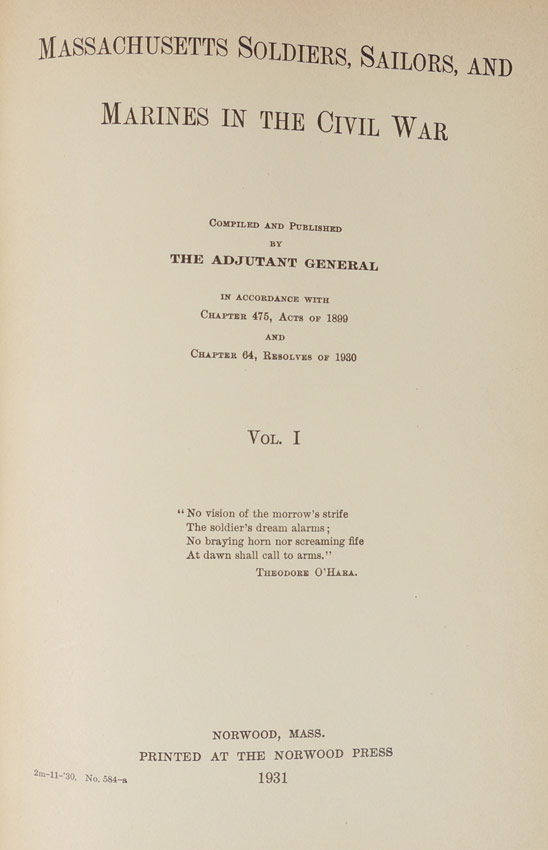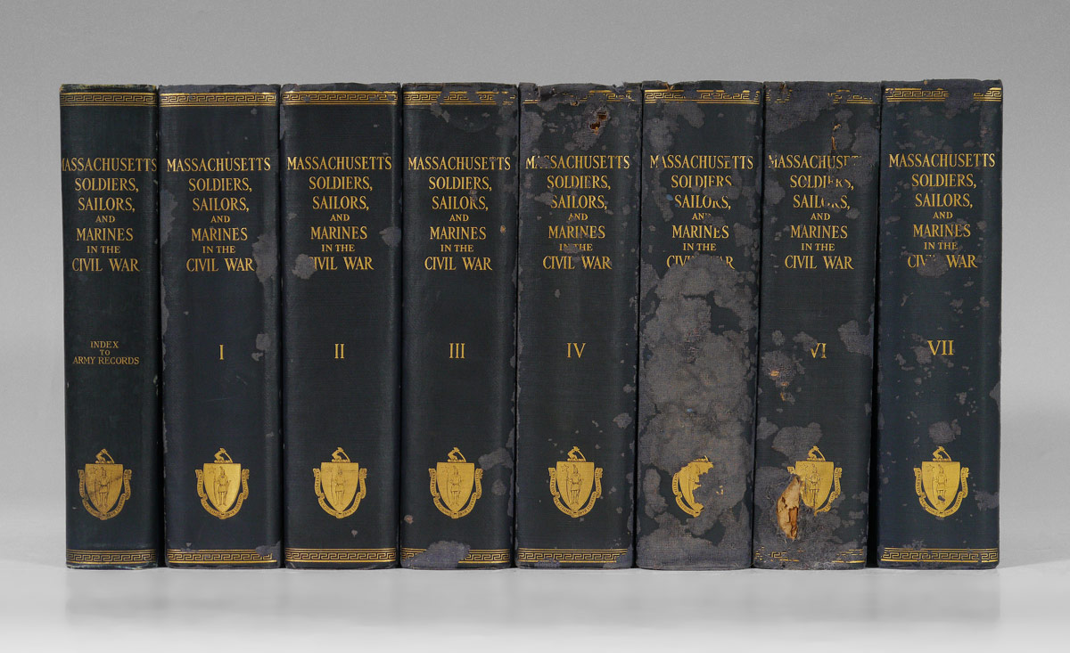 8 VOLUME MASSACHUSETTS CIVIL WAR SOLDIERS BOOKS: 8 volumes ''Massachusetts Soldiers, Sailors and Marines in the Civil War'' Complied and published by the Adjutant General, Norwood Press, 1931-1933. 7 complete volumes and an index volume. Blue cloth covers. 10 1/2'' x 7'' x 2 1/2''.