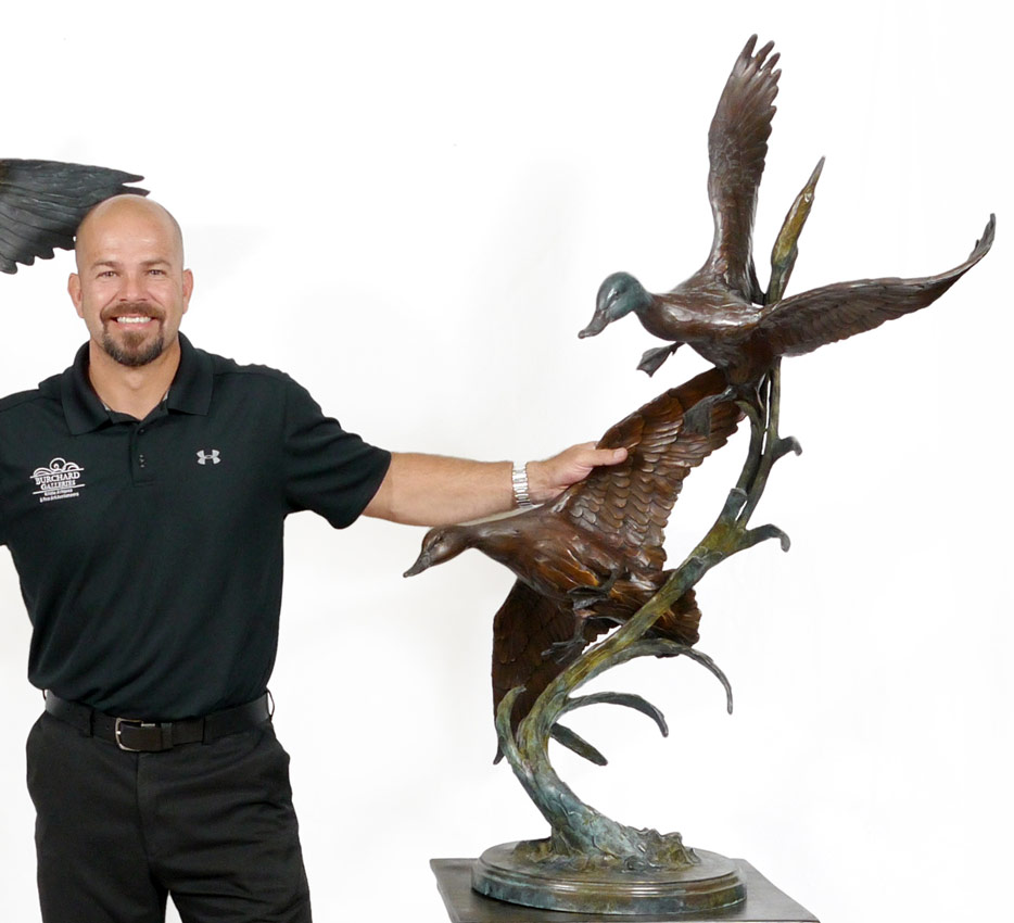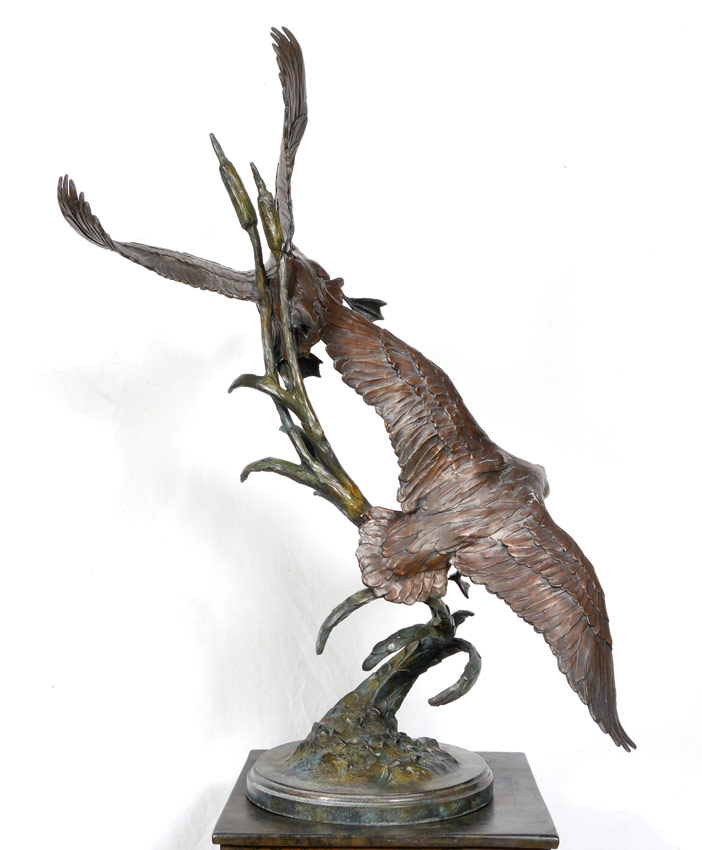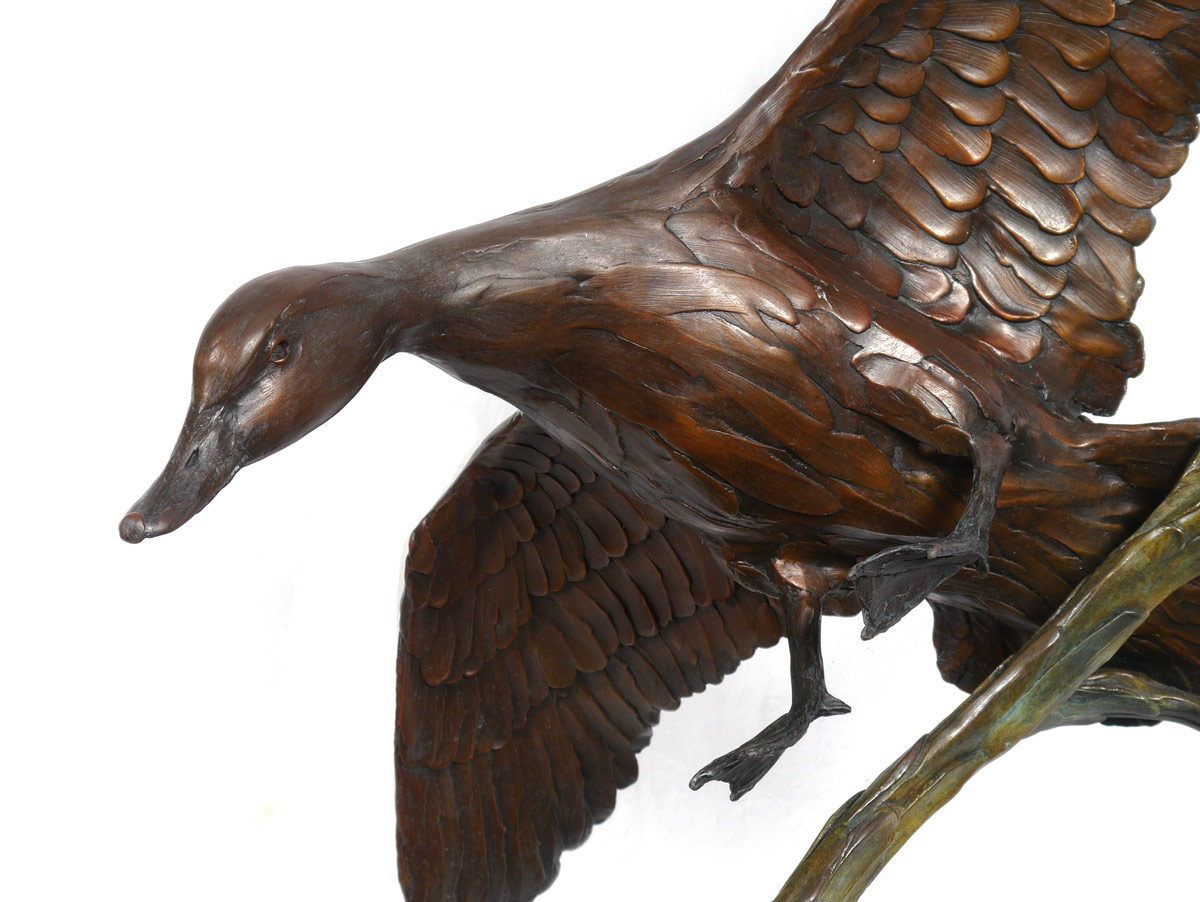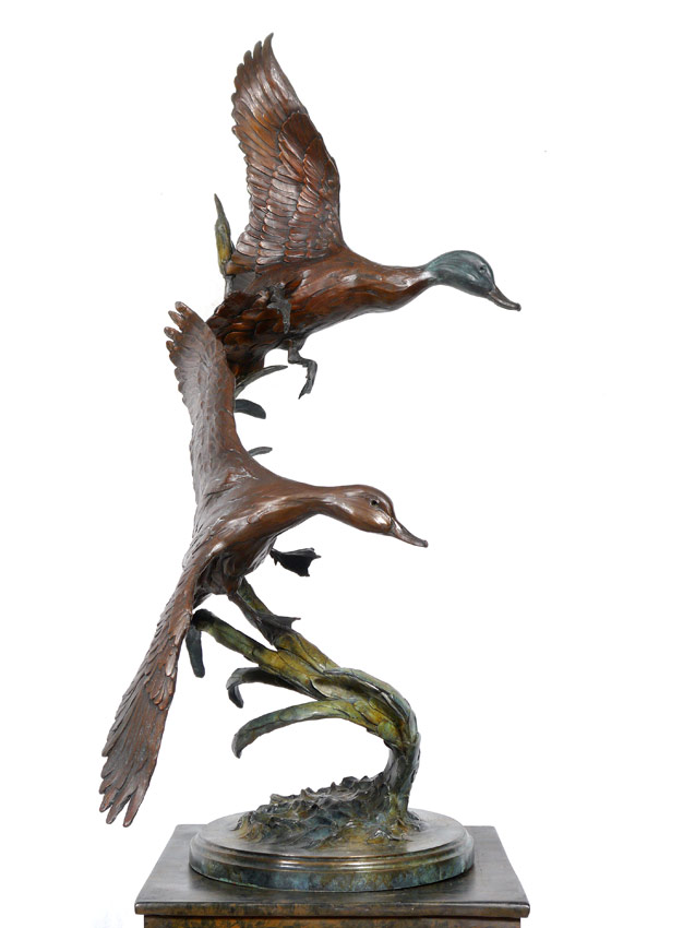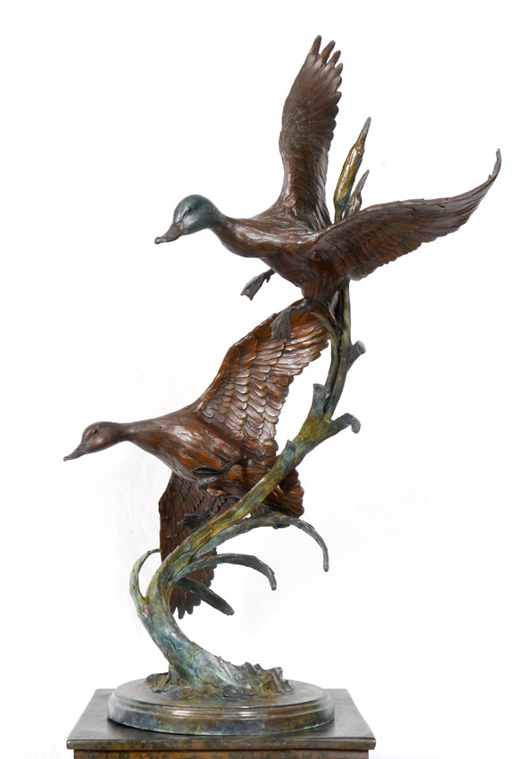 SMITH, Geoffrey L., (American, 20th/21st Century): Mallards in Flight, Patinated Bronze, 48'' h., approximately 24'' w., base is bronze with patina, base is a beveled bronze with incised signature, dated '95, #'d 35/48.