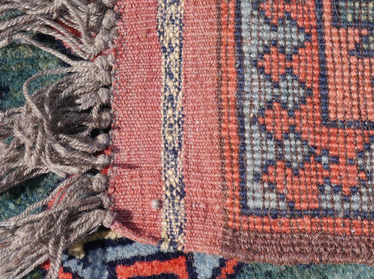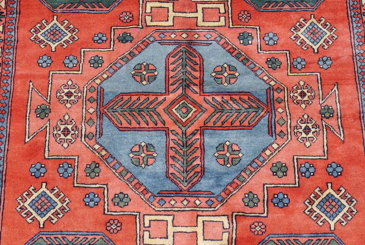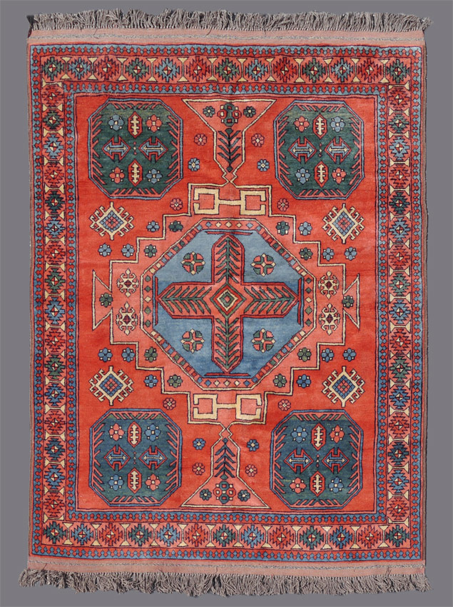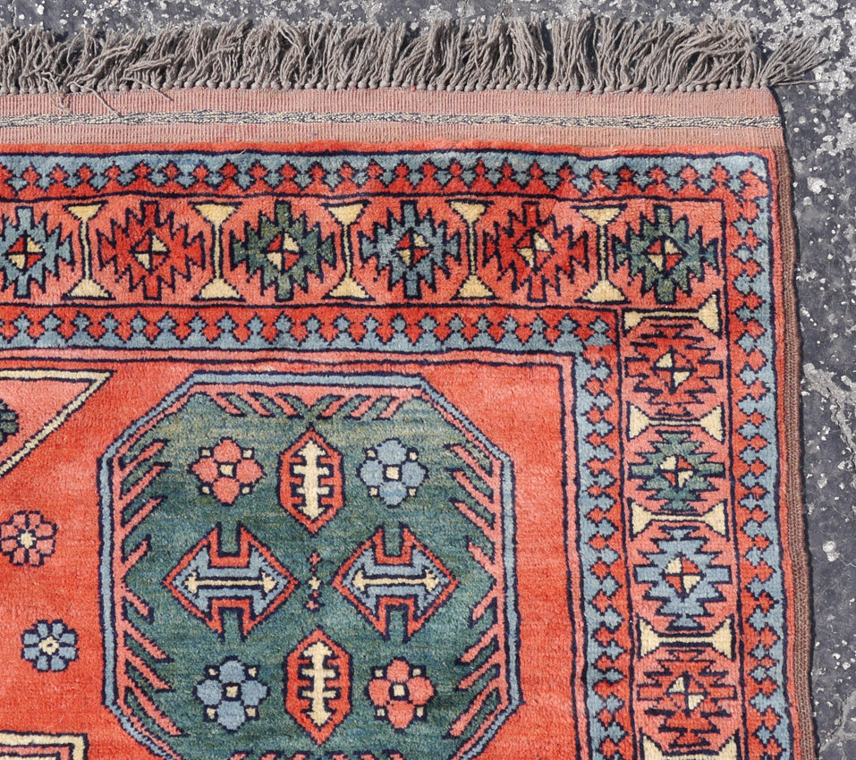 APPROX. 25 TO 40 YR. OLD TURKISH HAND KNOTTED WOOL RUG, 5' x 6': This vibrantly colored and designed rug has five rounded medallions done in shades of blue and aqua on a deep salmon colored field that could be a Bergama area rug. The designs are well drawn and the colors are harmonious making for a good looking rug and work of art that can be walked on. Condition is good.