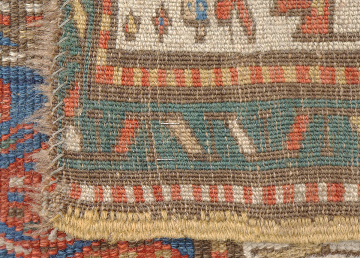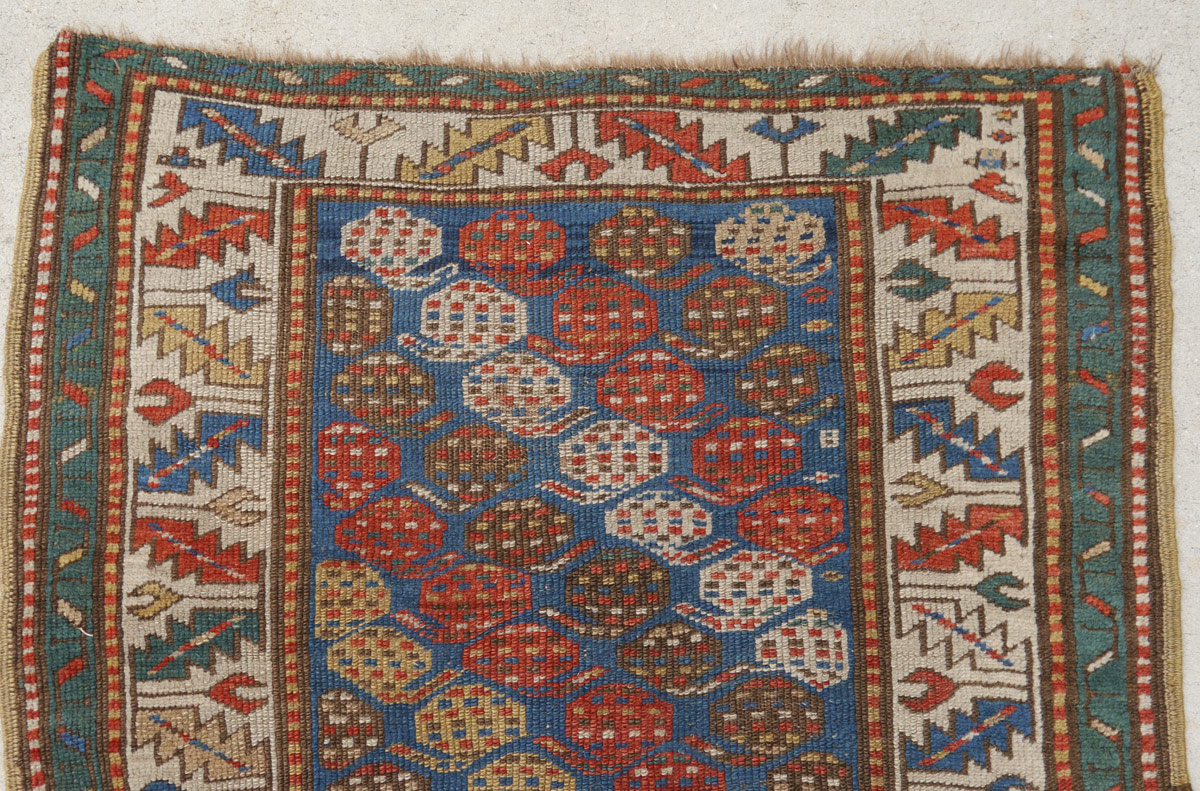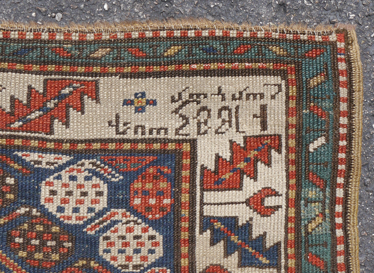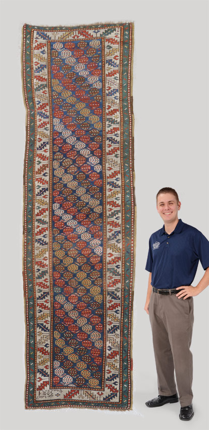ANTIQUE CAUCASIAN KARABAGH DATED HAND KNOTTED WOOL RUNNER, 3' 1'' x 10' 3'': This striking antique Caucasian rug has an interesting design of diagonal bands of round-bodied botehs, or paisleys with spots of other colors within each one. They rest on a medium blue field and are in colors of pale yellow, red, aqua, beige, and brown. The serrated leaf and wine glass motif of the main border are done in the same colors but on a white ground. Best of all, this rug has an inscription and is dated 1883. This makes this rug a true collector's dream. It would be a good addition to any collection.
