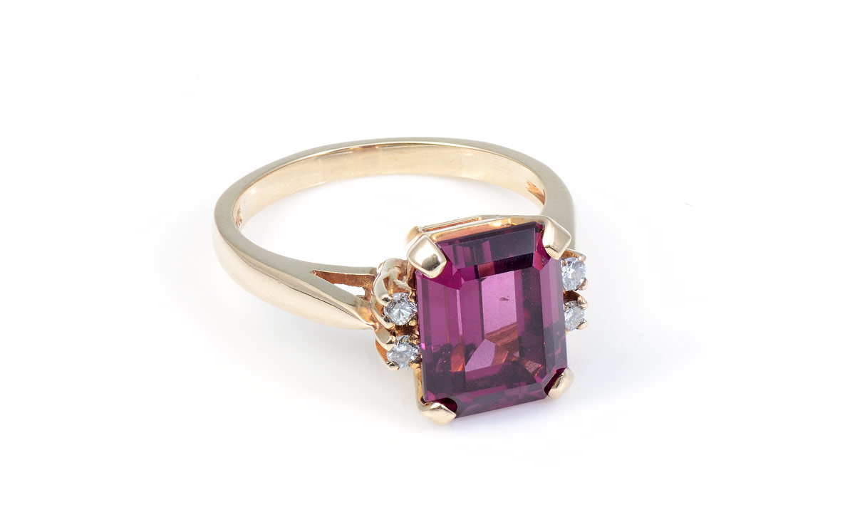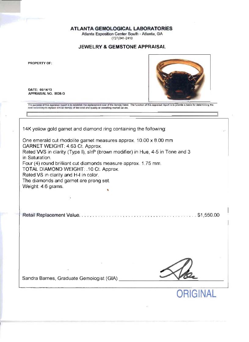 GARNET AND DIAMOND RING: 14K yellow gold ring centers an approx. 4.63 Ct emerald cut rhodolite garnet of VVS clarity. Accented with 4 VVS diamonds totaling approx. .10 Ct. All stones are prong se. Size 6. Weight 4.6 grams. Sold with current Atlanta Gemological GIA graduate's appraisal for $1,550.
