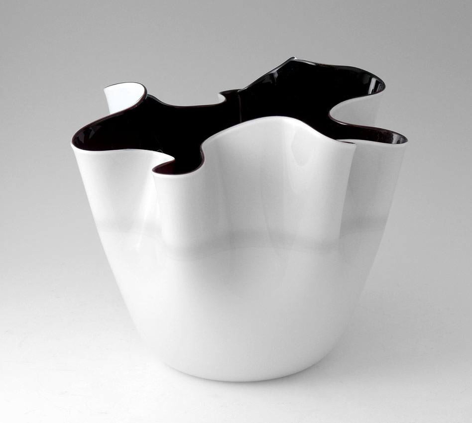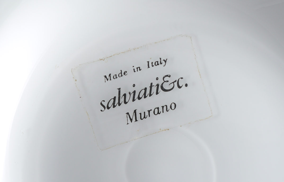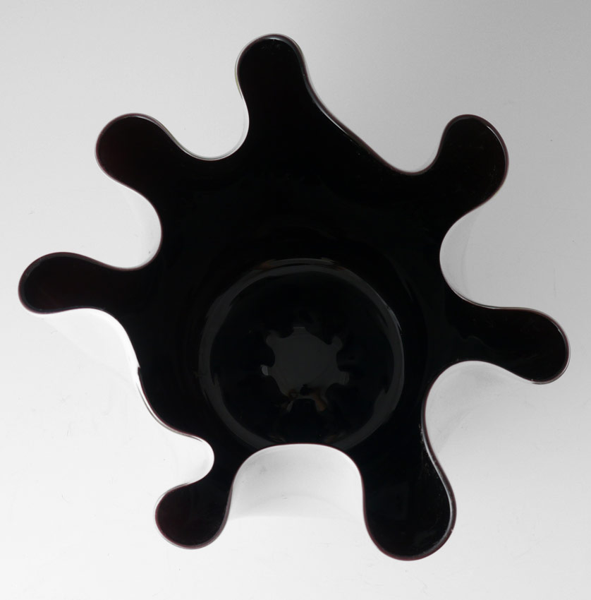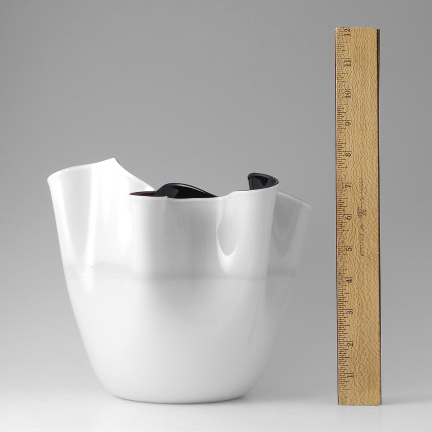 SALVIATI MURANO ART GLASS VASE: Free form vase, purple glass interior, white glass exterior. Original Salviati & C. Murano sticker on base. 7 7/8'' h. x 9''.