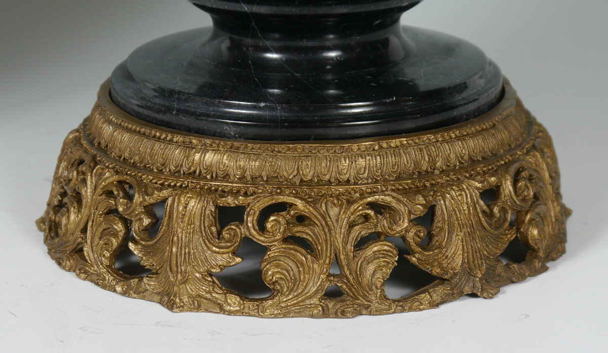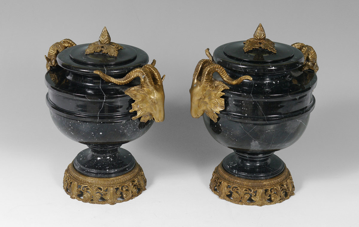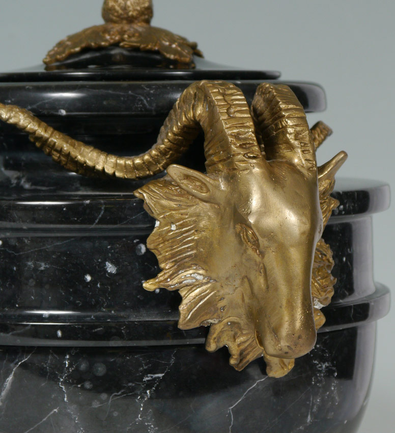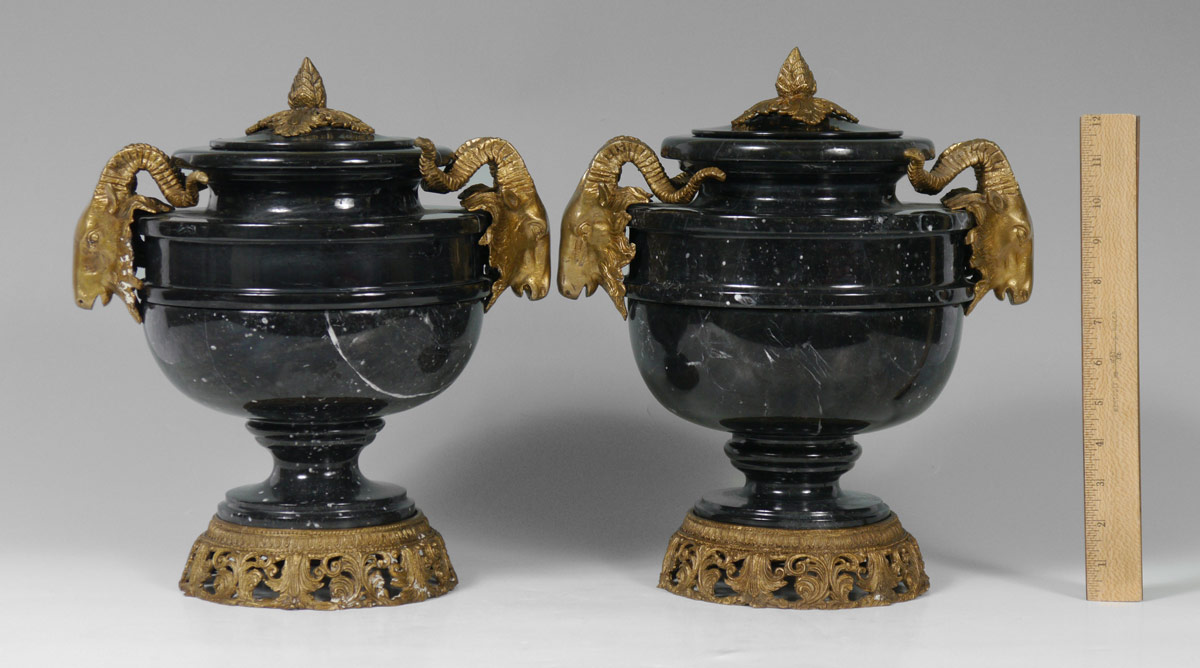 PAIR RAMS HEAD MASQUERON COVERED MARBLE URNS: Black marble urns, lids with cast finial. Body of urns with applied cast ormolu rams head masons, pierced metal base. Overall 13 1/2'' h. x 12'' dia.
