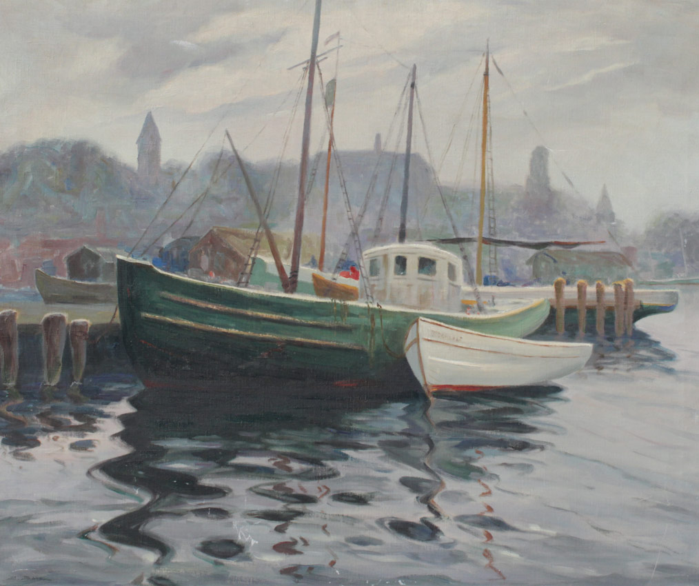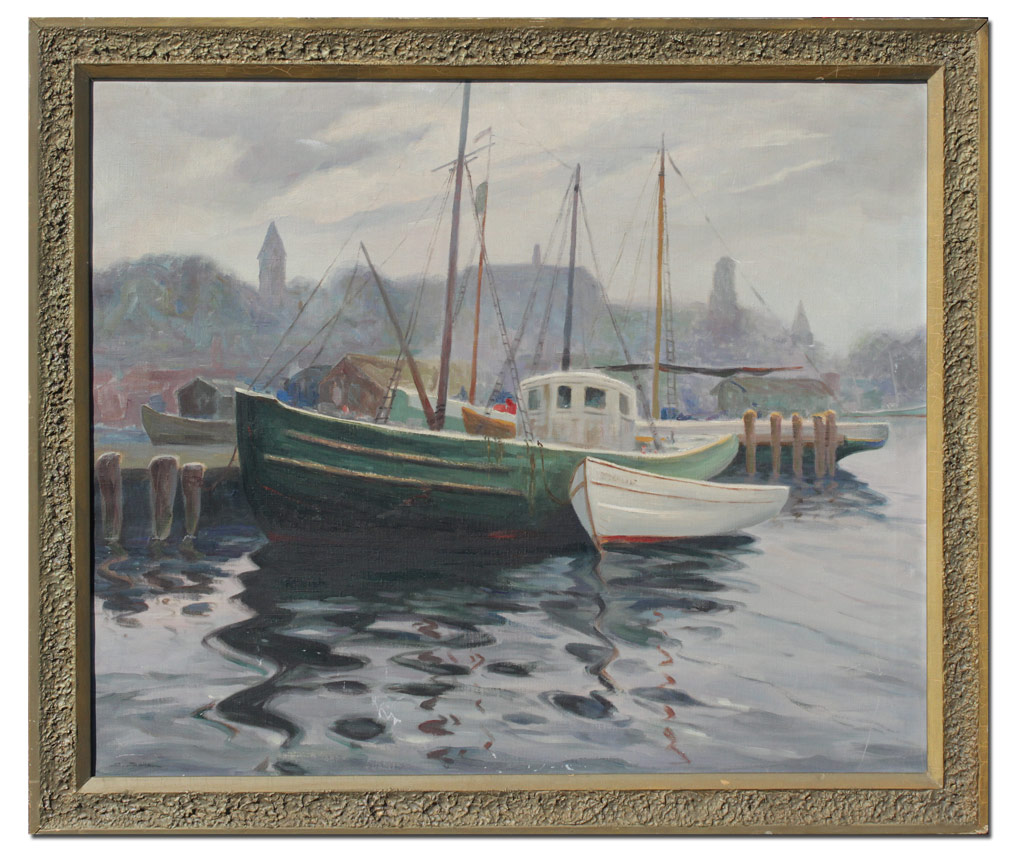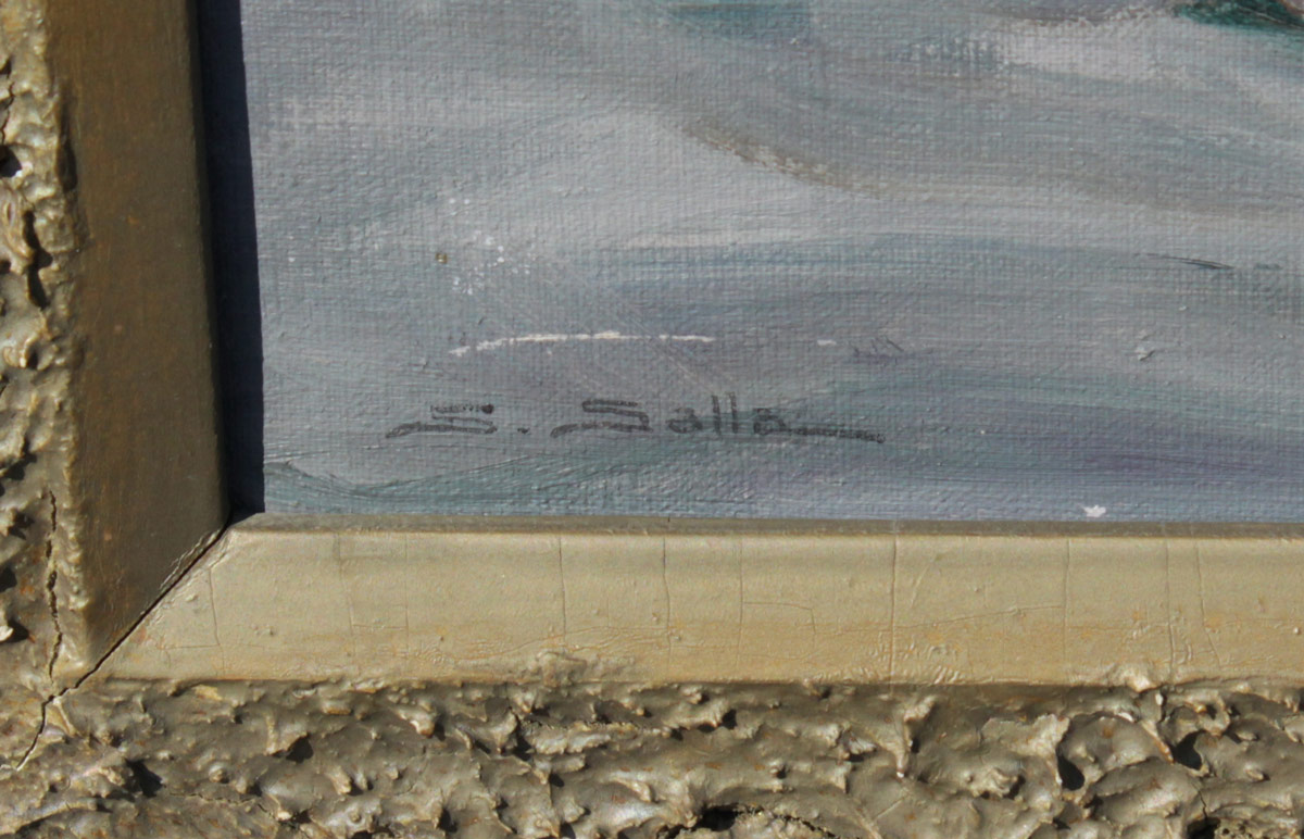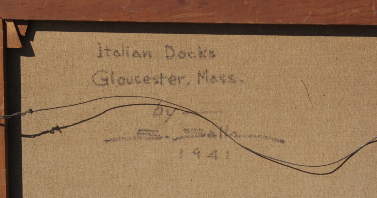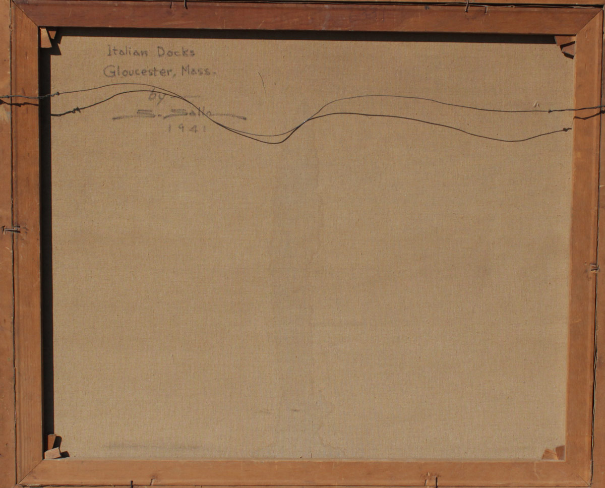 SALLA, Salvatore, (American, 1903-1992): Italian Docks, Gloucester, Mass., Oil/Canvas, 30'' x 36'', signed lower left, signed titled and dated verso 1941, original gilded and painted wood frame with wear, 34 1/2'' x 40 1/2''.