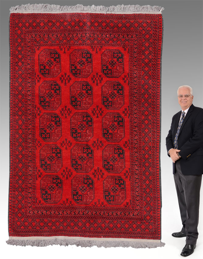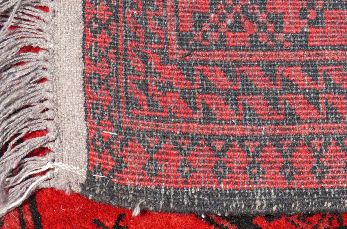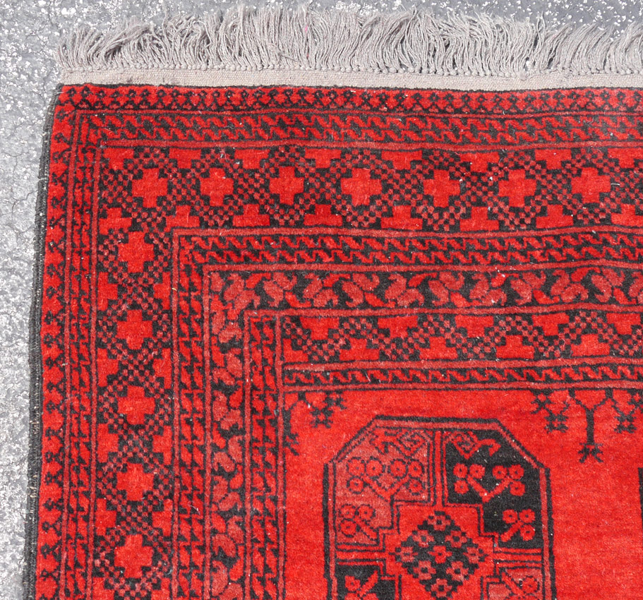 APPROX. 25 TO 40 YR. OLD AFGHAN BOKHARA HAND KNOTTED WOOL RUG, 6'7'' x 9': This rug has a traditional Bokhara design and colors as woven in the Afghan region. The red field is covered with large elephant foot shaped guls in black and reds that alternate with small black guls. The multiple small borders are done in the same colors. This is a very masculine rug and would look good in an office or a ''man-cave''. Condition is good.