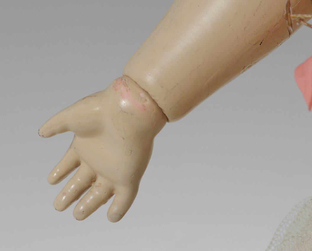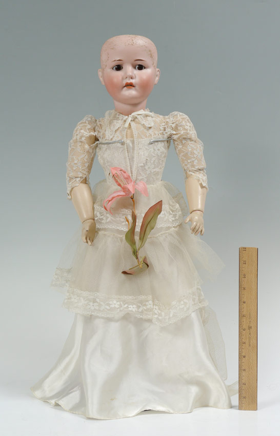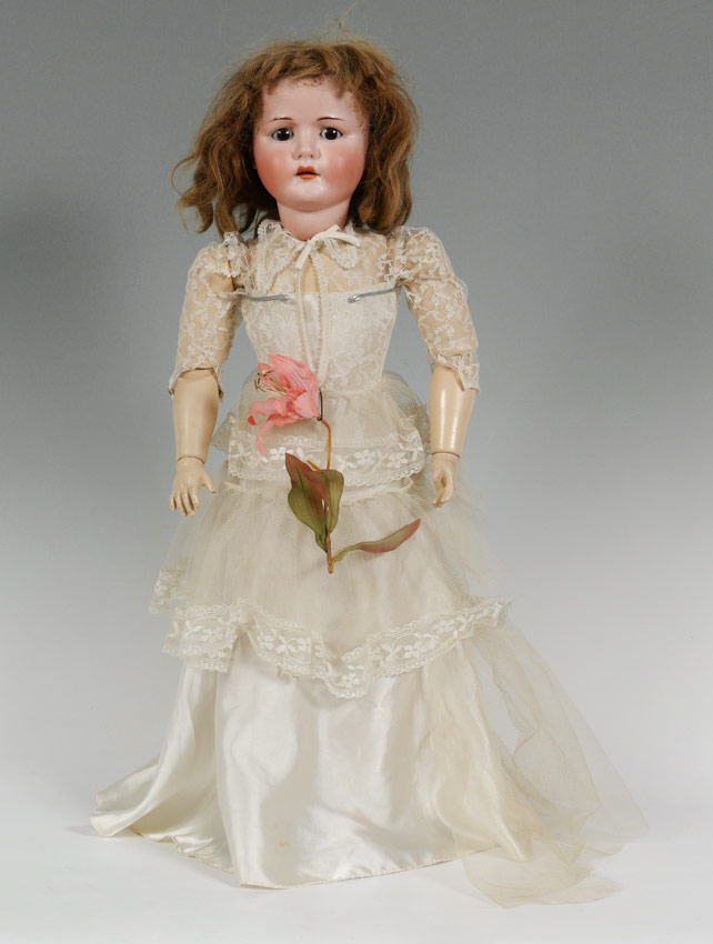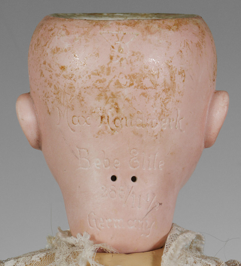 MAX HANDWERK BEBE ELITE GERMAN BISQUE HEAD DOLL: Impresses ''Max Handwerk Bebe Elite 286/11 1/2 Germany''. Sleepy brown wye, open mouth showing teeth. Fully jointed composition body and limbs. Approx. 26'' tall.