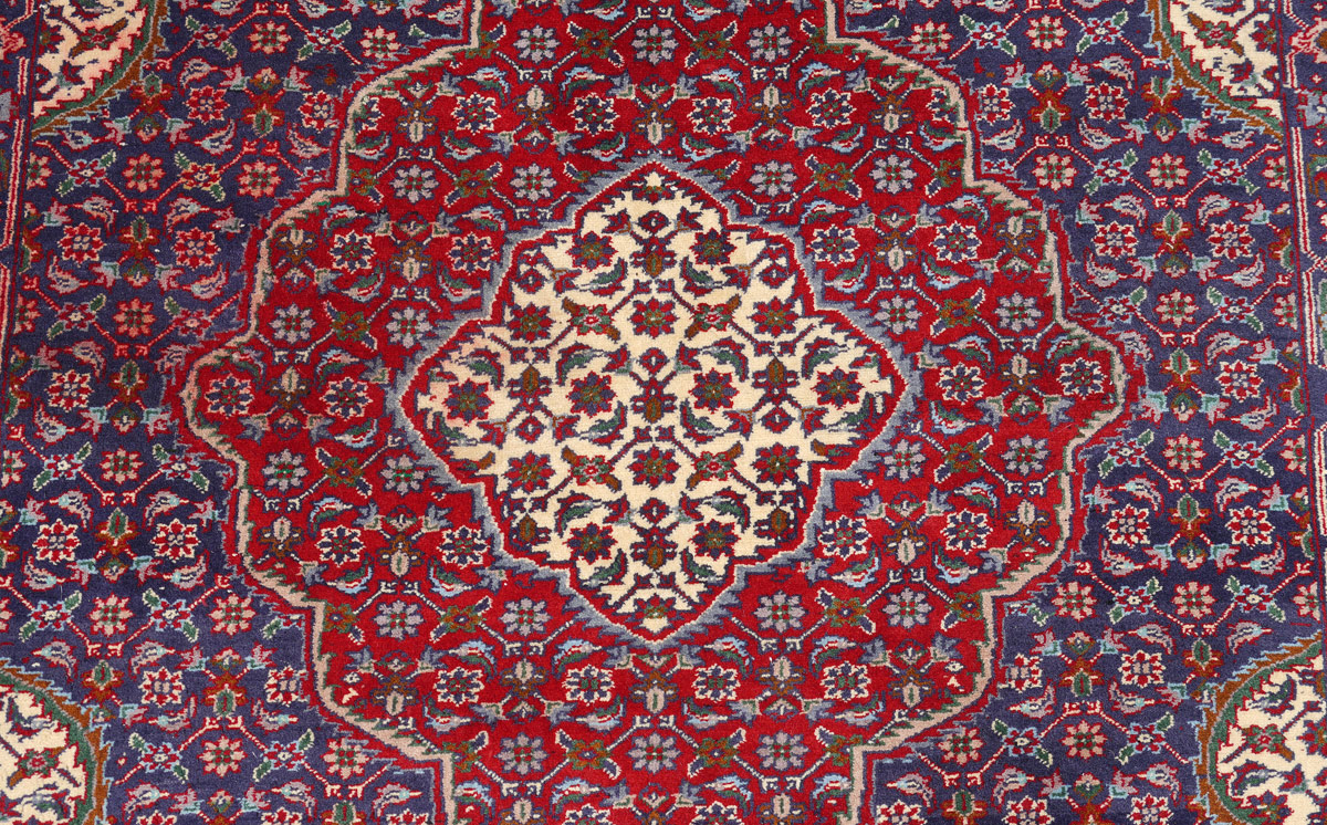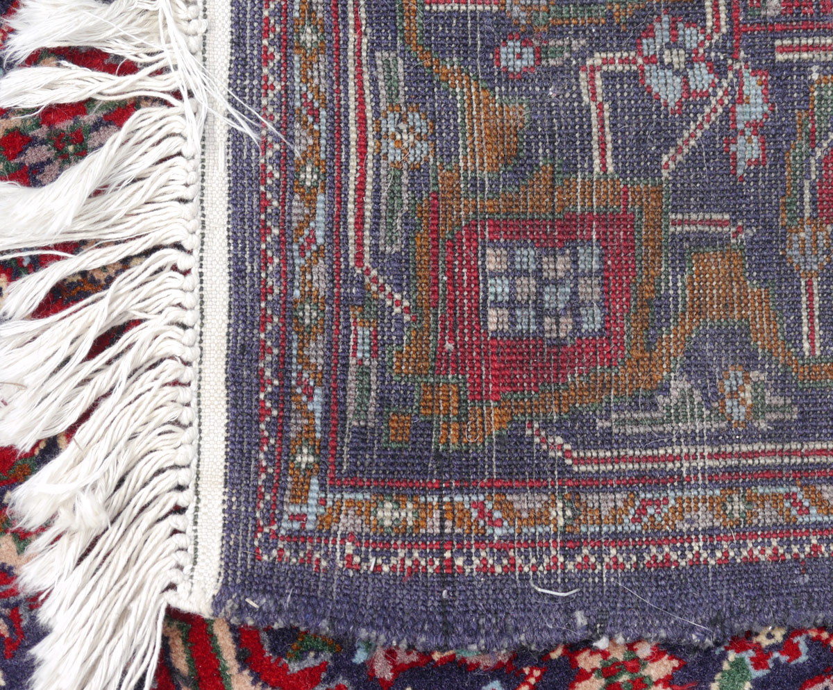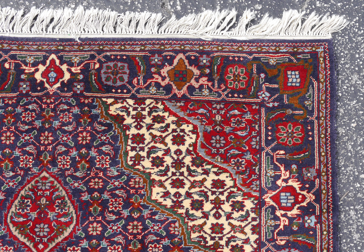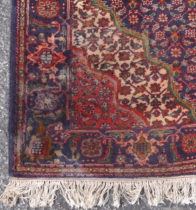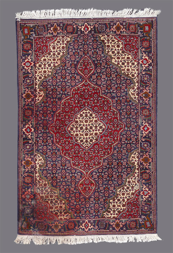 APPROX. 20-40YR. OLD INDO-PERSIAN HAND KNOTTED WOOL RUG, 3'11'' x 5'6'': This rug has a very happy red, white, and blue palette with a large red colored central medallion that has a white smaller center. The field it sits on is blue with white and red corners. The whole of the field is covered with a small repeating pattern of small flowers and leaves.