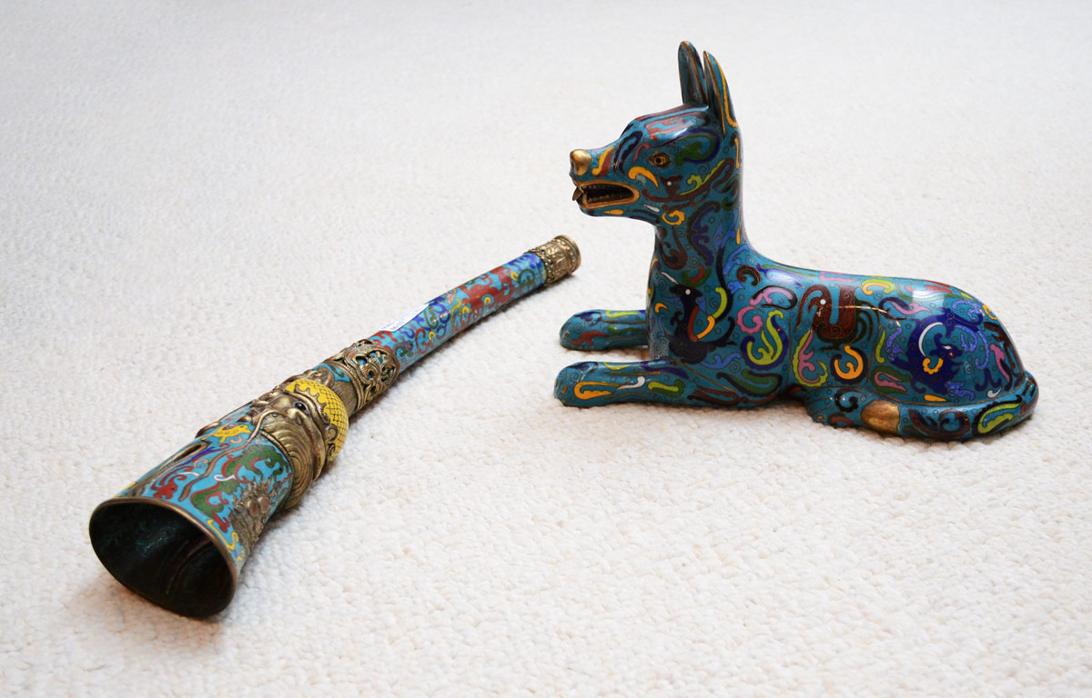 2 PIECE CLOISONNE DOG FIGURE & CEREMONIAL HORN: 2 pieces total to include 1) Seated dog with ears up and open mouth with tongue. 8 1/8'' h. x 12'' x 4''. 2) Horn with cast embellishments. 16 1/4'' long.