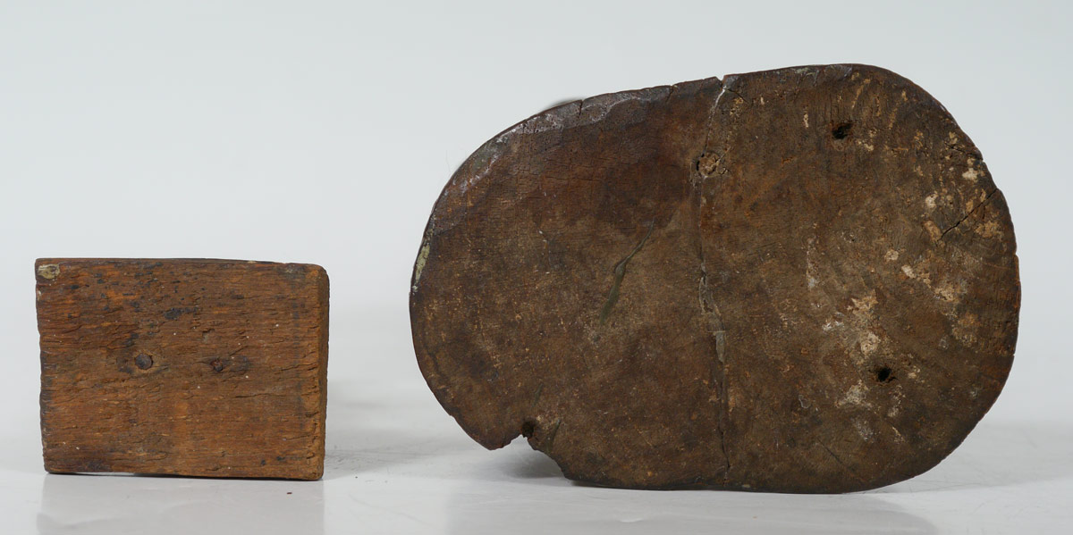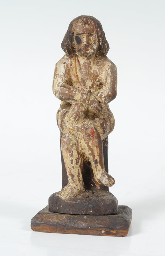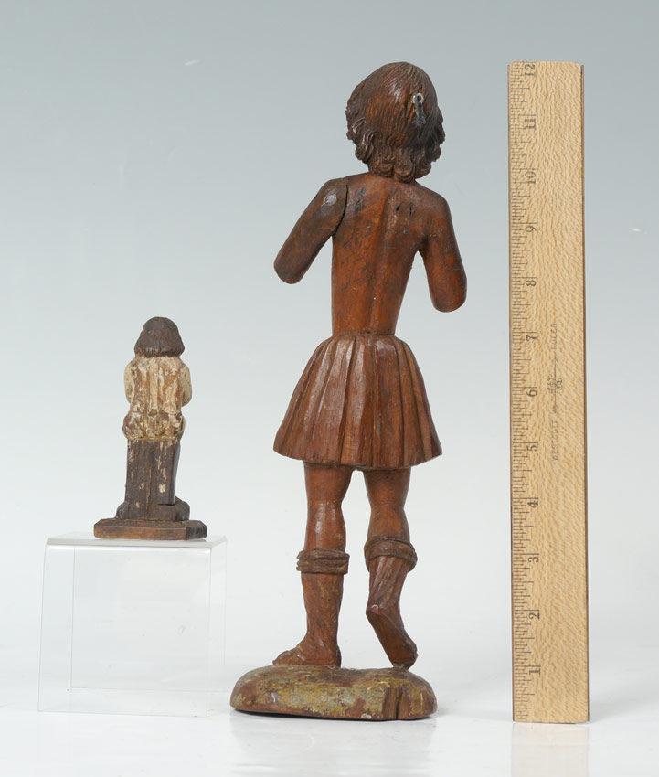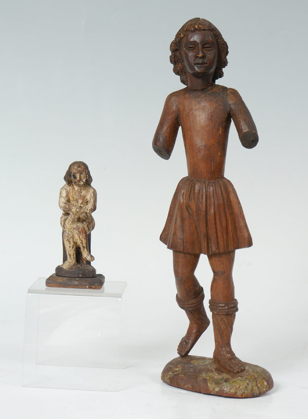 TWO EARLY SPANISH CARVED WOOD SANTOS FIGURES: 1) Seated saint with hands bound, partial paint remains, 4 1/4'' tall. 2) A 12'' tall carved figure lacking arms, minimal paint remains.