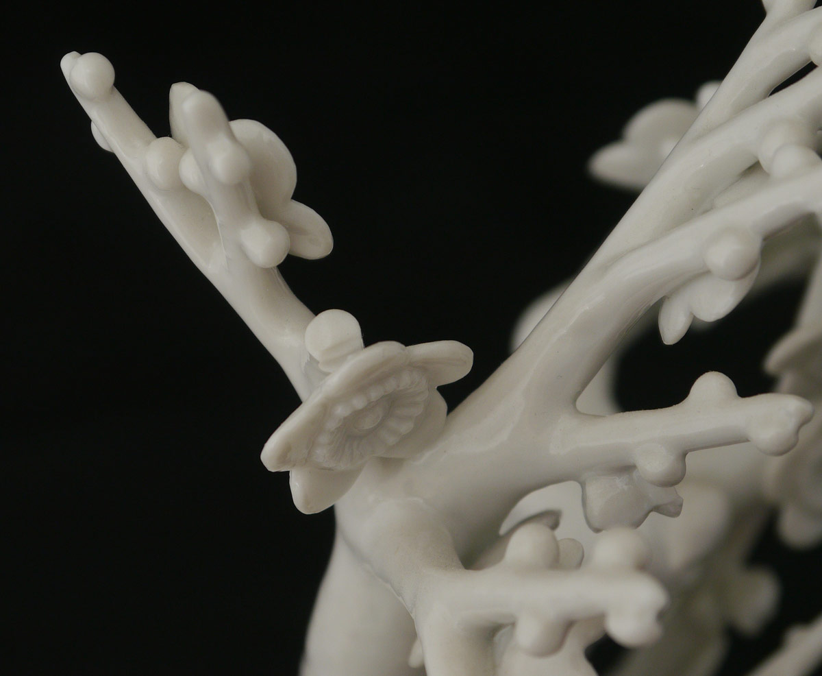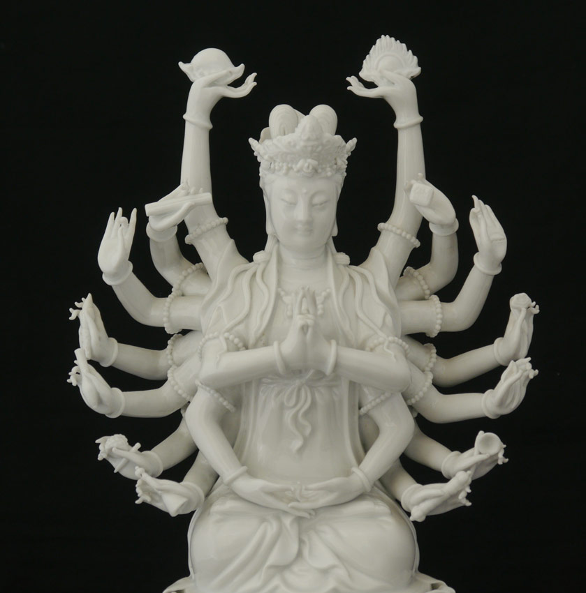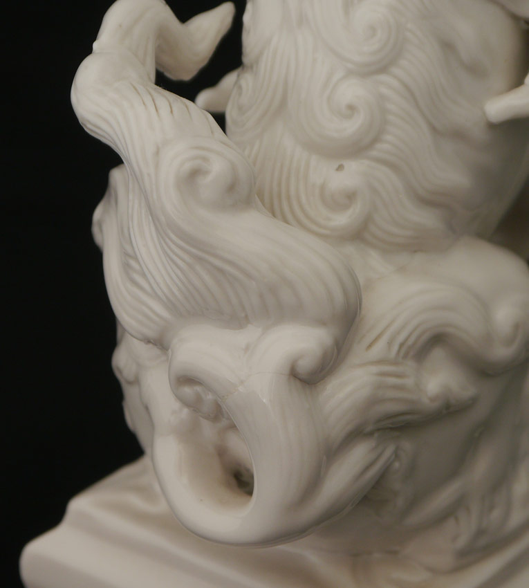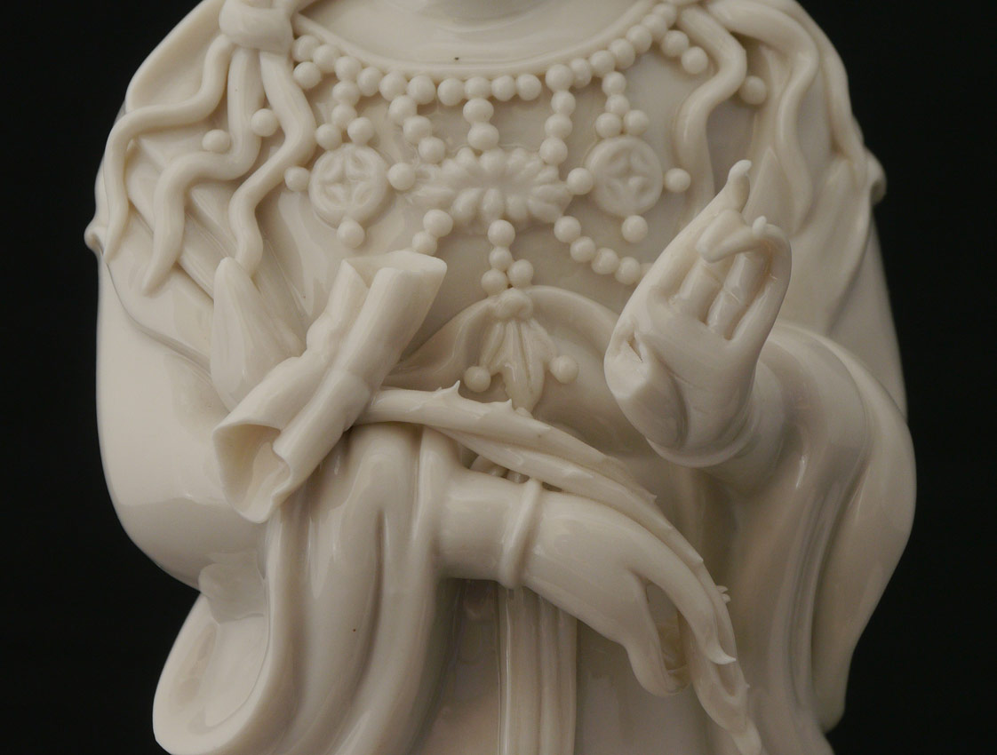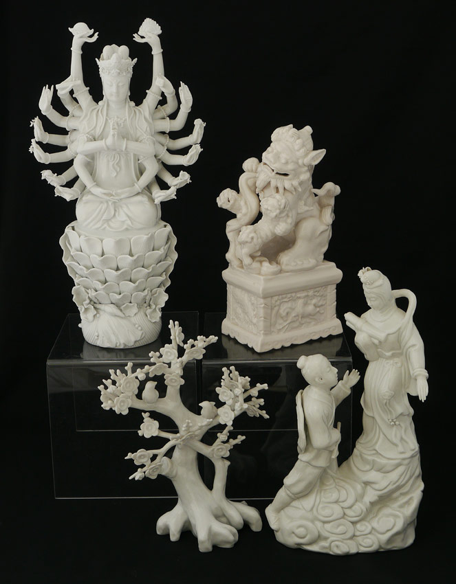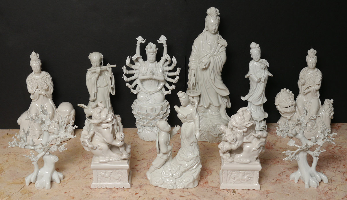 11 PIECE COLLECTION BLANC DE CHINE FIGURES: An assembled collection of assorted time periods and figures. 3 goddesses, 4 figures, 2 foo lions, and 2 trees. Sold as a lot. Actual age unknown. Tallest 15 3/4'' h. x 5 3/4'' x 5 3/4''.