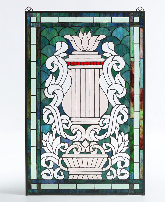 EXCEPTIONAL CONTEMPORARY STAINED GLASS WINDOW: Center urn and foliate motif, comprising multiple colors and styles of glass. Overall frame measures 37'' x 24''.