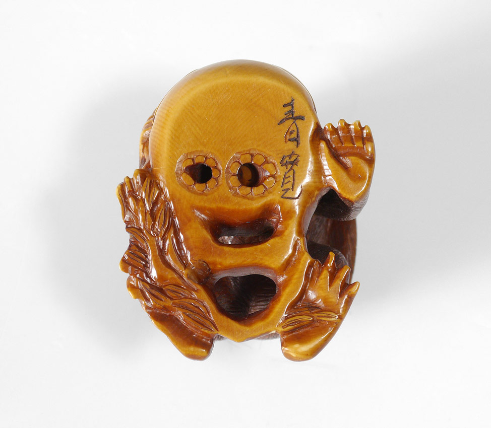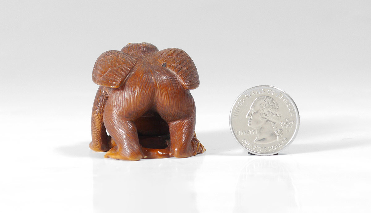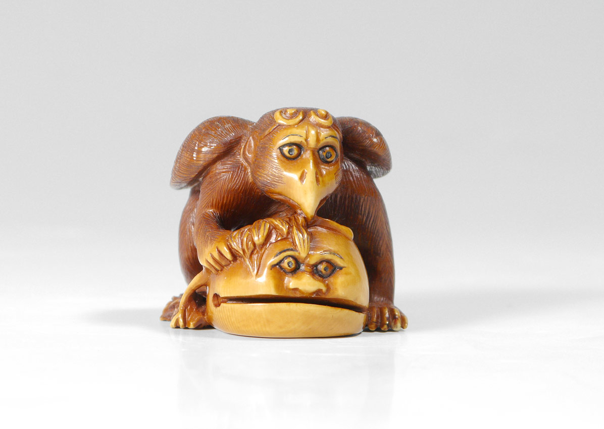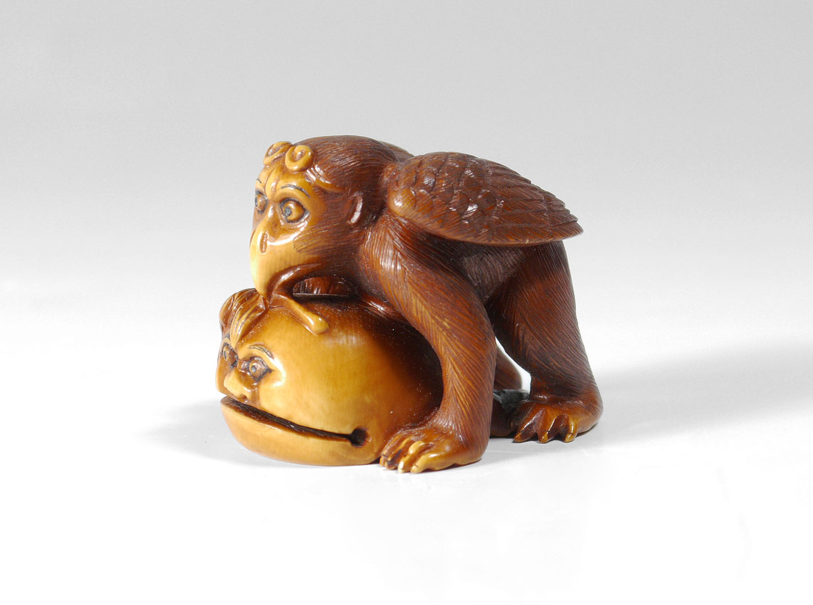 CARVED IVORY MYTHOLOGICAL WINGED CREATURE NETSUKE: Creature in the form of a winged monkey above another creature, signed, 1 1/2'' h.