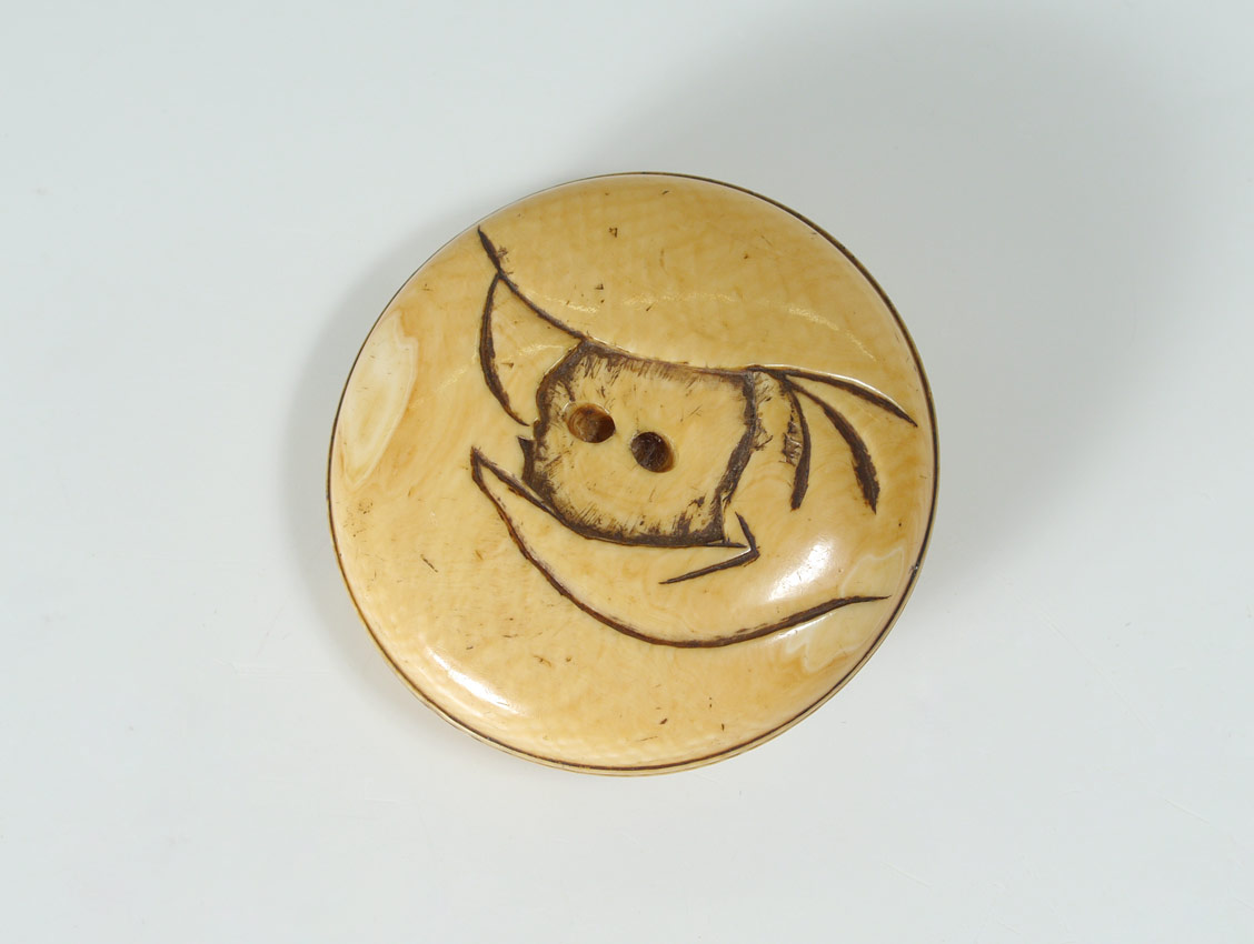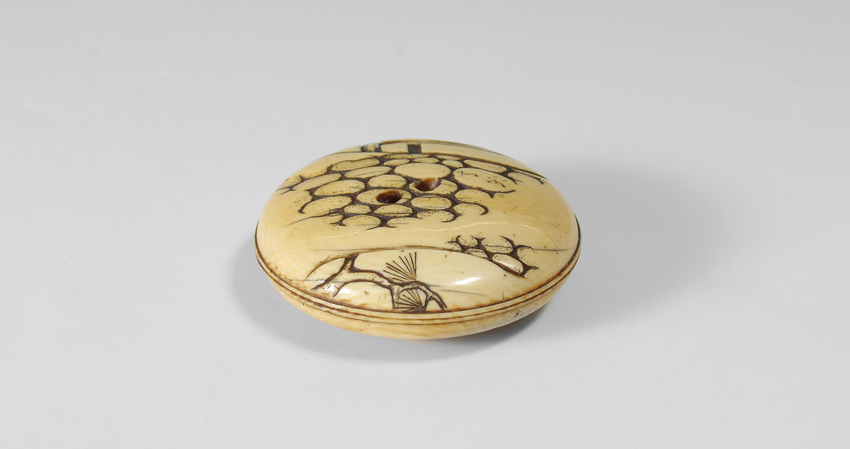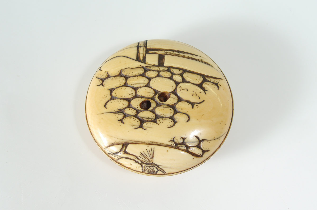 CARVED IVORY JAPANESE MANJU NETSUKE: Round form netsuke with Daruma on one side, scene of dry river bed verso. Signed, 2'' dia.