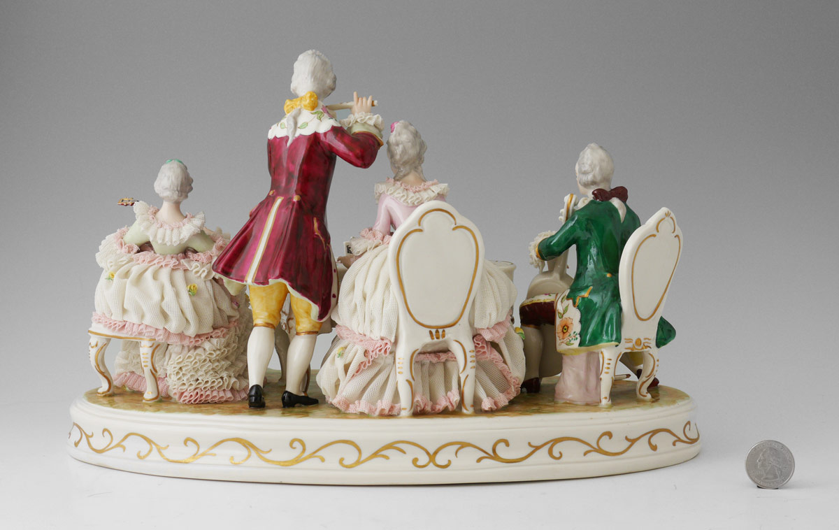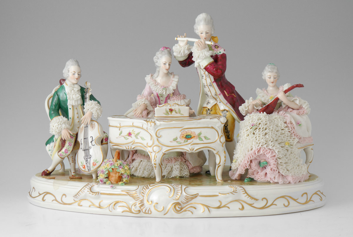 MULLER & CO. MUSICAL LACY PORCELAIN FIGURAL GROUP: 4 figures, each with a musical instrument. Muller & Co. mark on base. Measures 9 3/4'' h. x 13 1/2'' x 6 1/2''.