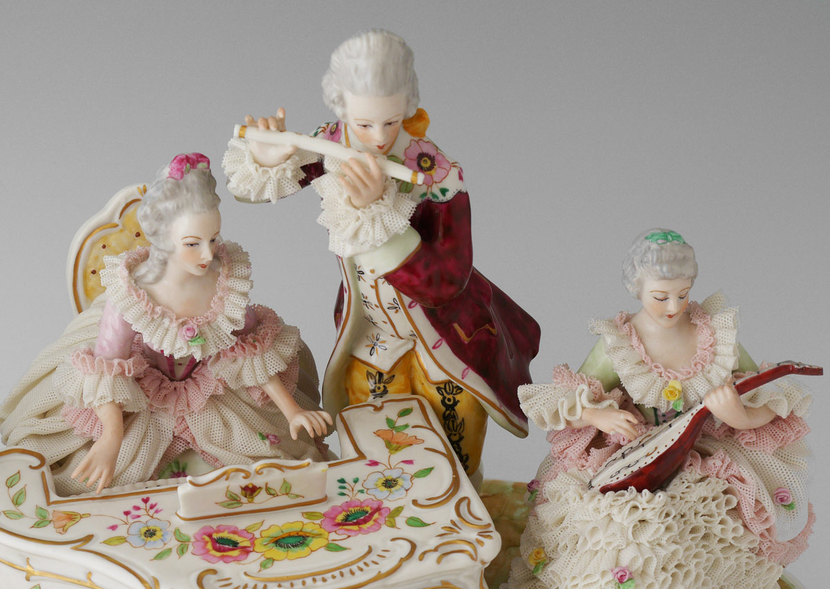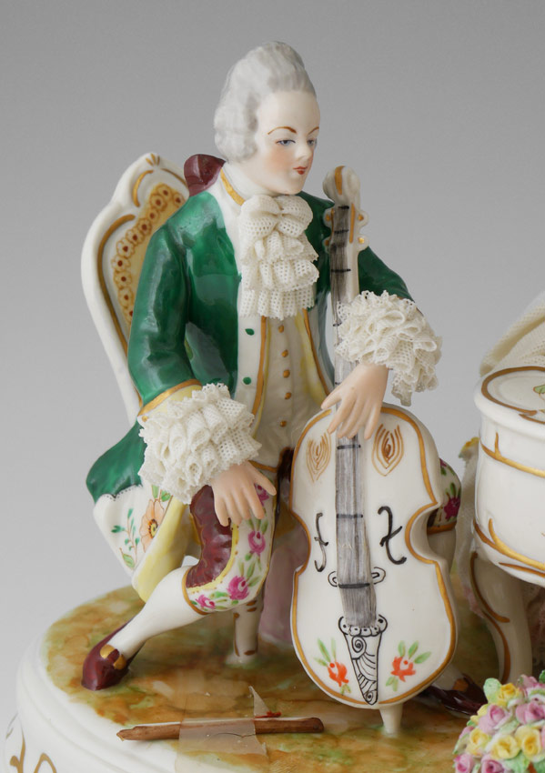 CONDITION: Bow to cello player has come off and taped to piece, pinky missing on lute player. Due the delicate nature of the lace, some loss to be expected.