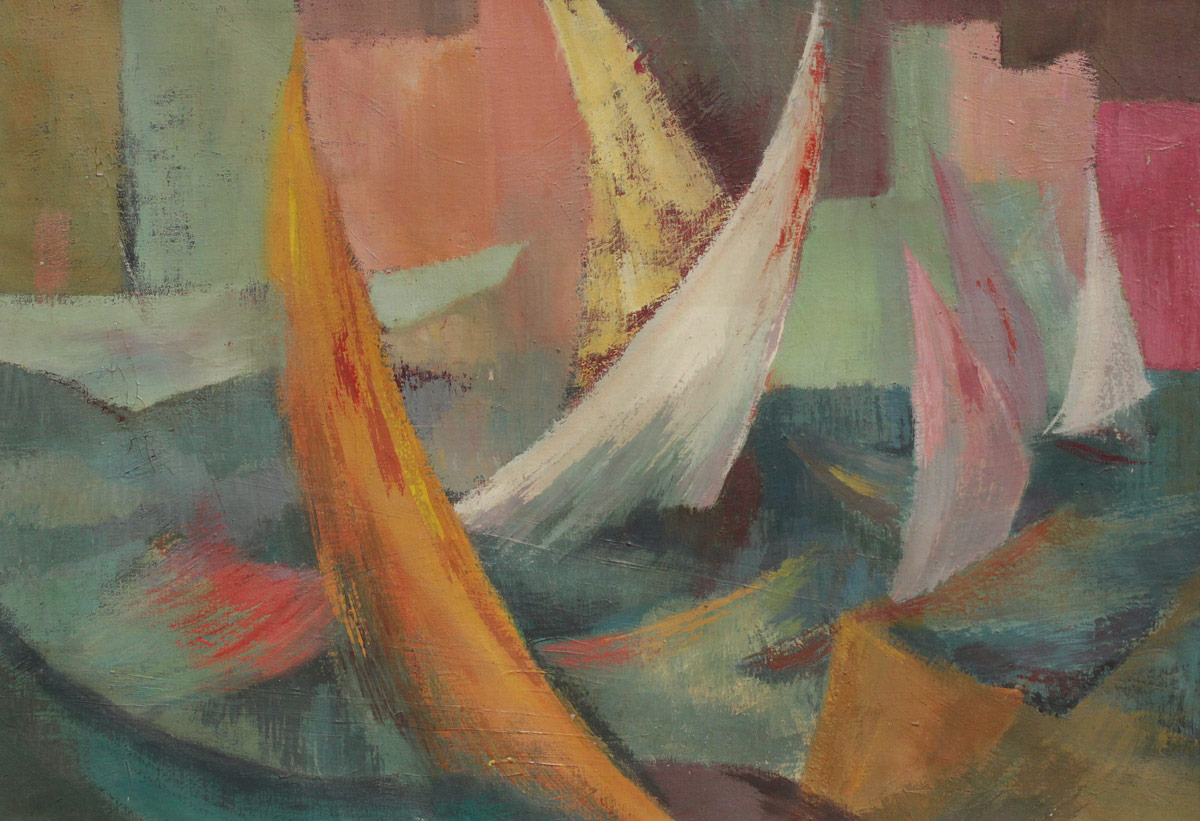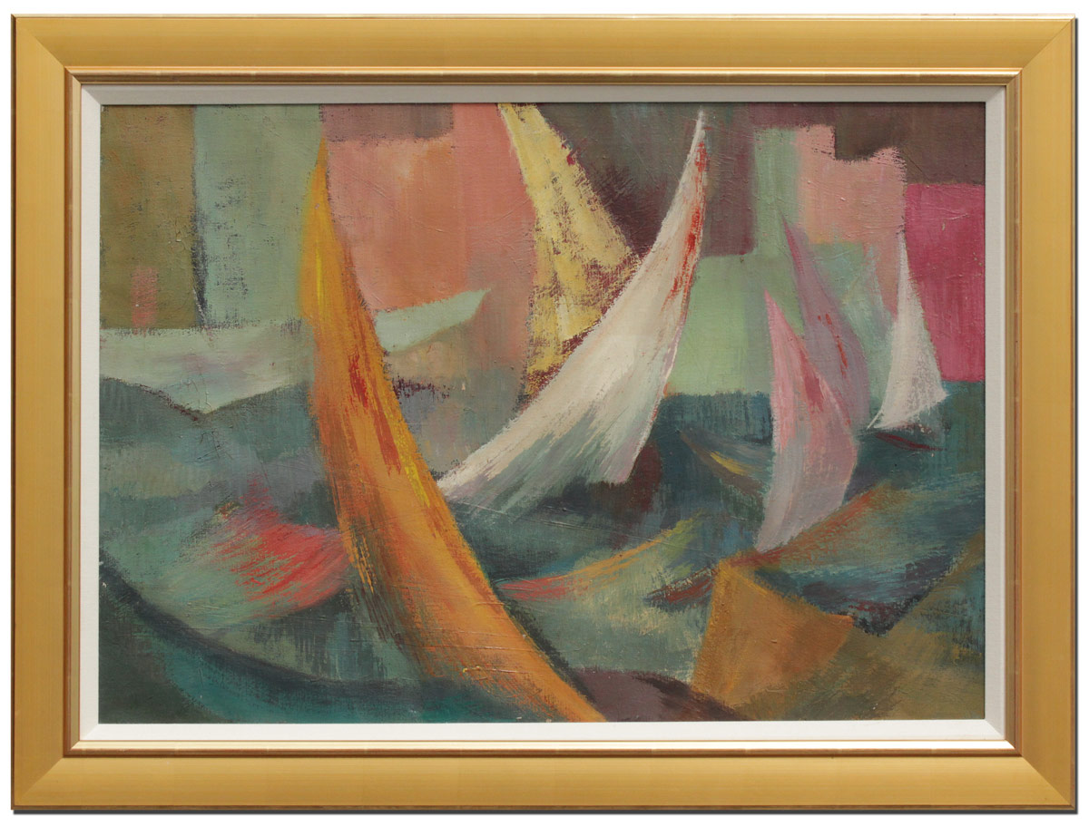 SORGMAN, Mayo, (American, 1912- ): Modernist Sailboats, Oil/Canvas, 21'' x 30'', encased in a contemporary gilded frame, 26'' x 35 1/2''.