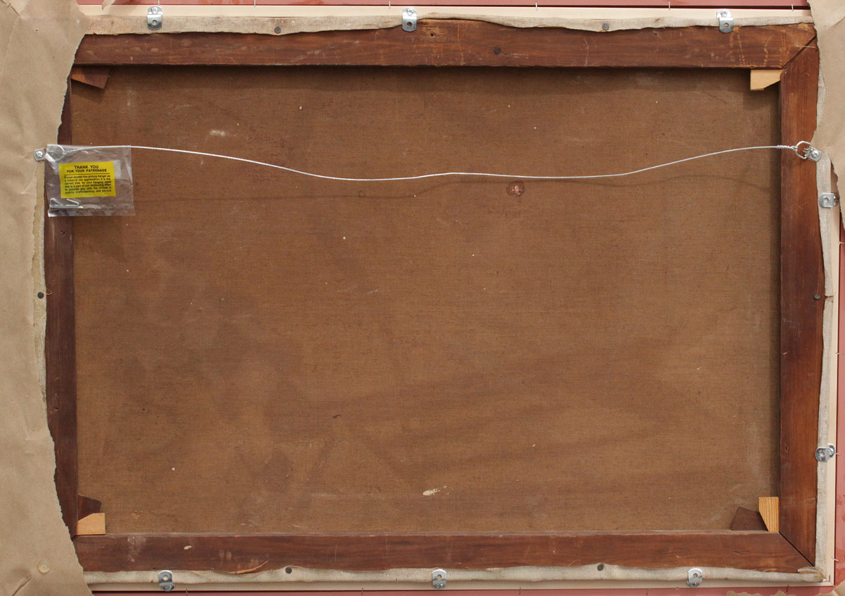 CONDITION: Several flecks of paint loss, scattered concentrations of craquelure with paint fleck, probably should be re-stretched and cleaned.