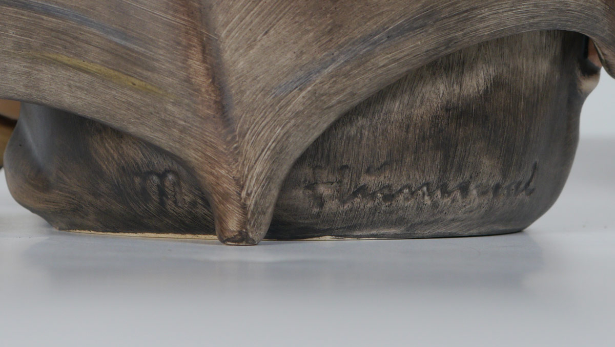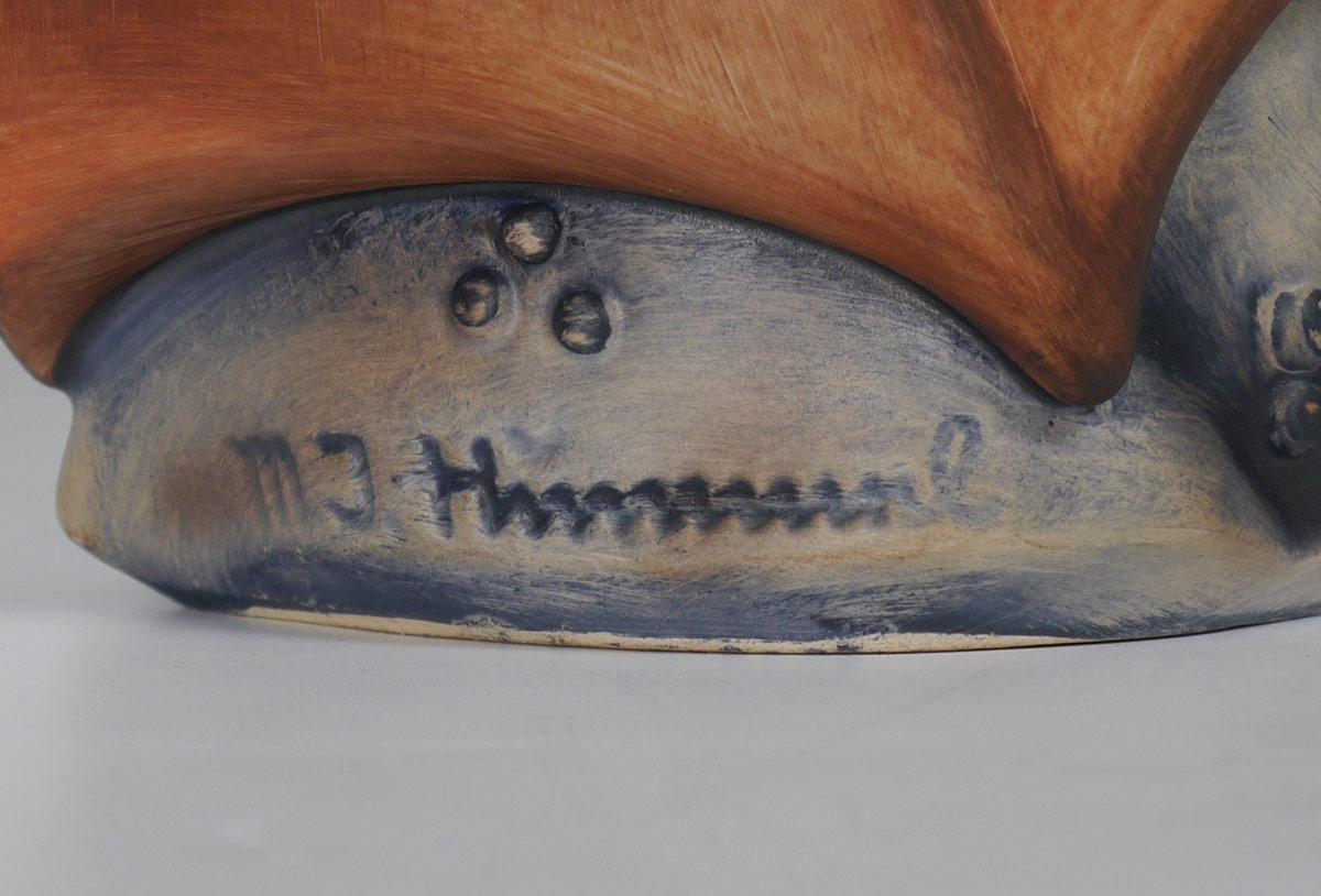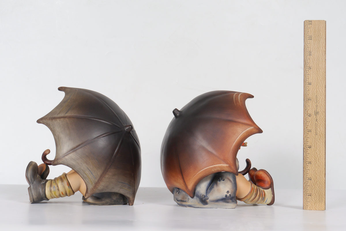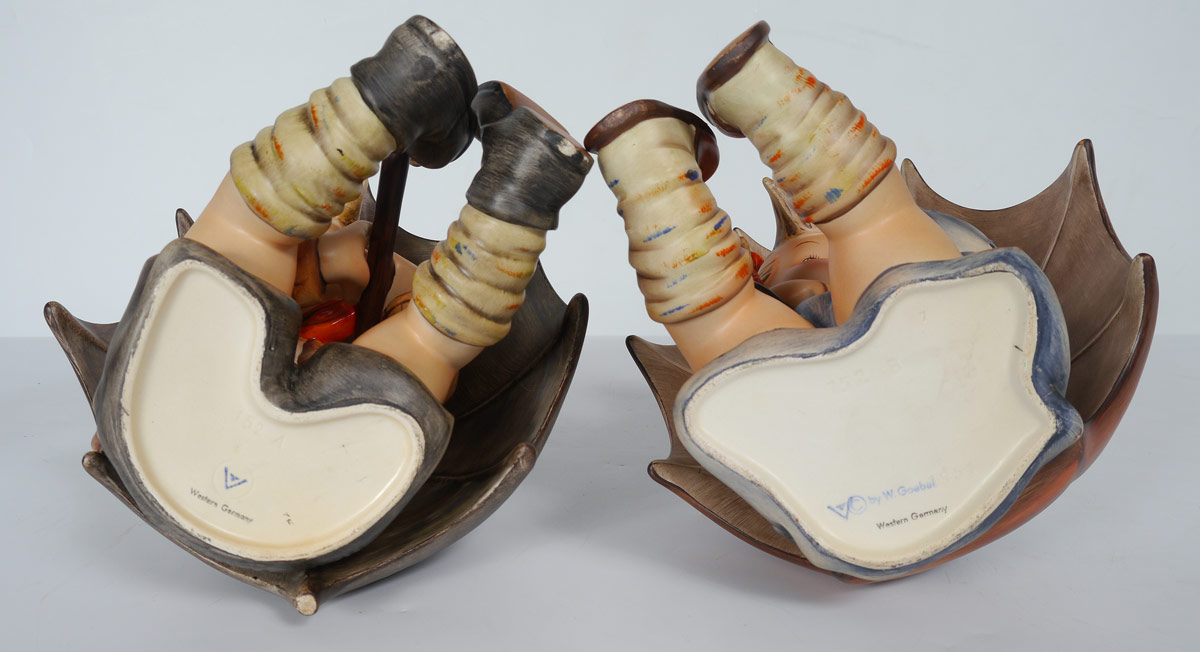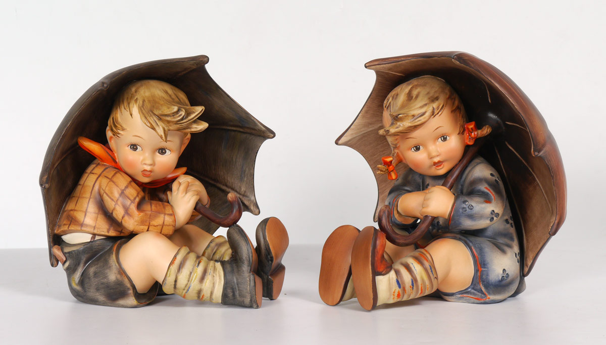 HUMMEL PORCELAIN FIGURINES - LARGE UMBRELLA BOY AND UMBRELLA GIRL: Umbrella Boy, 152 A impressed, stylized Bee & Western Germany stamp marks, crazing to right knee, 7 1/2''h., approx. 7'' x 7 1/4''. Umbrella Girl, 152 B & 1951 impressed, stylized Bee, copyright by W. Goebel & Western Germany stamp marks, generalized crazing, slight wobble, 7 5/8''h., approx. 8'' x 7''.