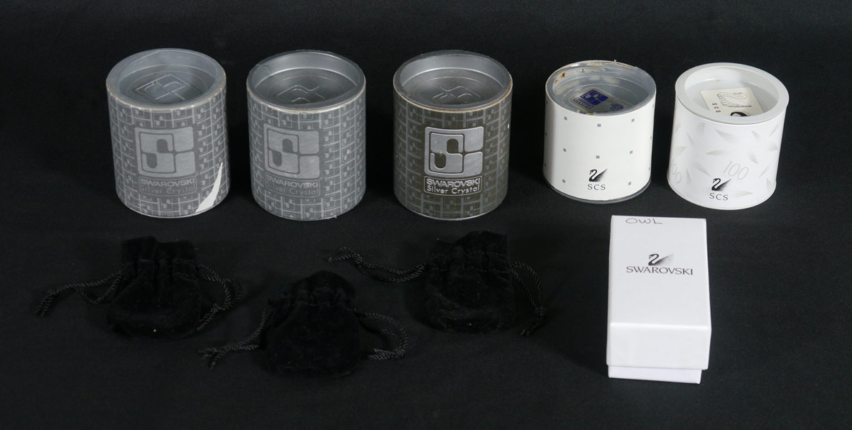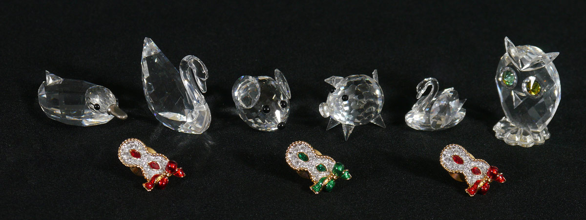 ESTATE COLLECTION OF TINY SWAROVSKI CRYSTAL FIGURES: To include, SCS 1995 Renewal Swan, 1 1/8'' approx., Anton Hirzinger designer; Mini Swan, 7658 027 000, 1982-1988, 15/16'', Max Schreck designer; Mini Duck, 7653 045 000, 1980-1988, 1 7/8'', Max Schreck designer; Mini Pig with crystal tail, Var 1., Barnyard Friends series, 7657 027 000, 1'' approx., 1982-1994, Max Schreck designer; Mini Mouse, no tail, 7655 023 000, 1'' approx., 1982-1987, Max Schreck designer; Mini Owl, Our Woodland Friends series, 7636 046 000, 1 3/8'', 1979-, Max Schreck designer; and 3 Small Mask Brooches from the Masquerade Trilogy - 2 red 2000 and 1 green 2001. Sold as a lot.