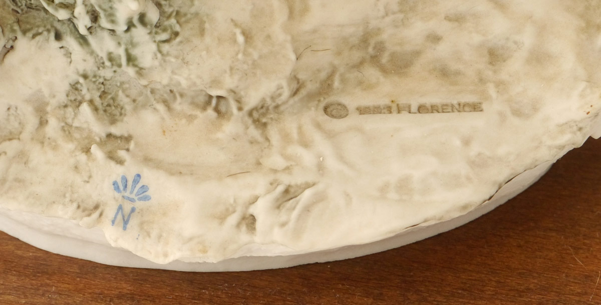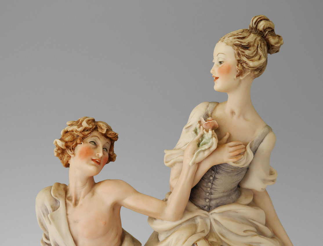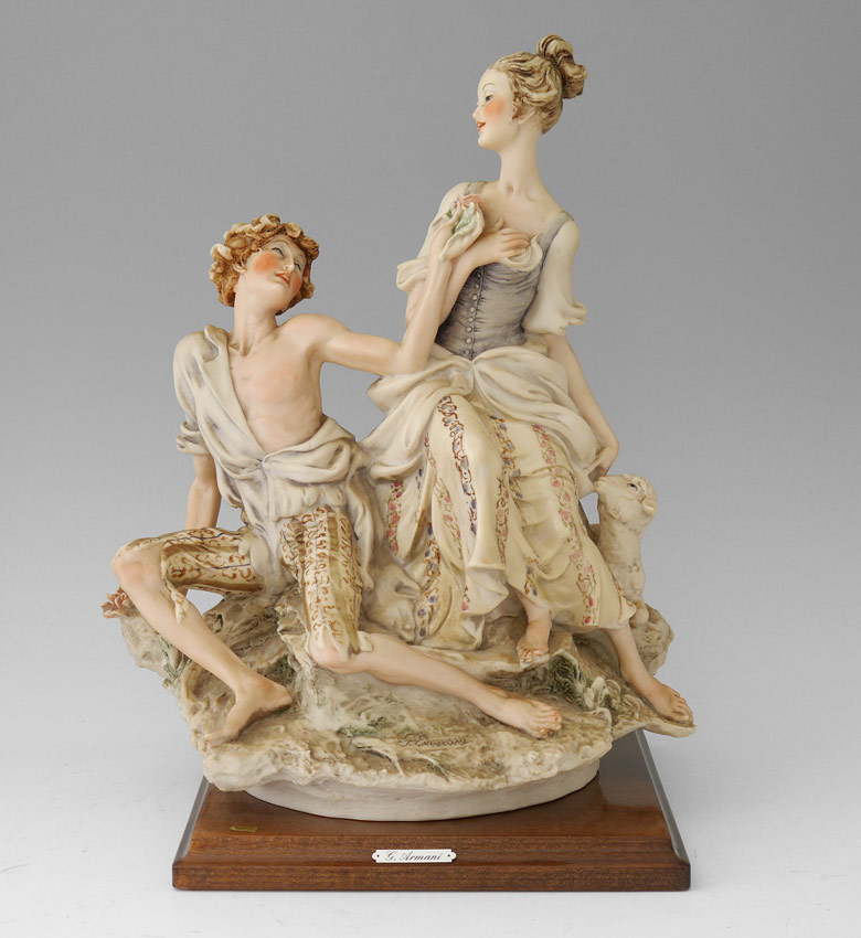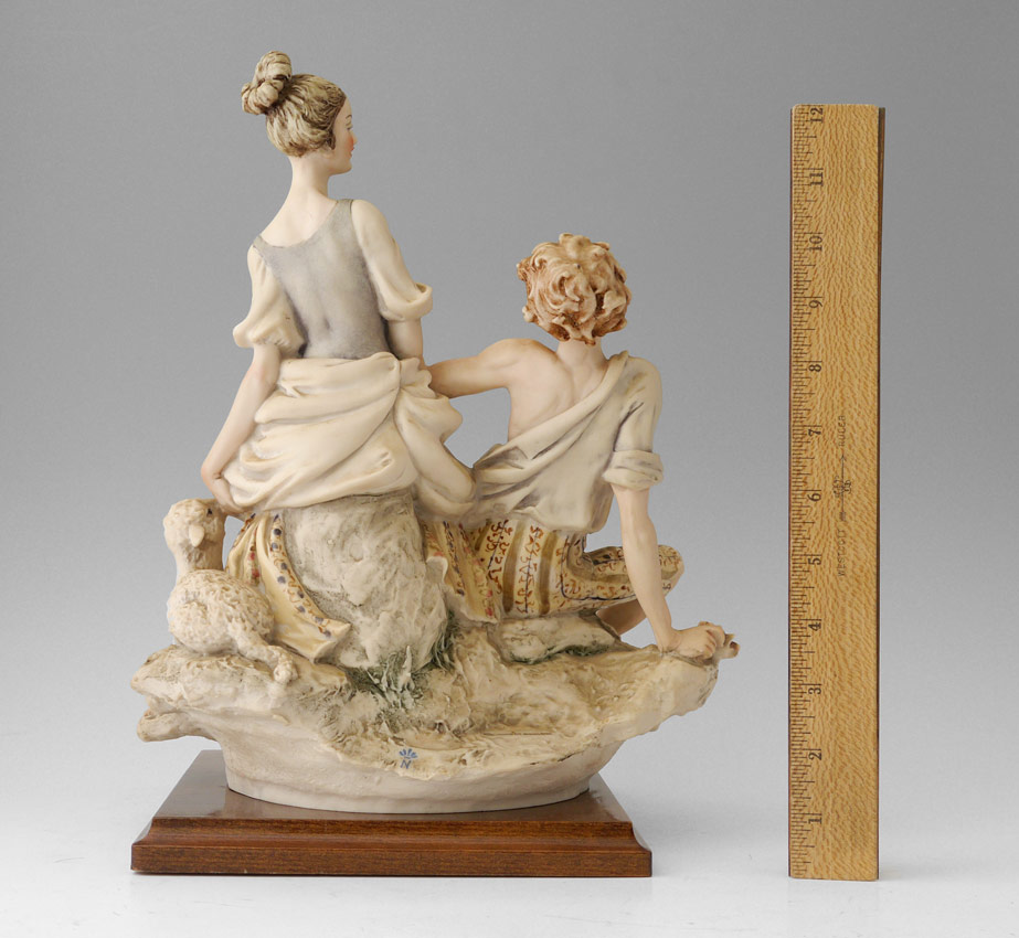 GIUSEPPE ARMANI FLORENCE SCULTURE d'ARTE FIGURINE: Shepherdess with sheep being courted with roses, possibly from the Capo di Monte collection, approx. 13 3/4''h. x 10 1/2'' x 8''.