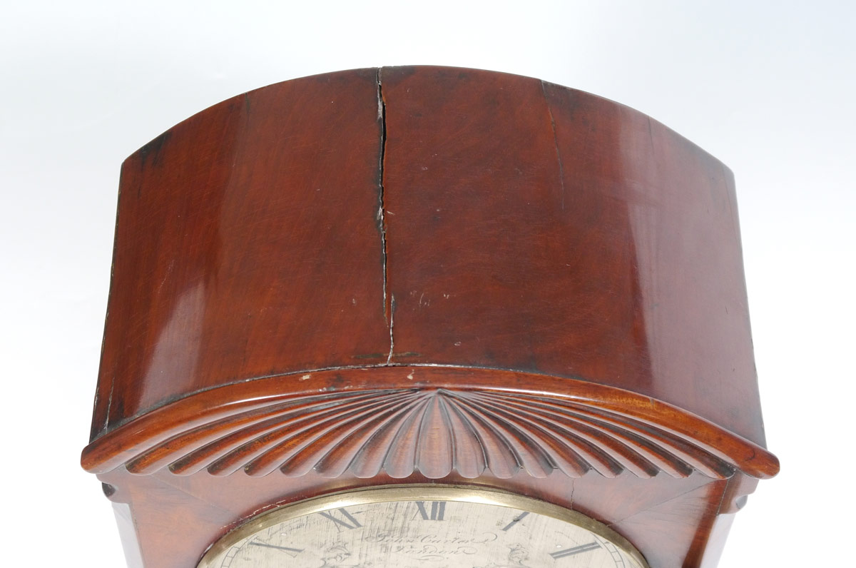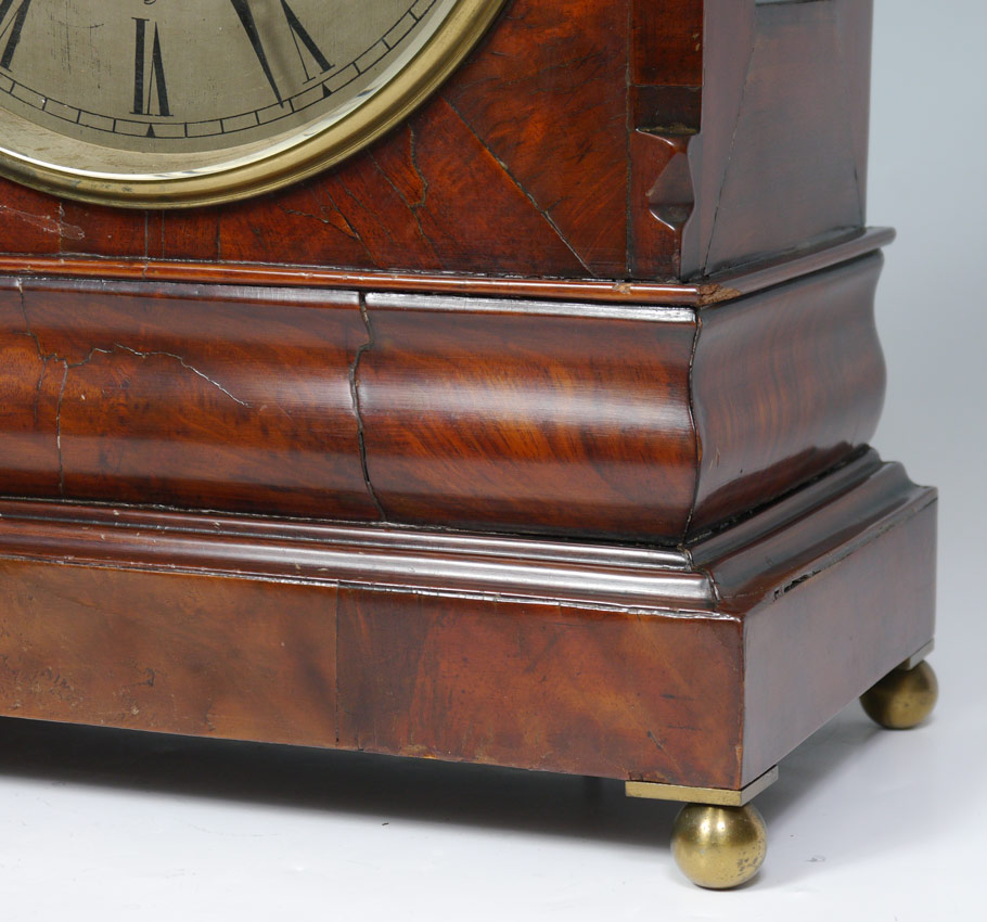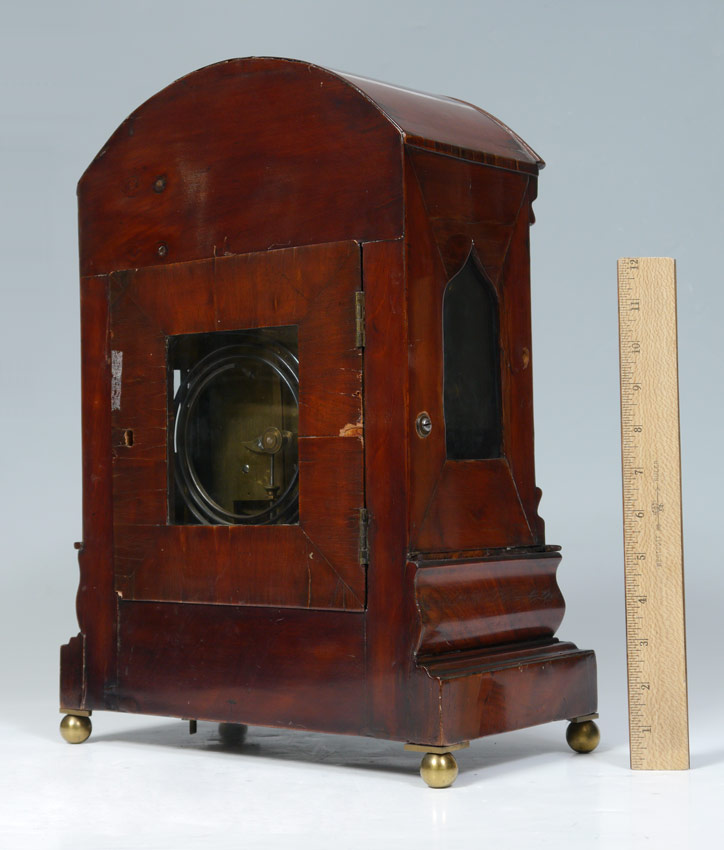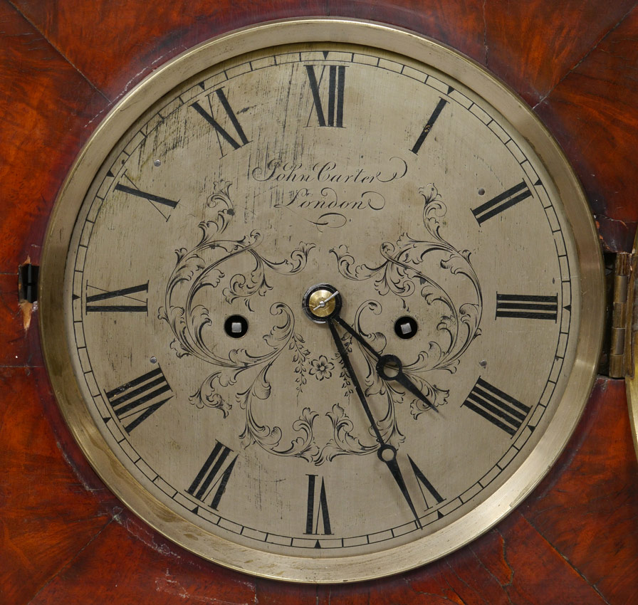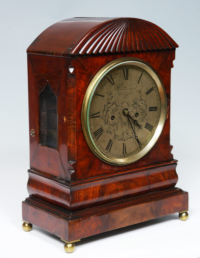 JOHN CARTER ENGLISH DOUBLE FUSEE SHELF CLOCK: 19th century, carved and shaped mahogany case with architectural side windows, on 4 brass feet. Metal dial with Roman numerals marked John Carter, London. Double fusee time and strike movement. Keys in office. 17'' h. x 12 1/2'' x 7''.