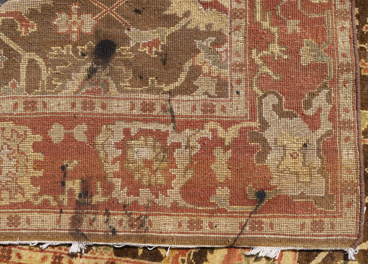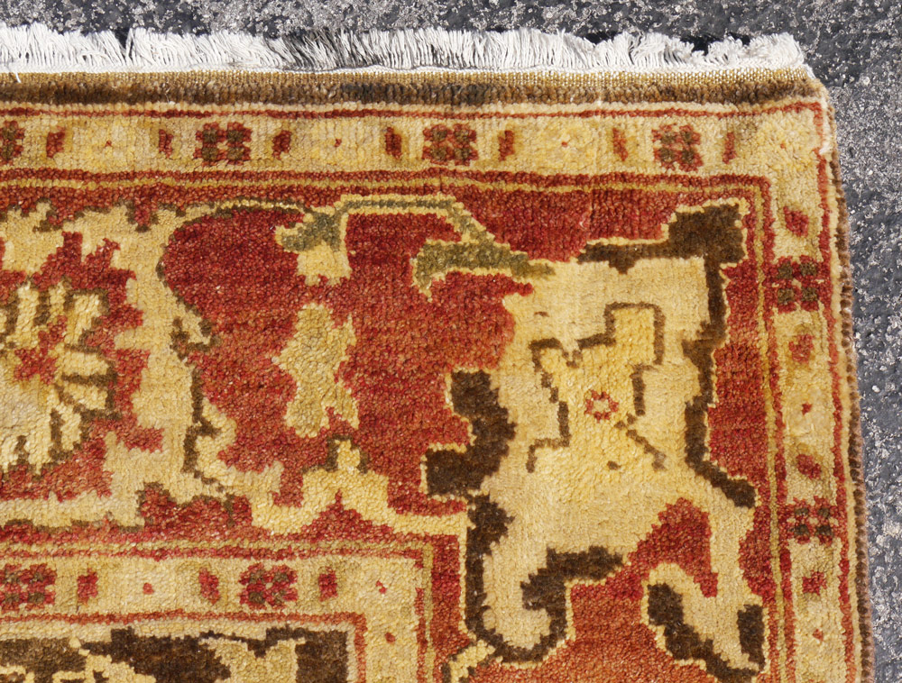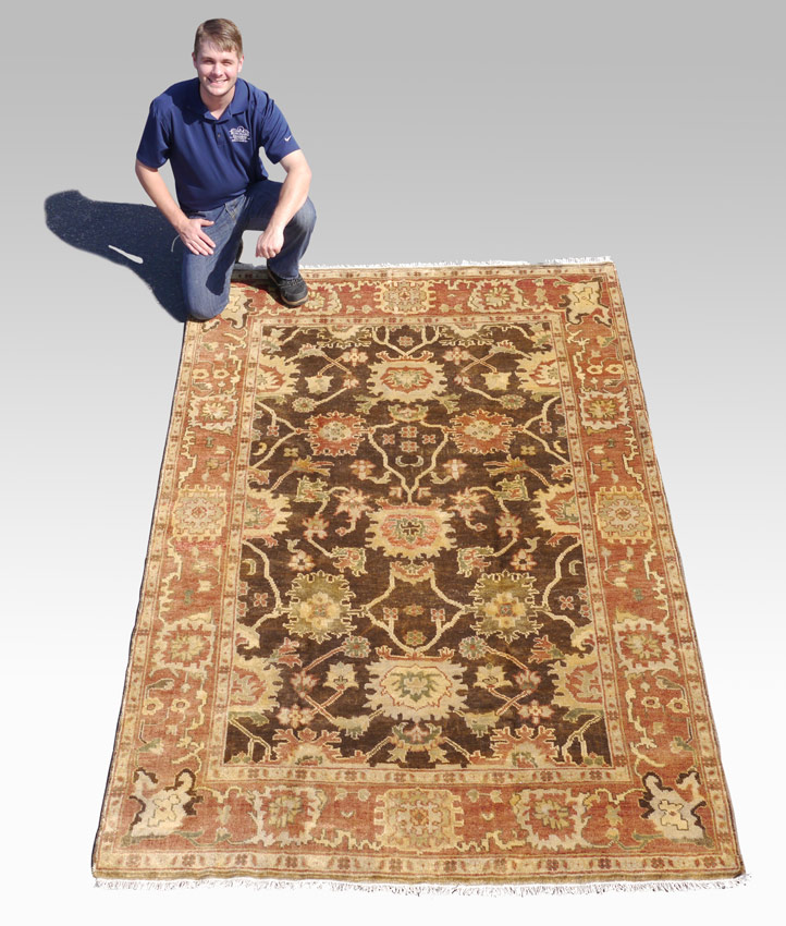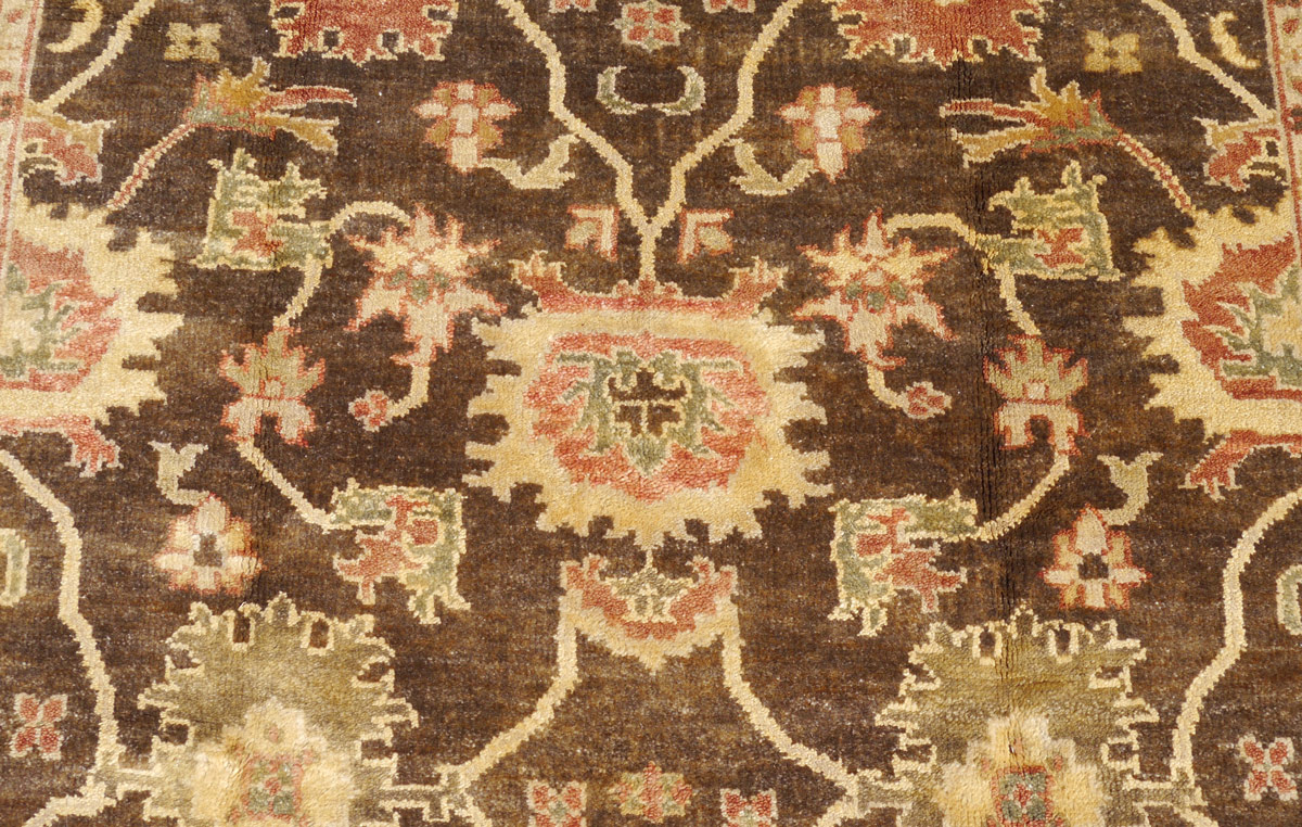 TURKISH OUSHAK HAND KNOTTED WOOL RUG, 6' x 9': This attractive Turkish rug has a greenish-brown field covered with light colored palmettes that are connected by vines that also are ivory, peach-red, pale green, and yellow. The main border has the peach-red ground also with palmettes and vines. The rug has a soft sheen that is due to a finishing wash that makes the colors very harmonious. This rug would look good with many different styles of furnishing. Condition is good.