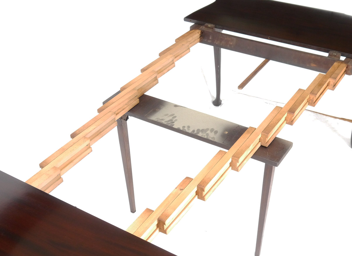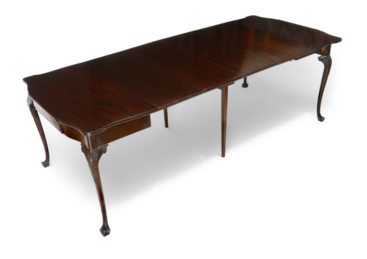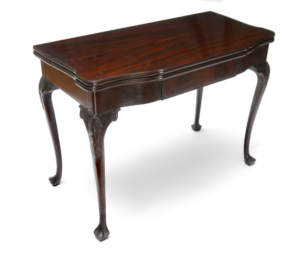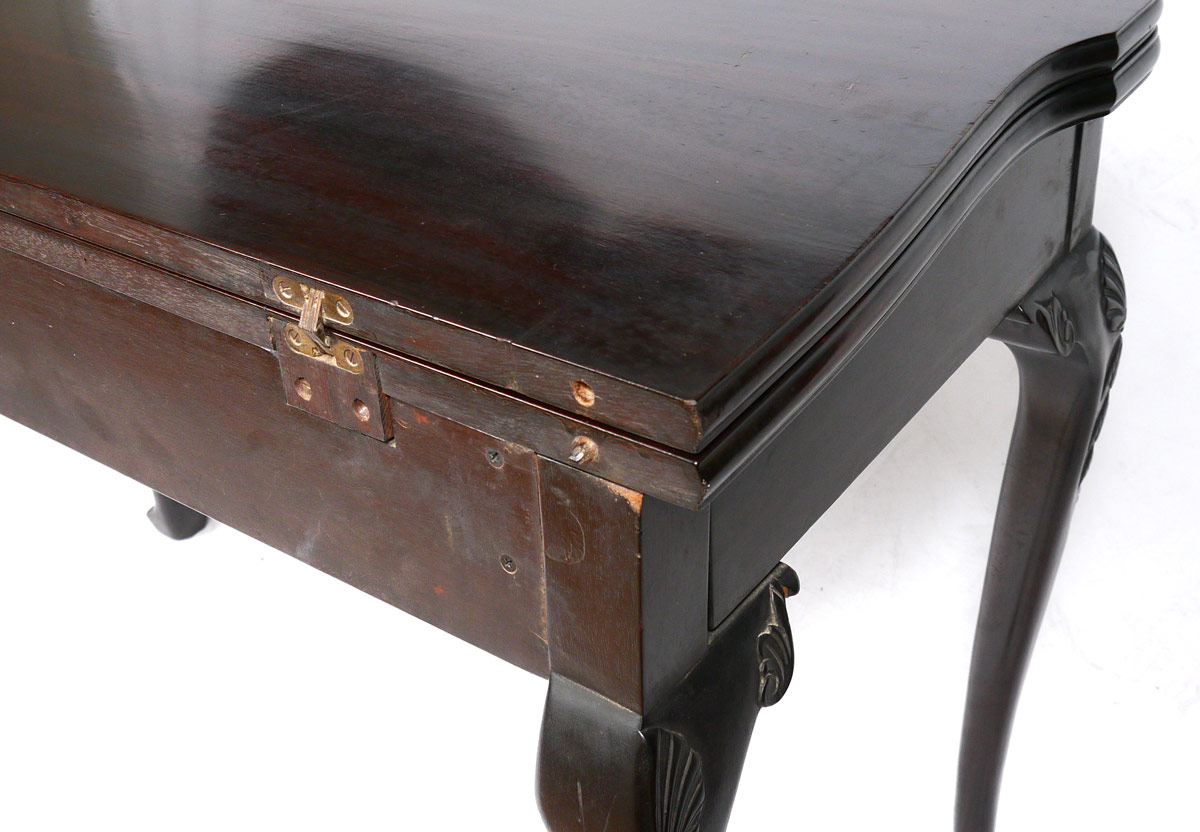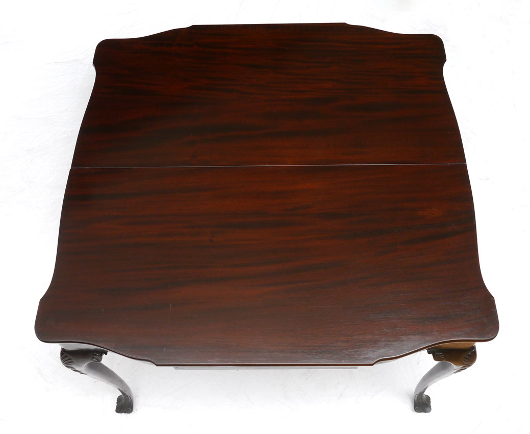 CHIPPENDALE CARVED MAHOGANY EXTENSION GAME TABLE WITH 4 LEAVES: Shaped flip top, cabriole legs with carving at knees, ending in pad feet. Closed measures 31'' h. x 41 1/2'' x 20'', each leaf 14''.