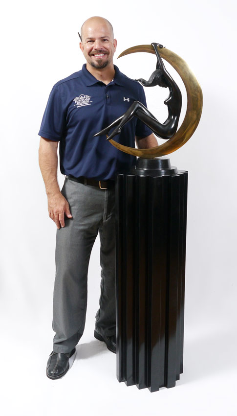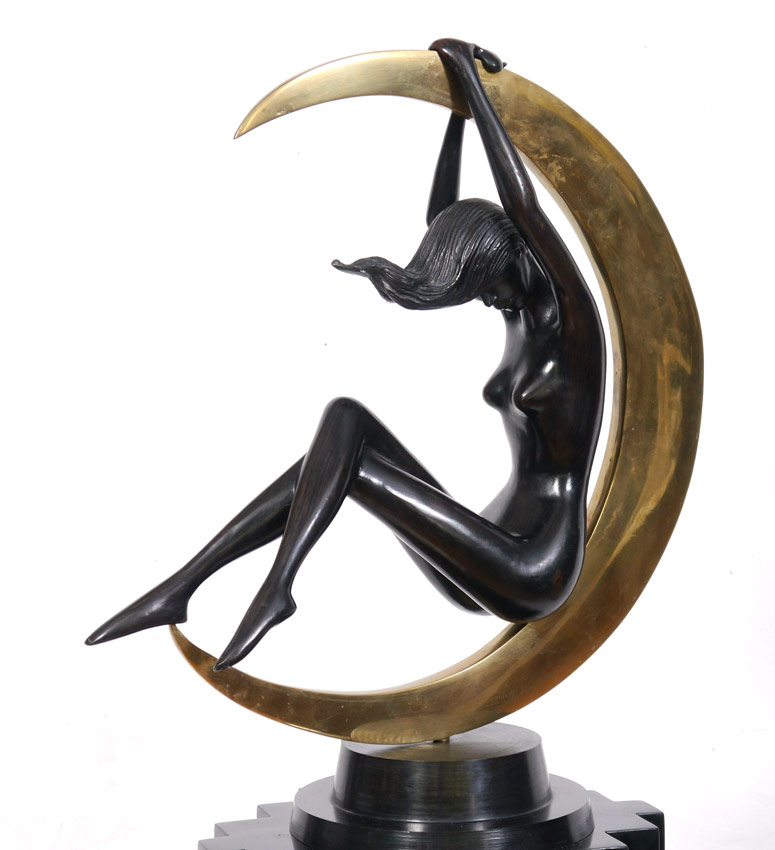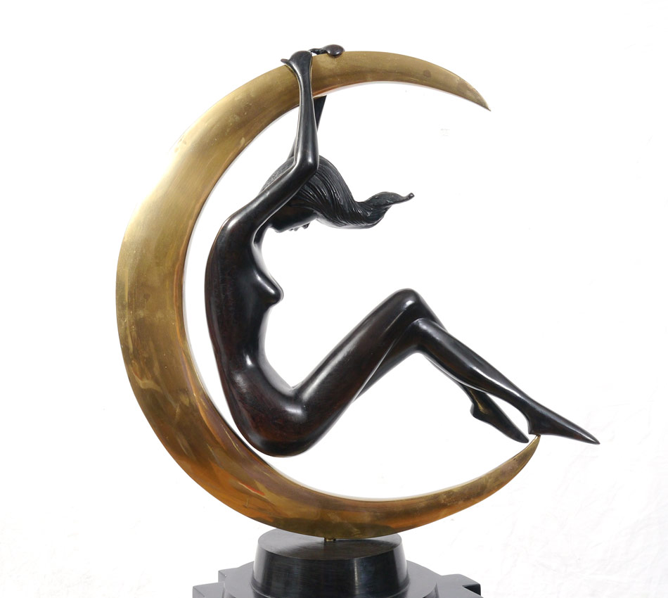 MODERN BRONZE NUDE WOMAN IN THE MOON: 20'' h., x 20'' w., affixed to custom painted resin pedestal, 64'' h.