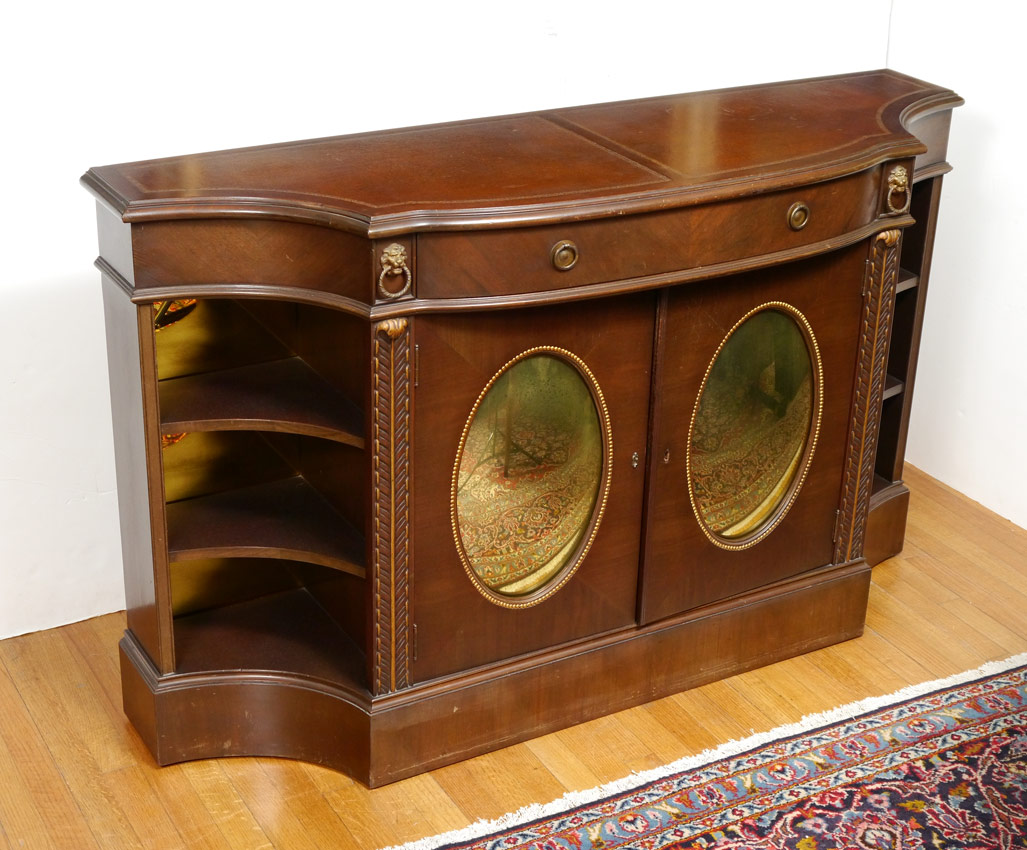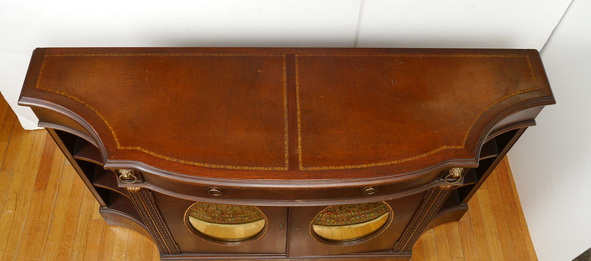 LEATHER TOP MAHOGANY CREDENZA: Shaped top with double embossed leather top, central drawer over 2 doors with gold mirror inserts. Open sides with 2 shelves, 36 3/4'' h. x 60 1/4'' x 18''.