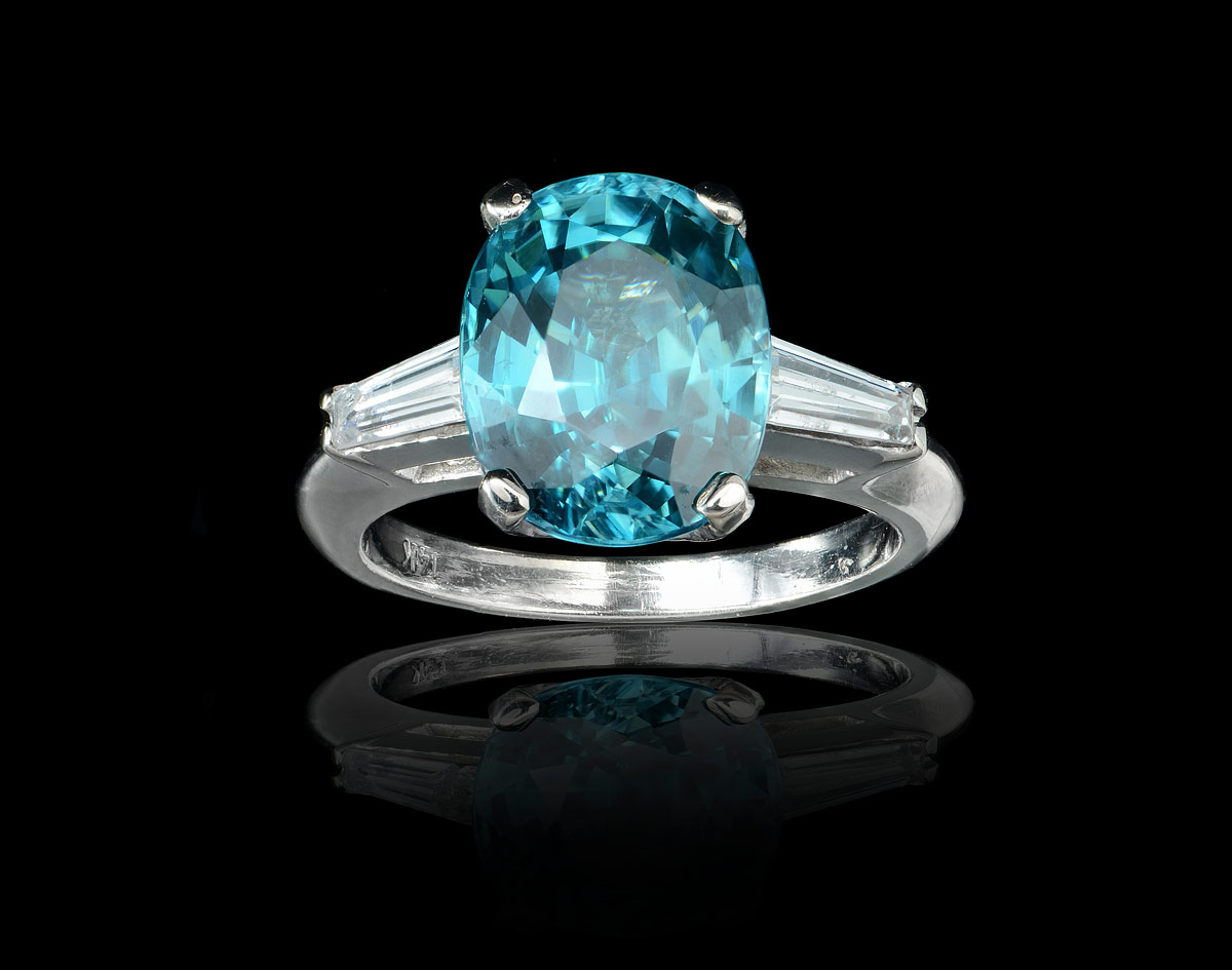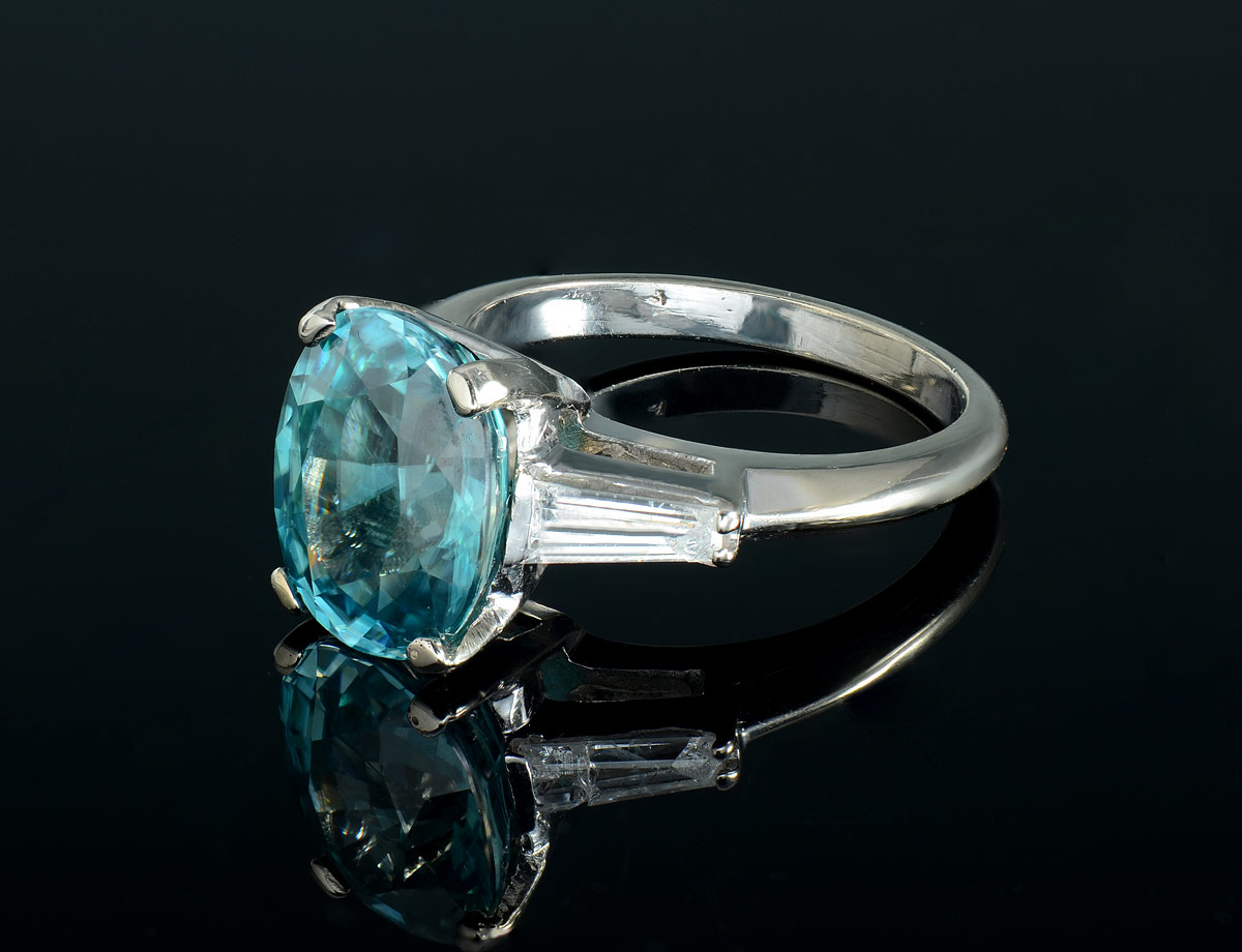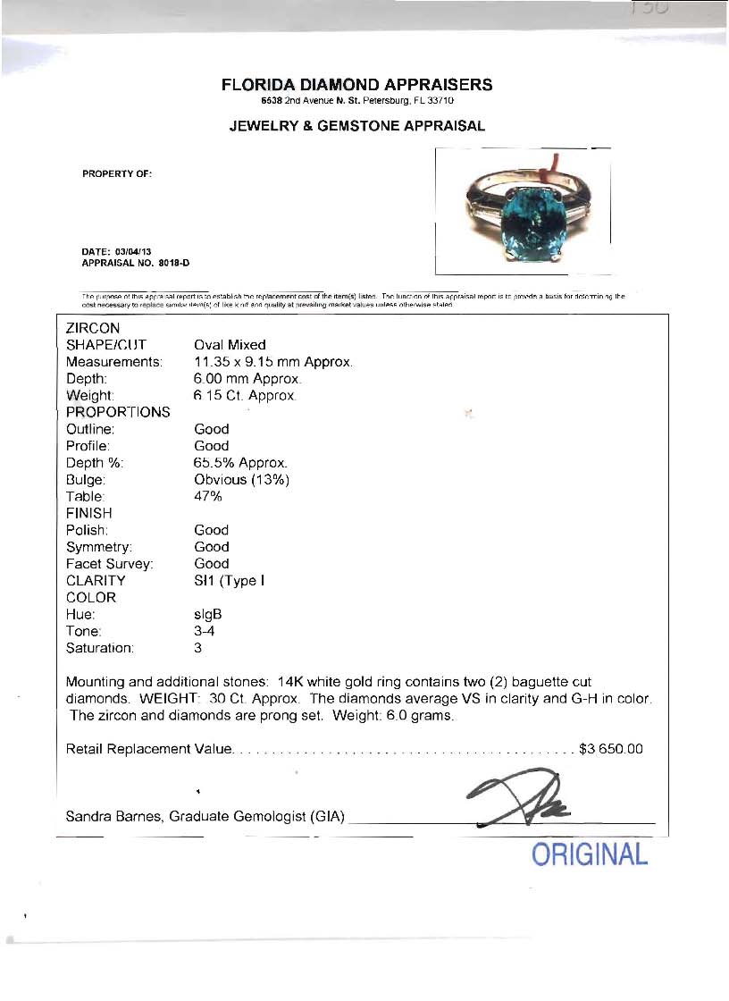 6.15 CT BLUE GREEN ZIRCON AND DIAMOND RING: 14K white gold ring centering an approx. 6.15 Ct oval mixed cut zircon, rated SI1 in clarity, 3 in saturation. The 2 baguette cut diamonds total approx. .30 Ct., VS clarity and G-H color. Size 6. Weight: 6 grams. Sold with current Florida Diamond Appraisers GIA graduates appraisal for $3650.