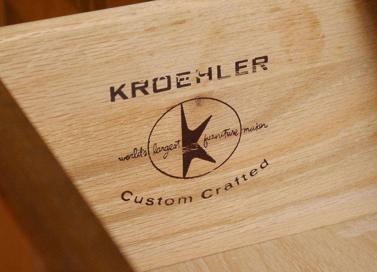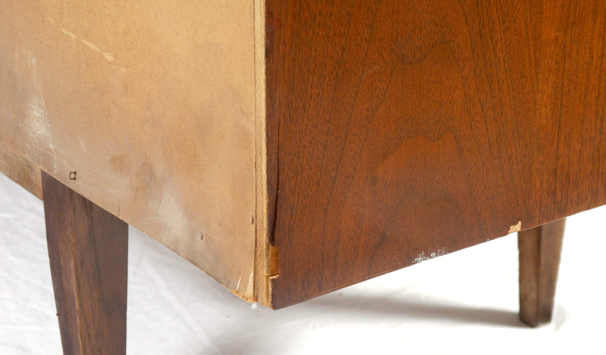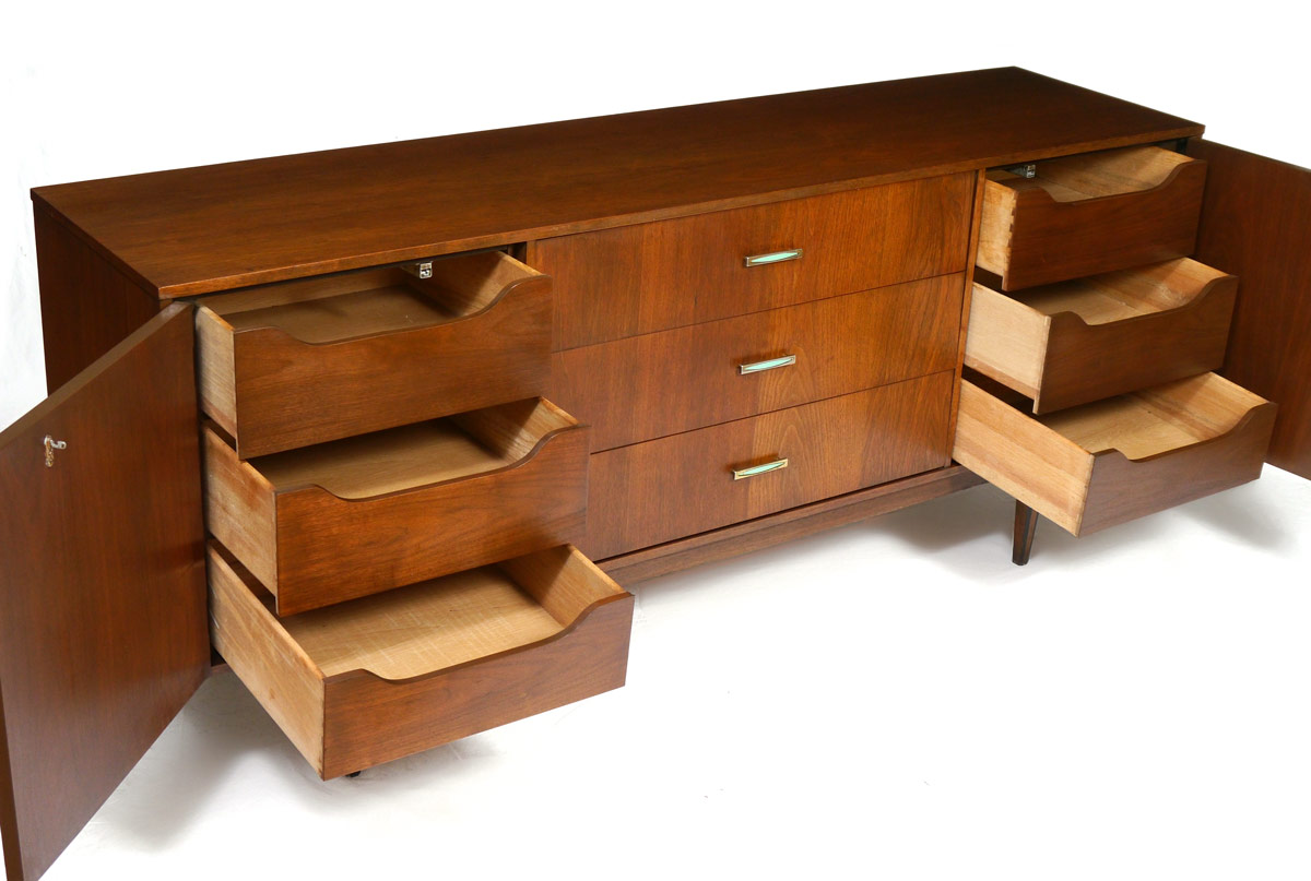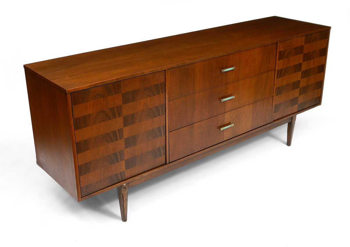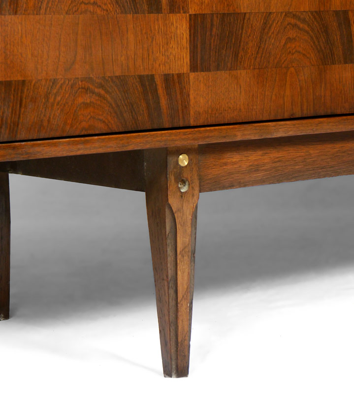 MID CENTURY CREDENZA BUFFET, MEDIA CABINET BY KROEHLER: Rosewood and teak cubist design. Measures approx. 31''h. x 72'' x 18''.