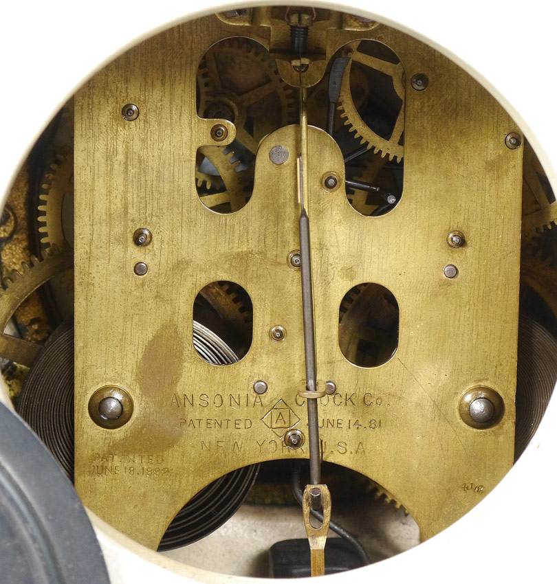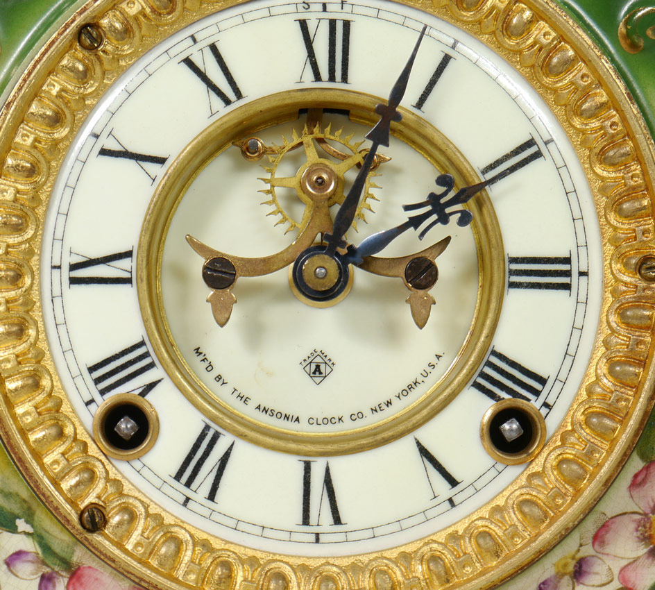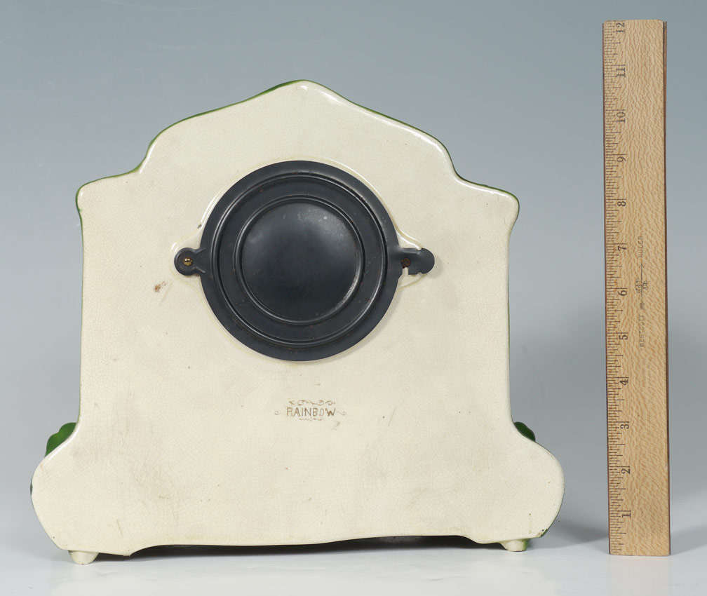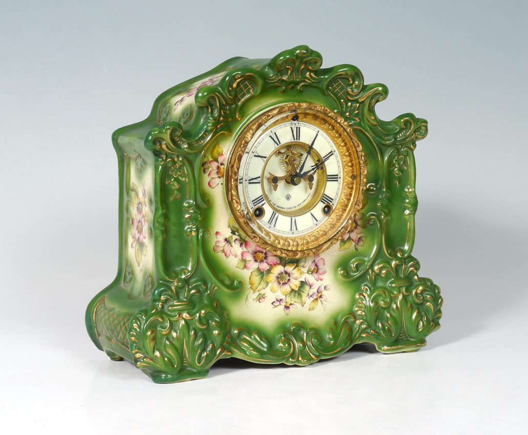 ANSONIA ''RAINBOW'' PORCELAIN CASE MANTLE CLOCK: Porcelain case with green ground, floral and gilt decoration. Marked Rainbow on back. Porcelain dial with Roman numerals, open escapement. Ansonia 8 day time and strike movement. Key and pendulum in office. 11 1/8'' h. x 12 1/2'' x 5''.