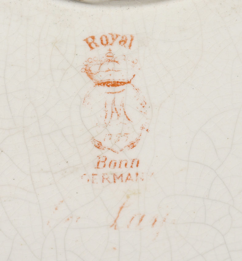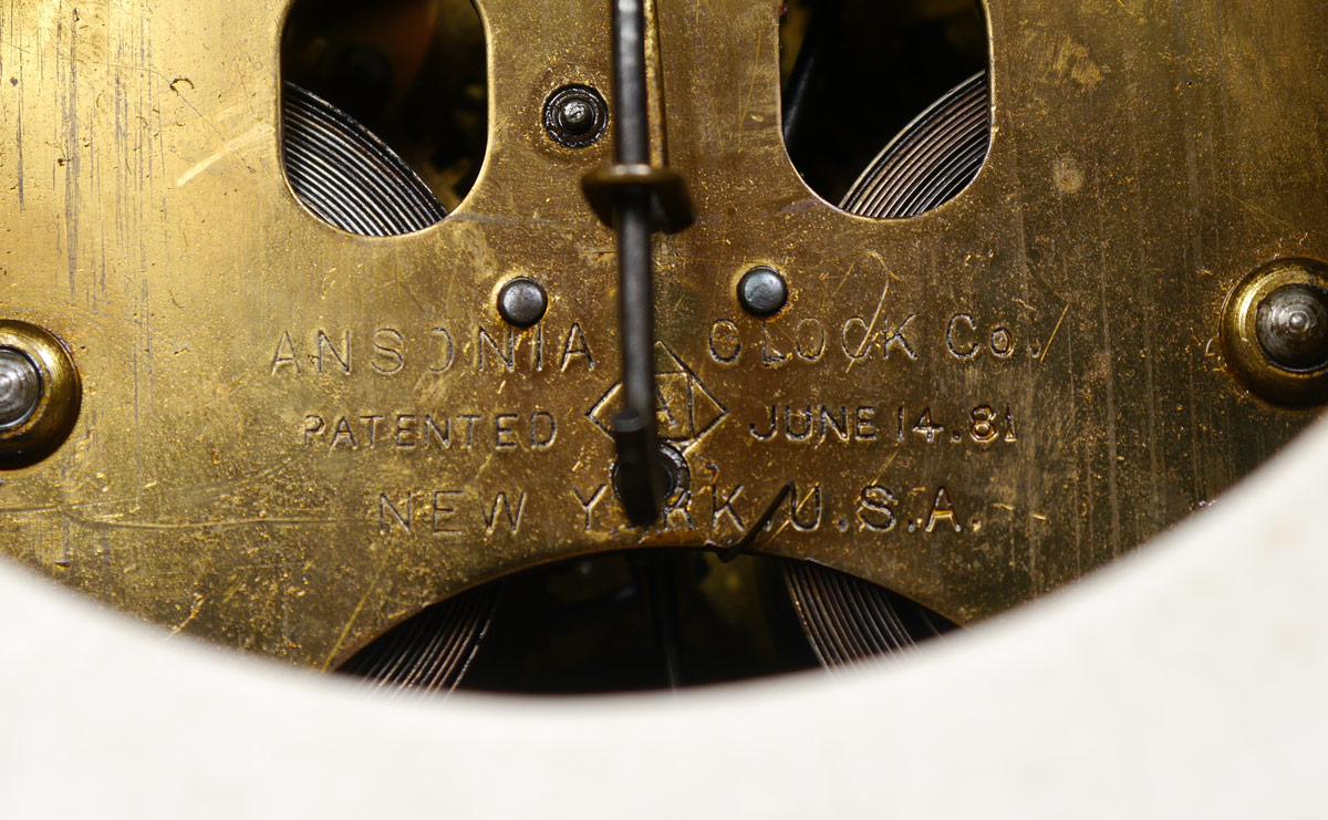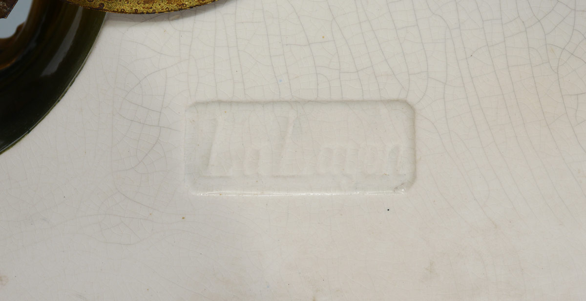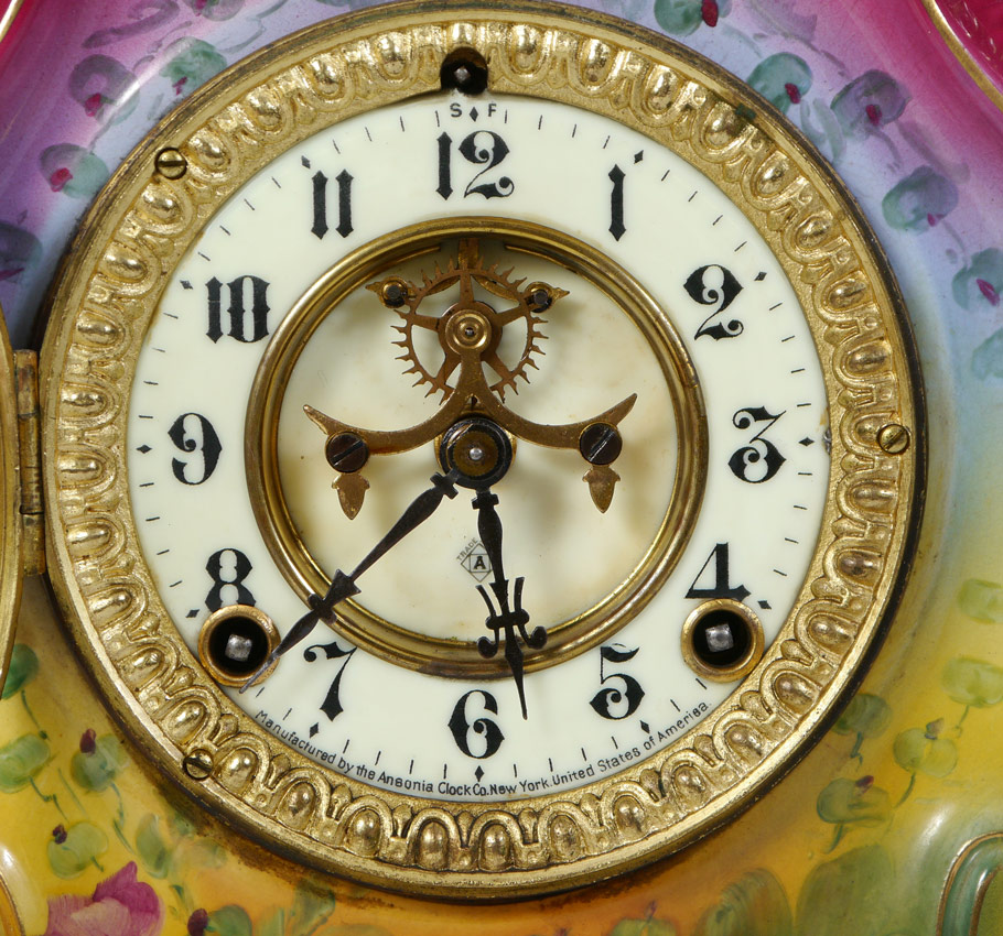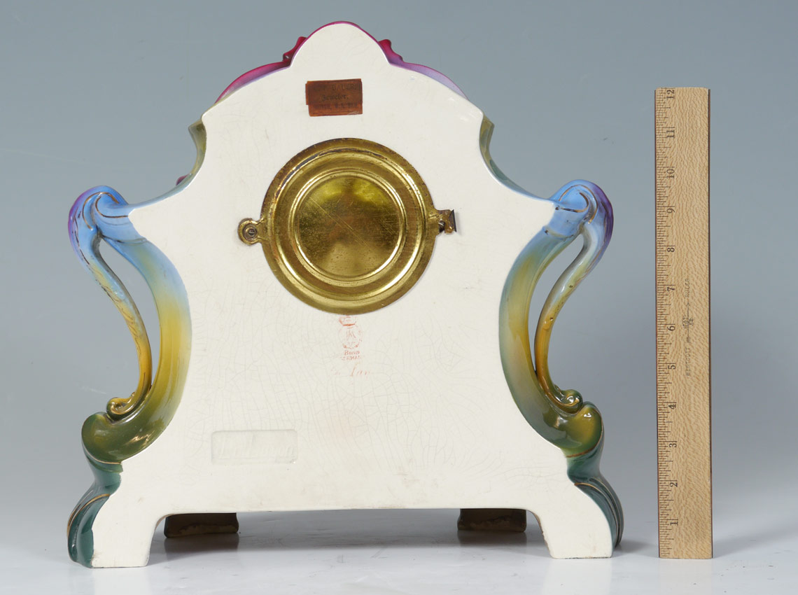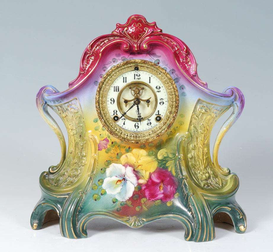 ANSONIA ROYAL BONN ''LA LAYON'' PORCELAIN MANTLE CLOCK: Porcelain case with a rainbow ground and floral motif by Royal Bonn, marked on back with additional ''La Layon'' impressed. Porcelain dial with open escapement and Arabic numerals. Ansonia 8 day time and strike movement. Key and pendulum in office. Old dealers label on back. Measures 14 1/4'' h. x 15 1/4'' x 5 1/4