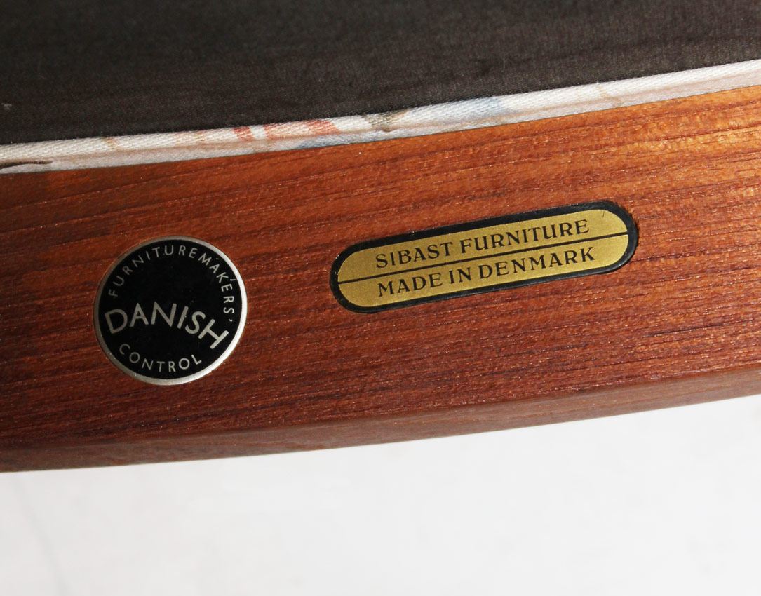 ARNE VODDER FOR SIBAST SET OF 7 DINING CHAIRS: Danish Modern teak spindle back chairs, 2 arm chairs and 5 side chairs. Later fabric on the seats. Danish control button and Sibast Furniture label. Arm chairs are 38 1/2'' x 20 1/4'' x 20 1/4''.