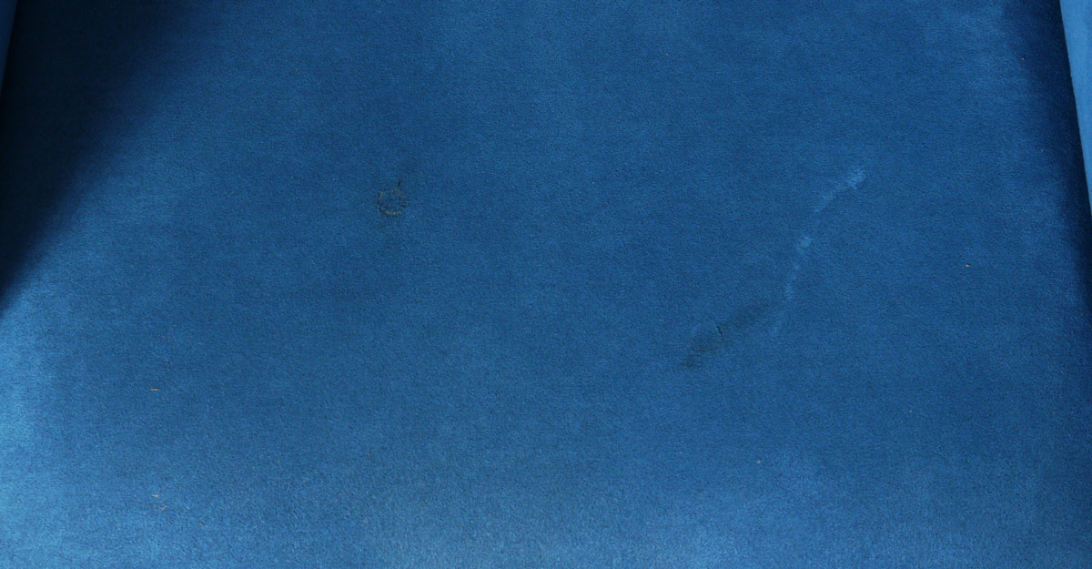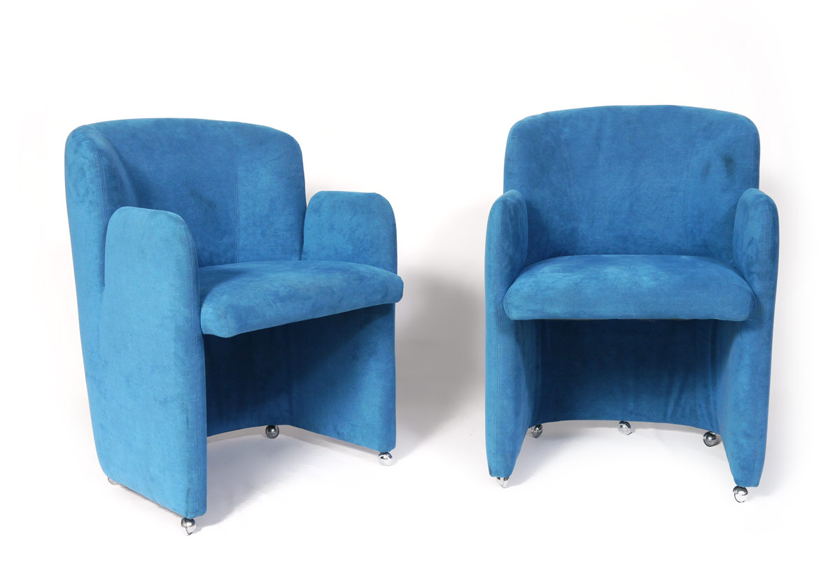 VLADIMIR KAGAN FOR WEIMAN PREVIEW, PAIR BLUE BARREL CHAIRS: Attribution. Measure approx. 33'' t x 25'' d x 24'' w.