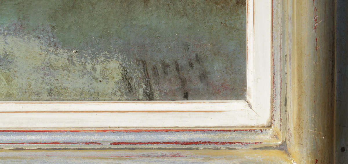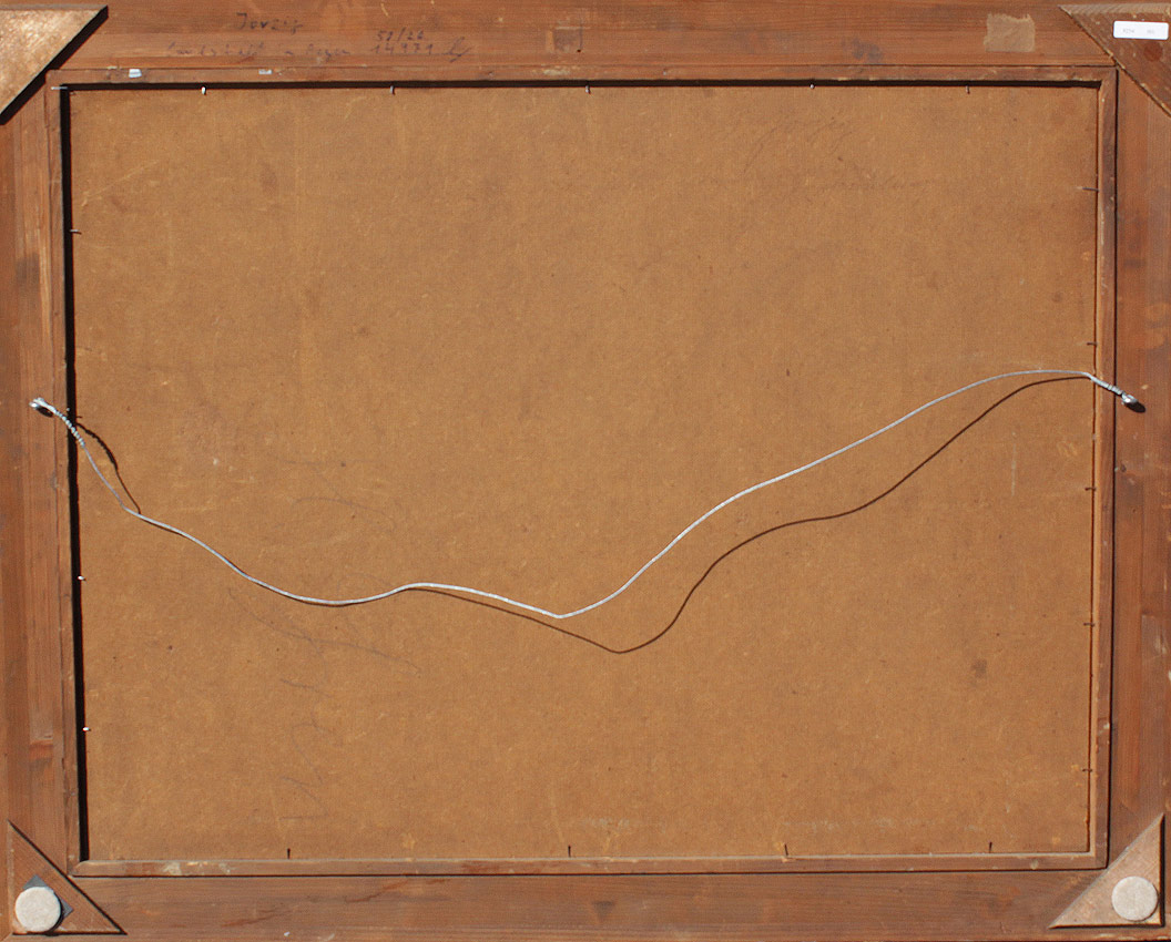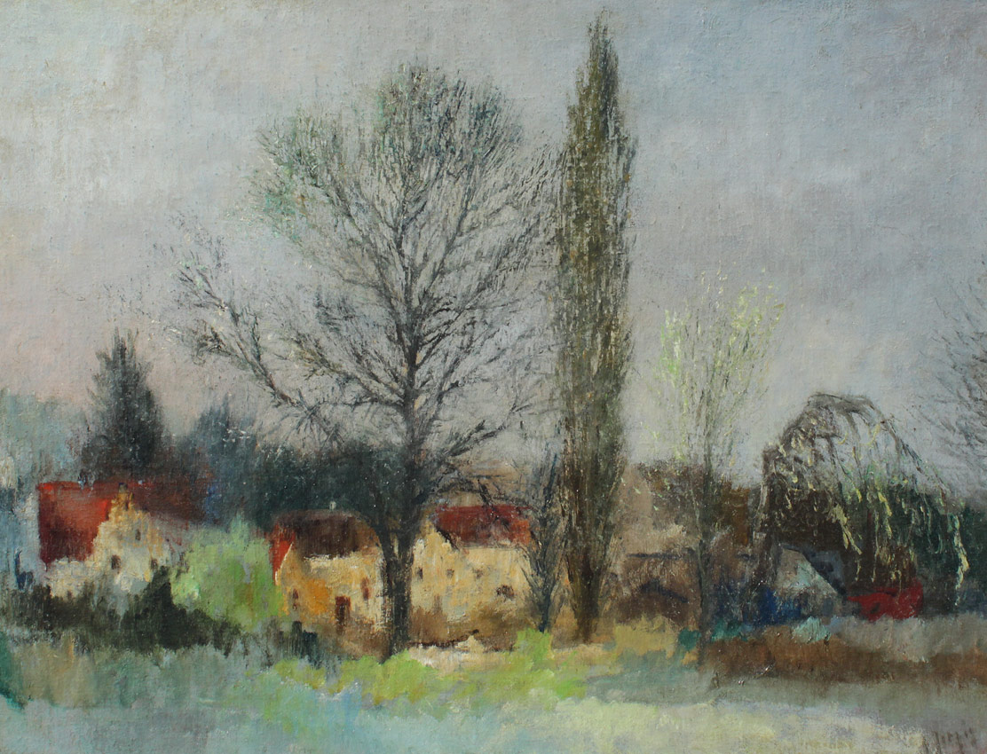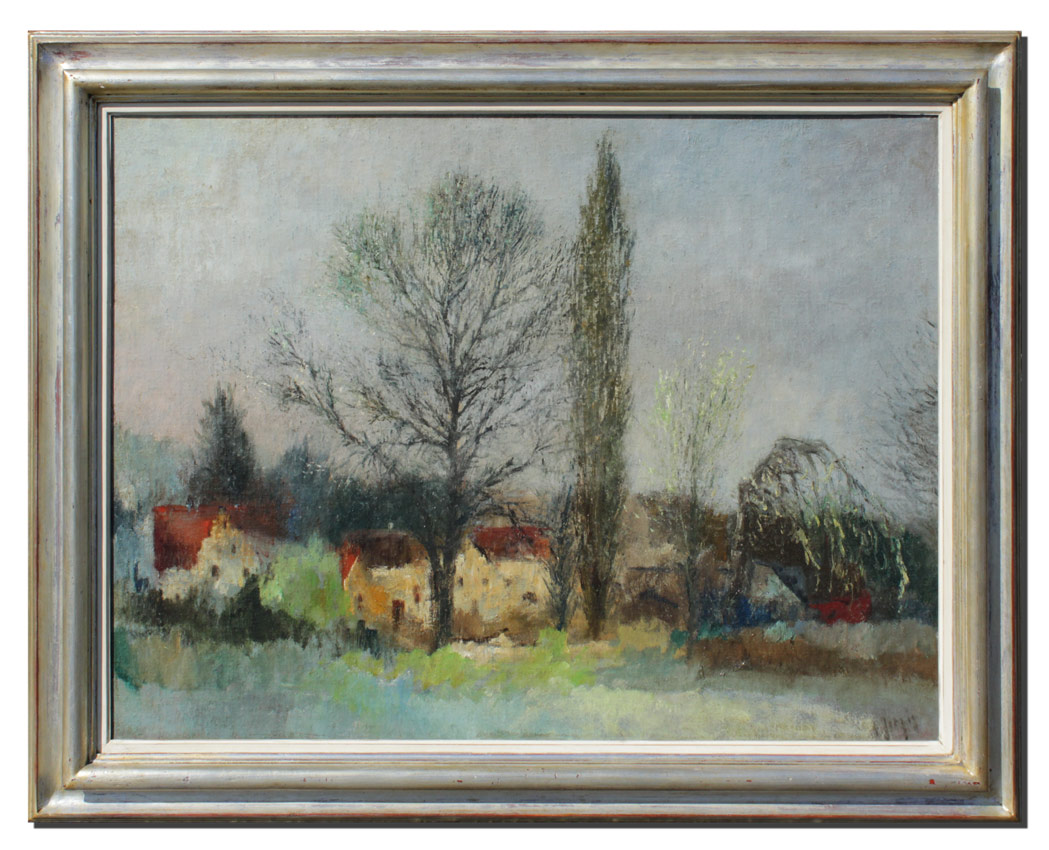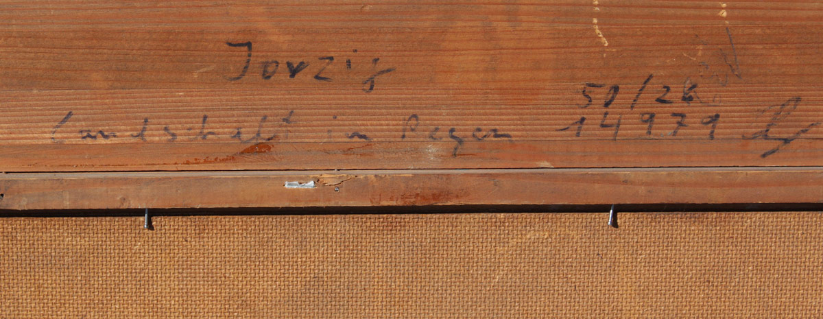 JORZIG, Ewald, (German, 1905-1983): Village Landscape through the Trees, Oil/Masonite, 26'' x 34'', illegibly titled verso Landschaft I.M. Pegen?, signed lower right, silver gilt frame with minor wear, 32 1/2'' x 40 1/2''.