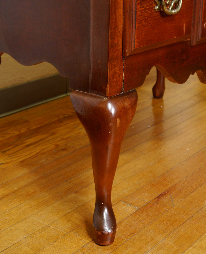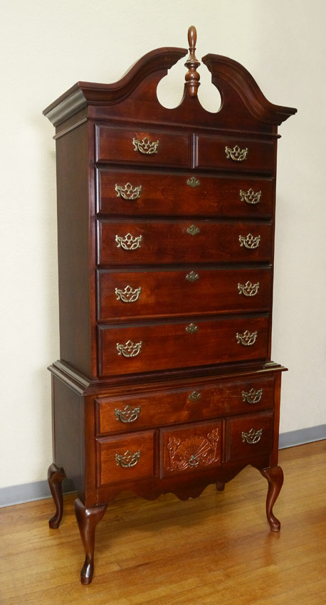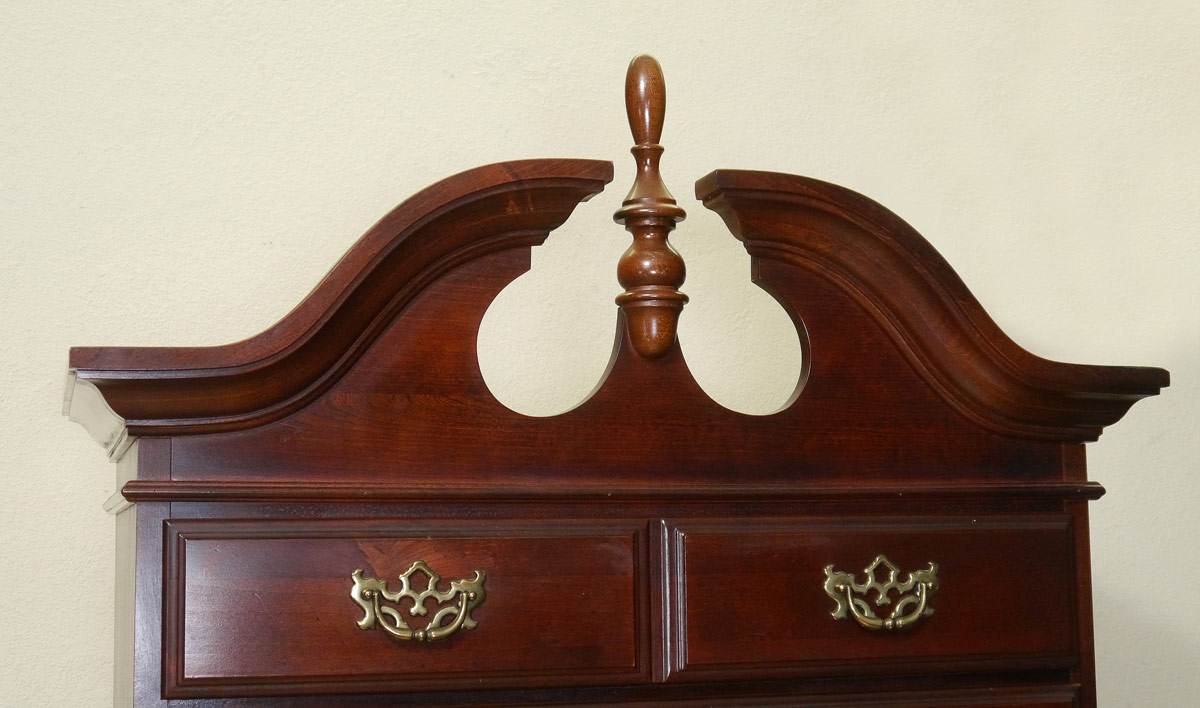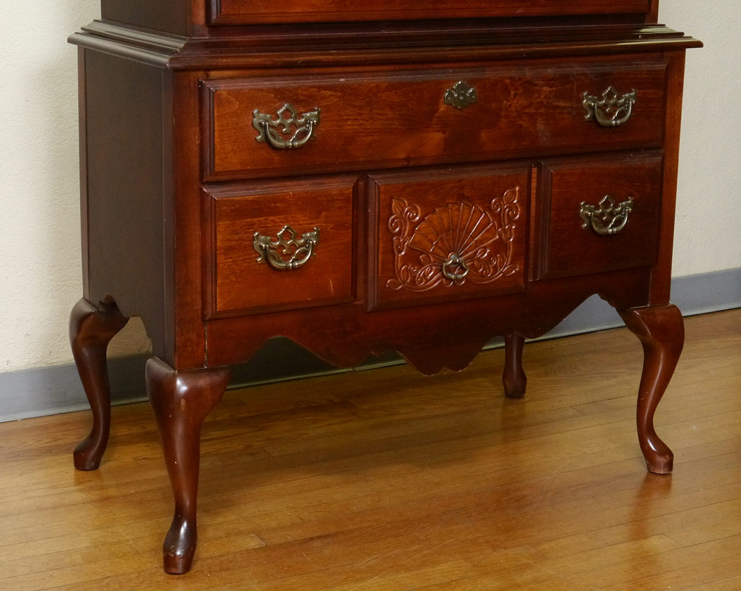 AMERICAN DREW HIGH BOY: Queen Ann Style chest on stand, cherry stained. 85 1/2'' h x. 39'' x 20 1/4''.