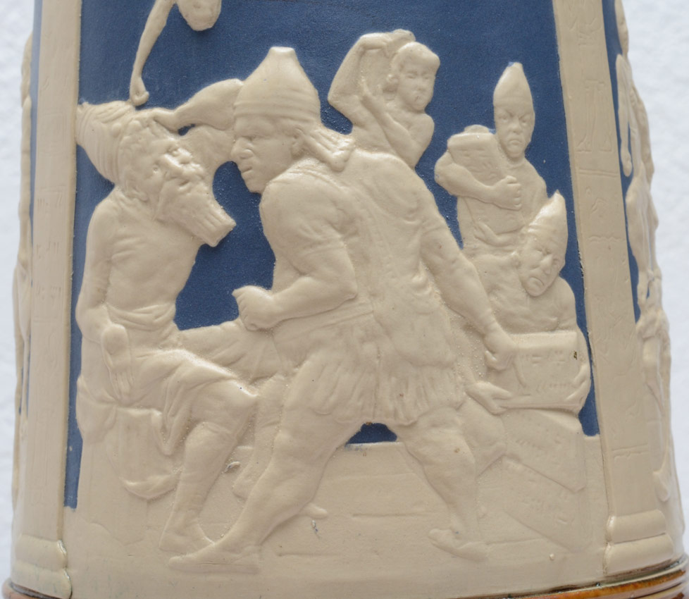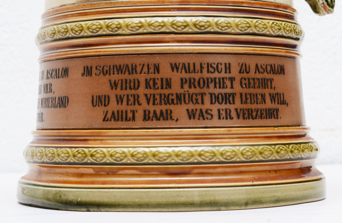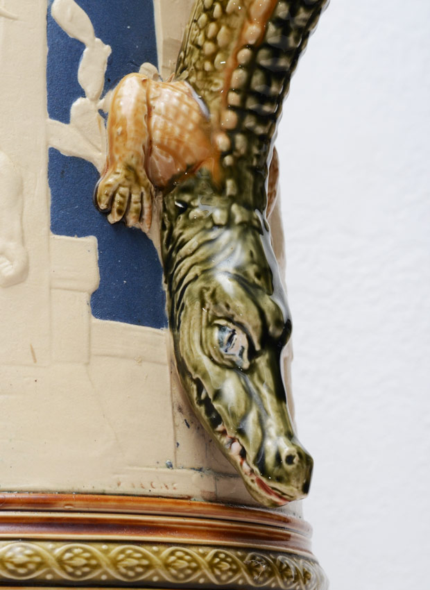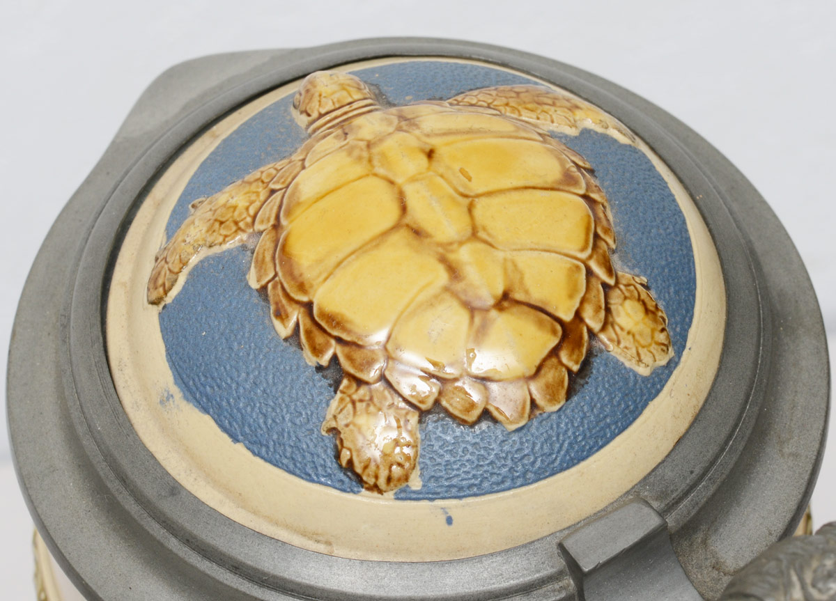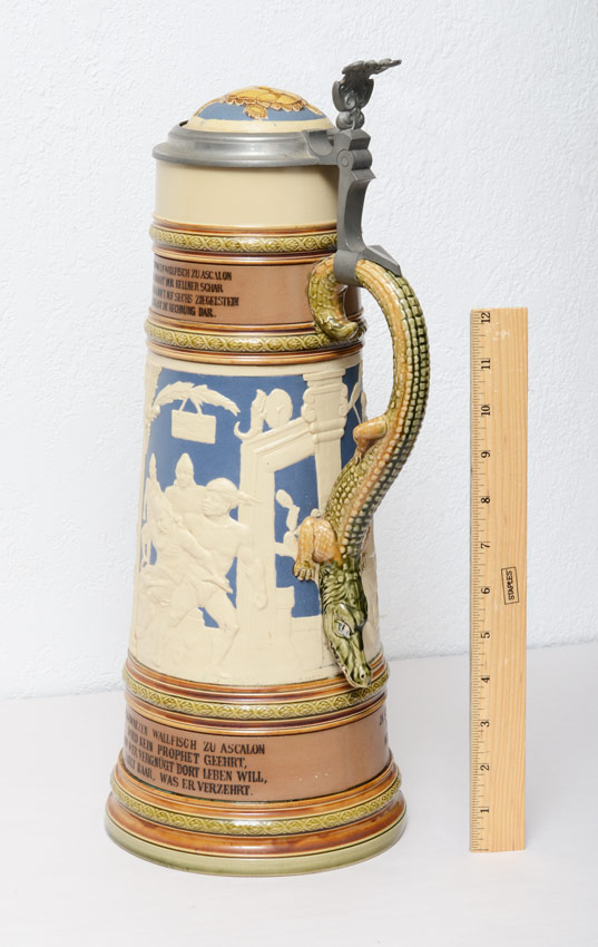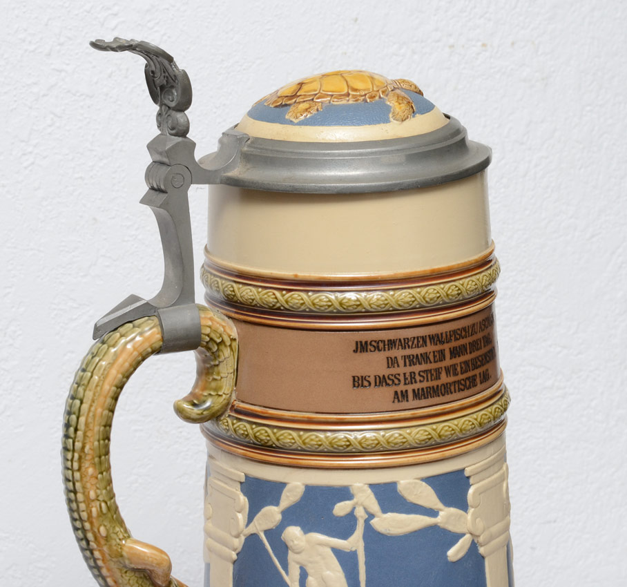ALLIGATOR HANDLE METTLACH STEIN #2194: 3 Liter stein, hinged lid with turtle motif, body with African outdoor scene and German verses, alligator handle. Impressed marks on base. 17 1/2'' h. x 8''.